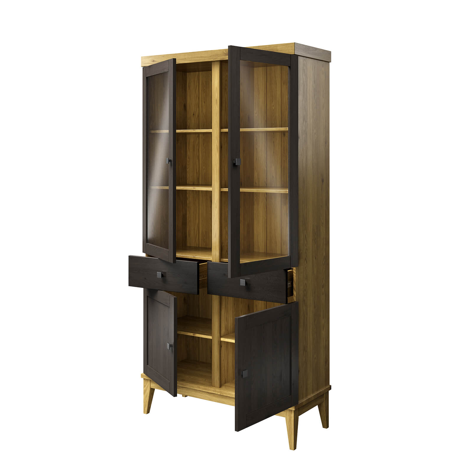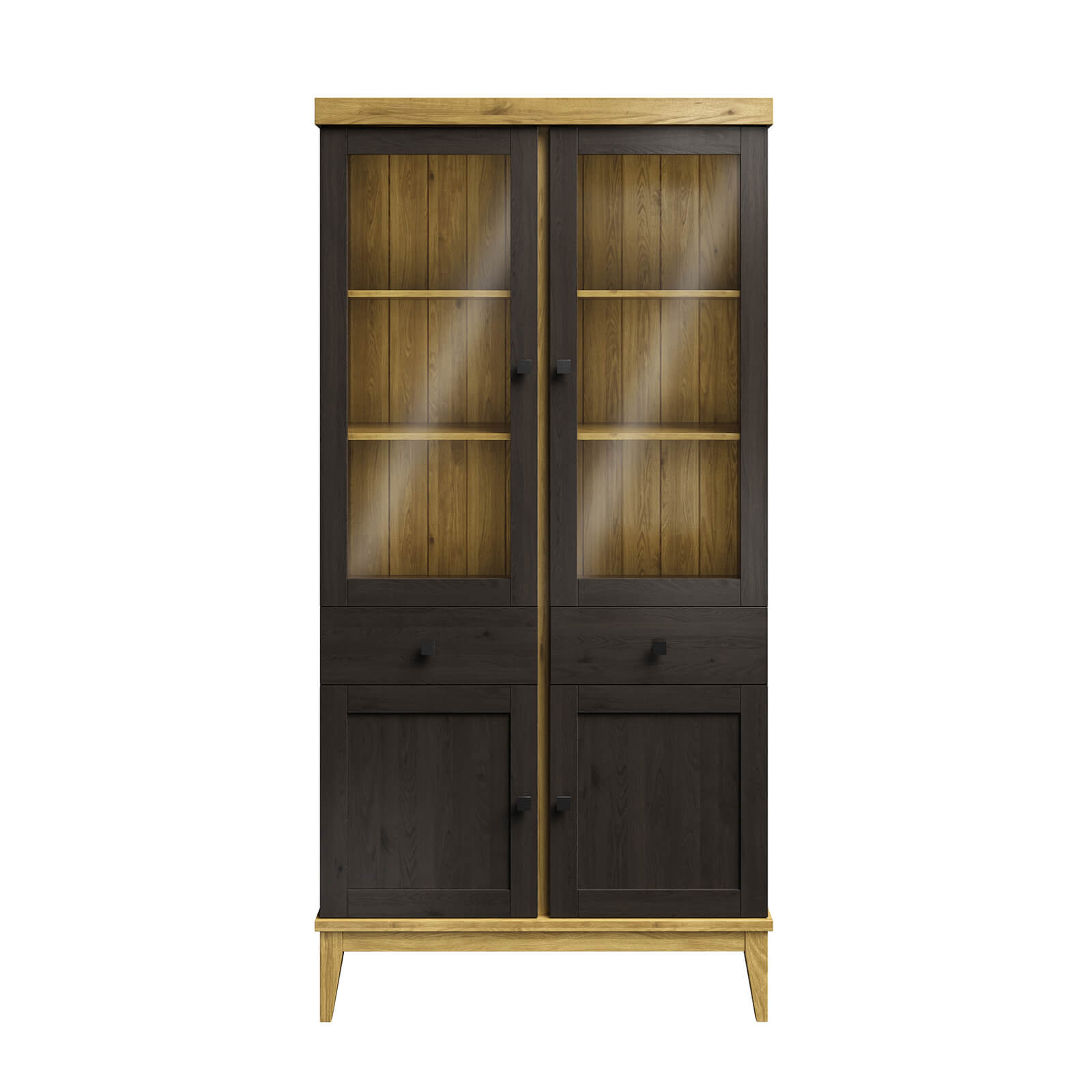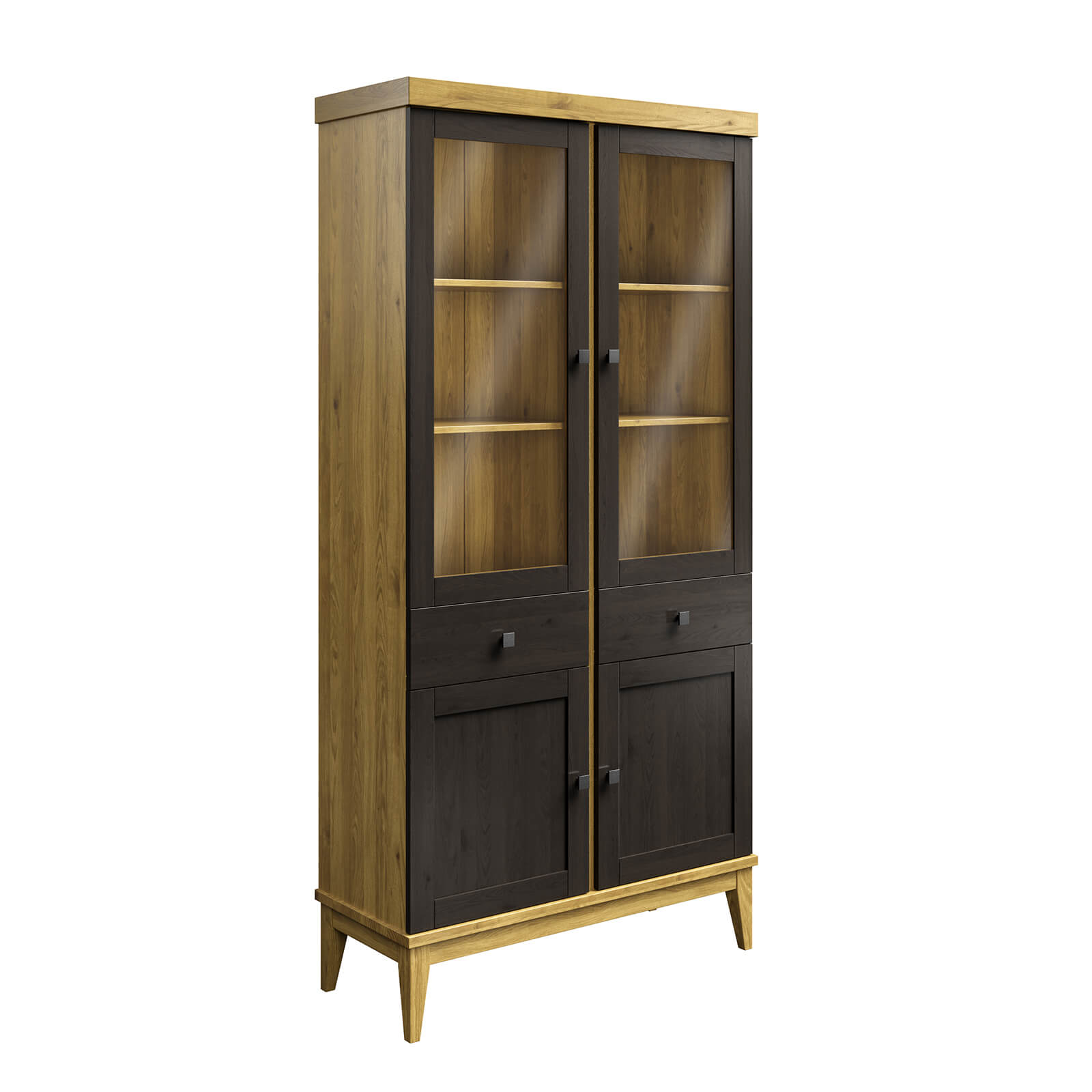 Верхняя часть две стеклянные дверцы с 2 полками . Верхняя и нижняя полки перемещаются по высоте