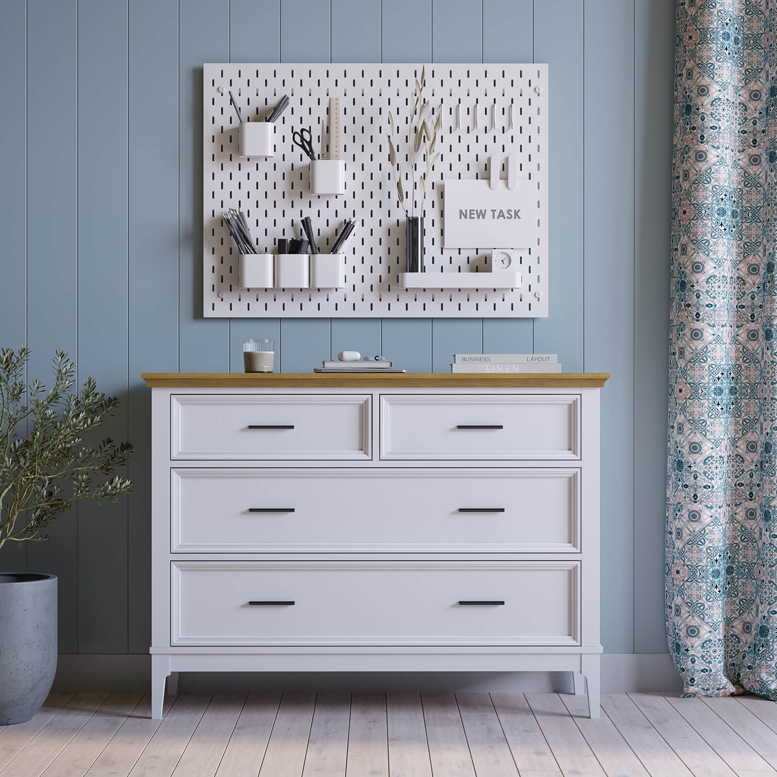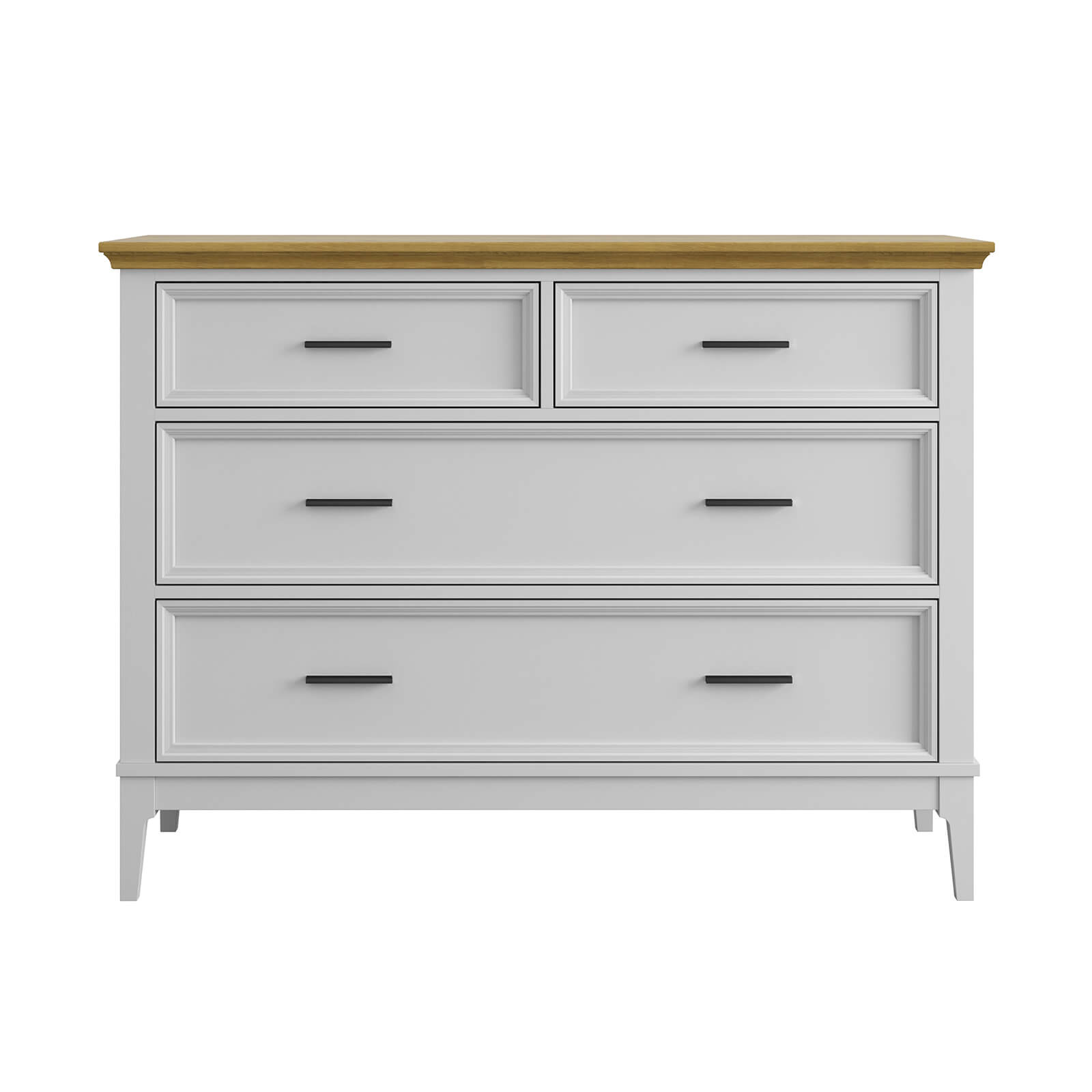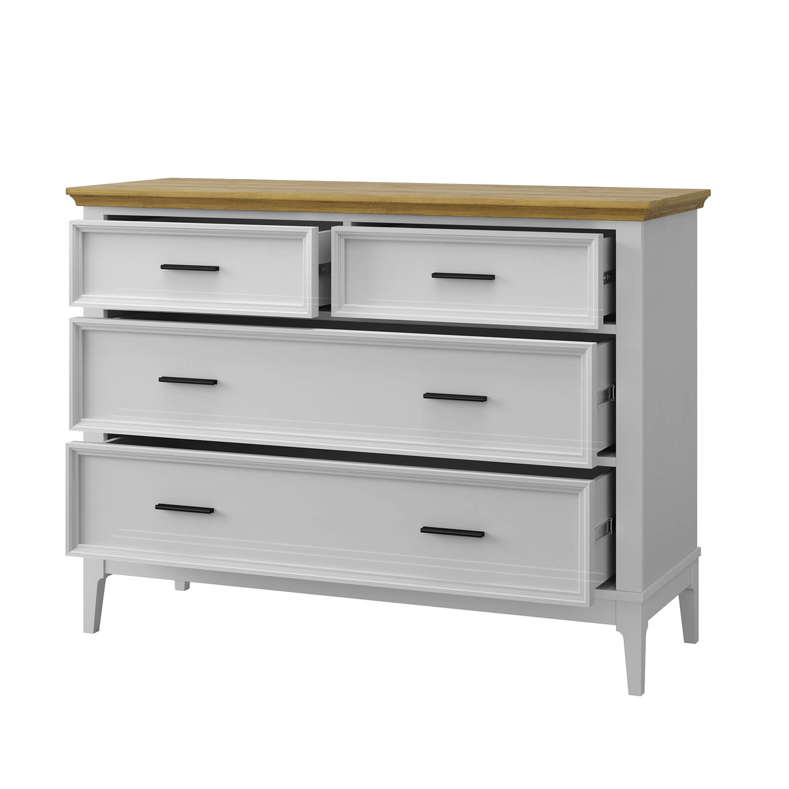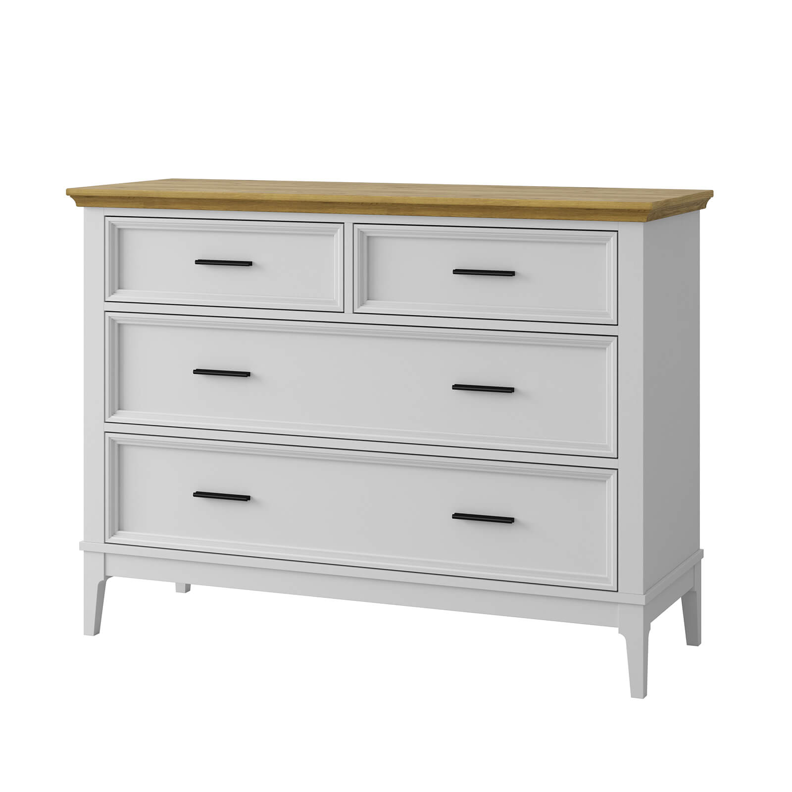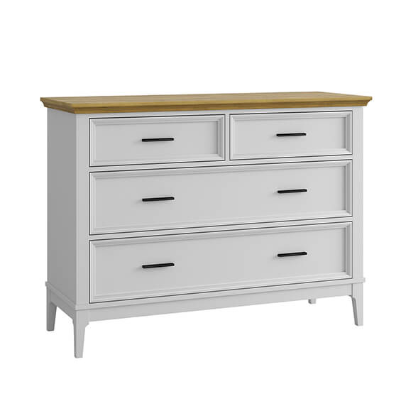 Комод Квадро-С 04 Белый лак + антик №24 массив сосны. Два узких сверху и два широких ящика на шариковых телескопических направляющих.