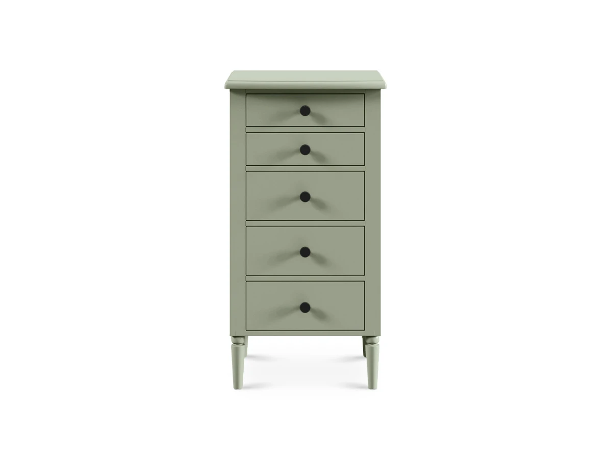 Коллекция Music — респектабельная мебель с классической основой. Обладает притягательной энергетикой изящных форм, поэтичного черного цвета и безупречным исполнением. Комоды, тумбы, банкетки, консольные и журнальные столики подходят для оформления гостиной, спальни, прихожей, мастерской, студии, бьюти-зоны. Идеально вписывается в стилистику неоклассики, арт-деко, минимализма, эклектики. Лейтмотив коллекции — барочные элементы: фигурные ножки из массива дерева, каретная стяжка «капитоне», акцентные детали в бронзовом и золотистом цвете. Изделия подчеркнут в интерьере смелость, выразительность, спокойствие. Они надежно сохранят ваши секреты, помогут разложить вещи по местам и поддержат настроение «тихой роскоши». Могут выступать на контрасте с главенствующим светлым оттенком или быть частью ненавязчивого темного фона. Комод имеет 5 выдвижных ящиков. Рекомендуется крепить к стене. Ручки включены в стоимость. RAL DESIGN 120 60 10 Gloss 20 «Зеленые листья лаванды».
