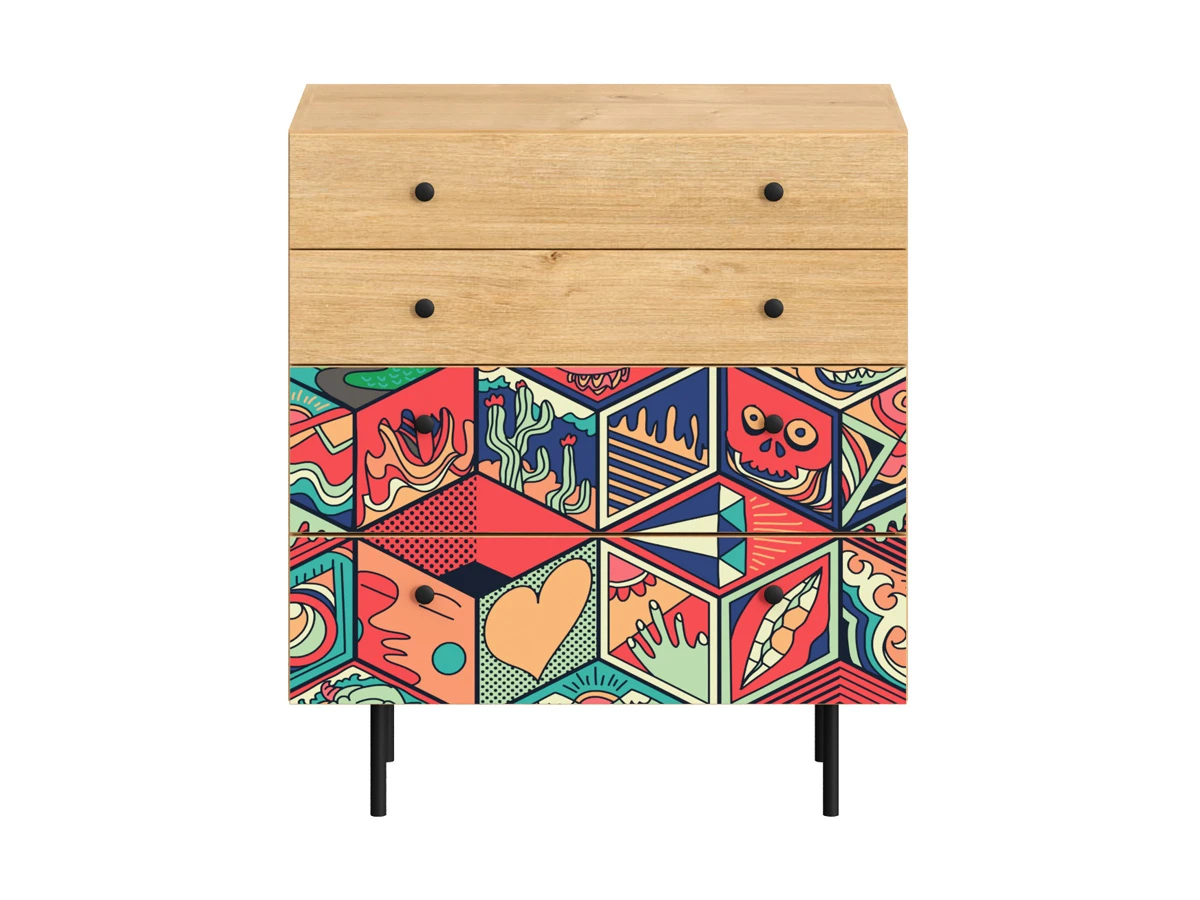 Корпусная мебель, с которой можно составить множество решений для гостиной, детской, кухни, спальни, прихожей, рабочей зоны. Комоды, шкафы, тумбы, столы, витрины, полки, серванты характеризуются универсальностью, многозадачностью, надёжными устойчивыми конструкциями. Имеют выразительный внешний вид, вдохновленный направлением ретро. Смотрятся легко и воздушно за счет деревянных ножек, минимального количества декоративных элементов, спокойных природных оттенков. Их можно использовать в качестве систем хранения, элементов для зонирования, фокусных точек. В дизайне ярко выражена доминанта прямых форм, графичности, лаконичных линий и элегантного исполнения. Что даёт пространству ощущение размеренности, сбалансированности, упорядоченности. Подходят интерьерам как с нейтральной базой, так и локациям с интенсивными цветовыми блоками. Индивидуальности добавят модели с оригинальными паттернами на фасадах. Предметы коллекции Frida гармонично впишутся в эклектичные и стилизованные интерьеры. Ручки входят в стоимость изделия. Высота опор 160 мм. Изображение, нанесенное на фасады, устойчиво к выцветанию, истиранию и влаге. Однако длительное воздействие воды, различных растворителей, спиртосодержащих жидкостей и высоких температур, увеличивают риск повреждения целостности покрытия. Поэтому при использовании необходимо соблюдать ряд правил: 1. Протирайте поверхность с рисунком влажной (но не мокрой) тканью. 2. Используйте мягкие ткани, например, салфетки для стекла или зеркал. 3. Не используйте для обработки поверхности с нанесенным на нее рисунком чистящие порошки и средства, в состав которых входят ацетон, растворитель или спирт. 4. Не используйте металлические губки и щетки с жесткой щетиной. 5. Избегайте ударов, падения, царапания, трения изделий с фотопечатью.