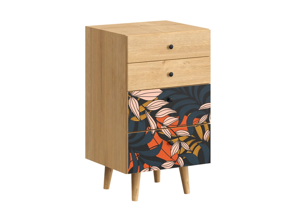 Корпусная мебель, с которой можно составить множество решений для гостиной, детской, кухни, спальни, прихожей, рабочей зоны. Комоды, шкафы, тумбы, столы, витрины, полки, серванты характеризуются универсальностью, многозадачностью, надёжными устойчивыми конструкциями. Имеют выразительный внешний вид, вдохновленный направлением ретро. Смотрятся легко и воздушно за счет деревянных ножек, минимального количества декоративных элементов, спокойных природных оттенков. Их можно использовать в качестве систем хранения, элементов для зонирования, фокусных точек. В дизайне ярко выражена доминанта прямых форм, графичности, лаконичных линий и элегантного исполнения. Что даёт пространству ощущение размеренности, сбалансированности, упорядоченности. Подходят интерьерам как с нейтральной базой, так и локациям с интенсивными цветовыми блоками. Индивидуальности добавят модели с оригинальными паттернами на фасадах. Предметы коллекции Frida гармонично впишутся в эклектичные и стилизованные интерьеры. Ручки входят в стоимость изделия. Высота опор 160 мм. Изображение, нанесенное на фасады, устойчиво к выцветанию, истиранию и влаге. Однако длительное воздействие воды, различных растворителей, спиртосодержащих жидкостей и высоких температур, увеличивают риск повреждения целостности покрытия. Поэтому при использовании необходимо соблюдать ряд правил: 1. Протирайте поверхность с рисунком влажной (но не мокрой) тканью. 2. Используйте мягкие ткани, например, салфетки для стекла или зеркал. 3. Не используйте для обработки поверхности с нанесенным на нее рисунком чистящие порошки и средства, в состав которых входят ацетон, растворитель или спирт. 4. Не используйте металлические губки и щетки с жесткой щетиной. 5. Избегайте ударов, падения, царапания, трения изделий с фотопечатью.