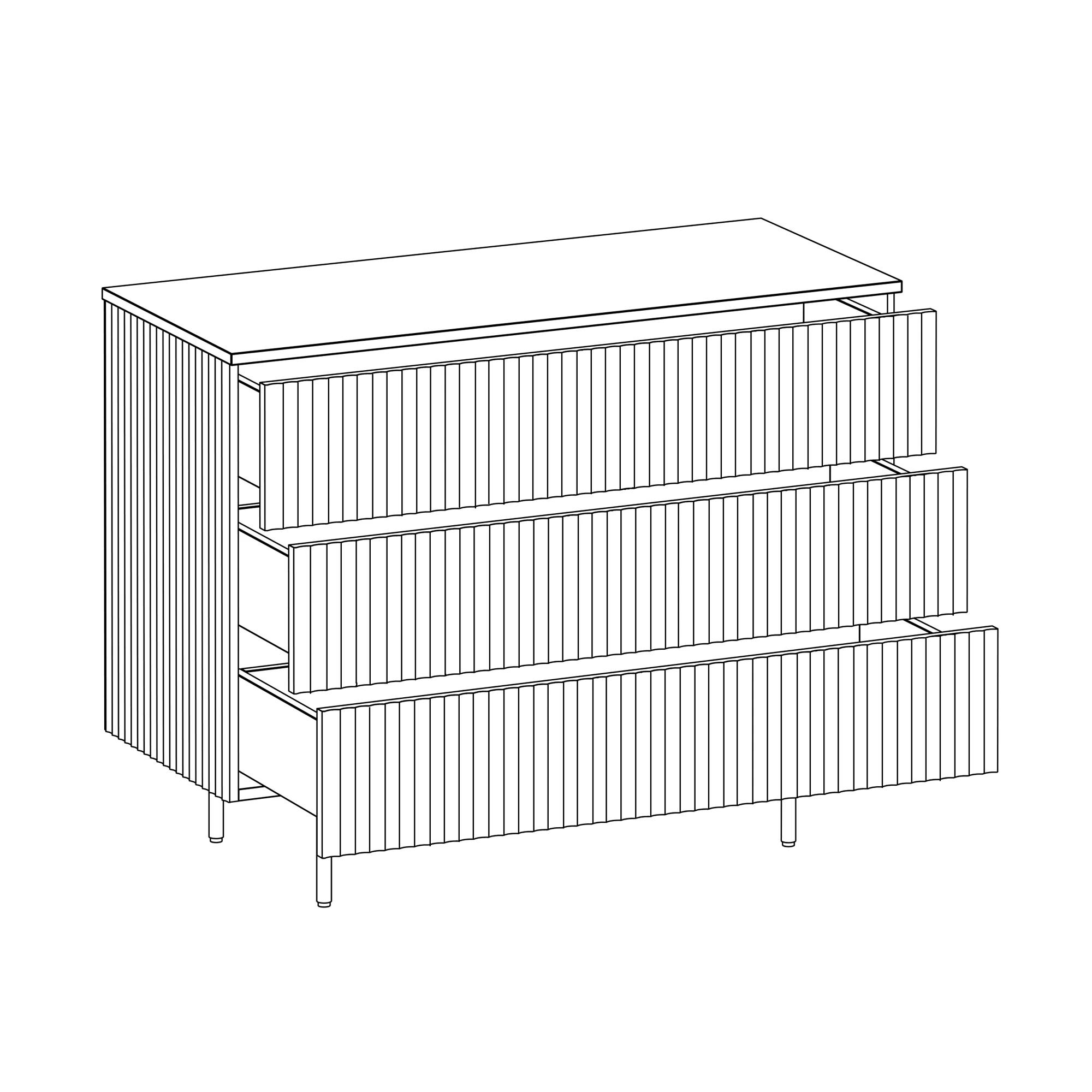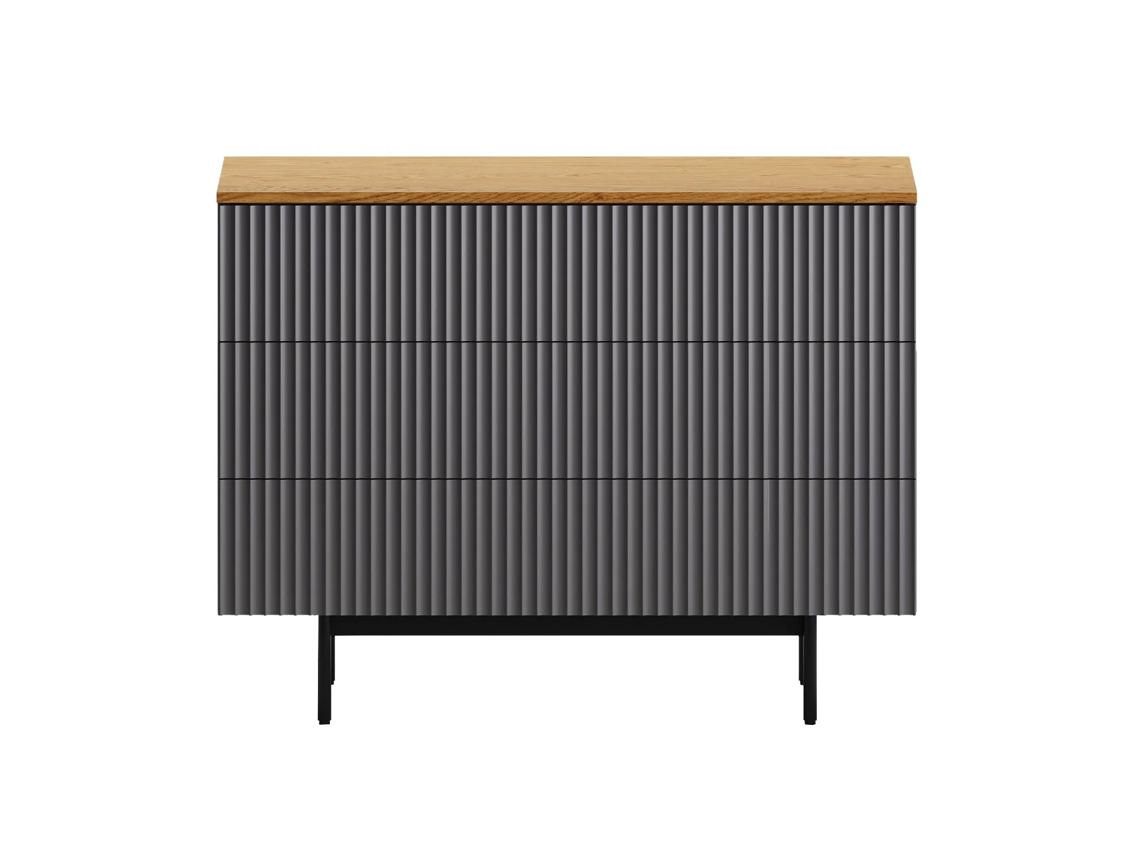Коллекция Mikko — комплексная система хранения, разработанная для комфортного и актуального интерьера. Вы можете комбинировать различные предметы коллекции или использовать их отдельно. Лаконичный и выразительный внешний вид шкафов, тумб, сервантов, комодов стильно дружит с разными интерьерными решениями. Идея дизайна — баланс индустриального характера и органичных элементов. Мебель сочетает в себе прочное металлическое основание, крышку с дубовым шпоном и рельефный фасад с фрезеровкой. Дверцы и ящики открываются легким нажатием. Отсутствие фурнитуры придает моделям аккуратность и ритмичность. Используйте их для хранения книг, техники в гостиной, одежды и текстиля в спальне, важных мелочей в прихожей, документов и канцелярии в рабочей зоне, декоративных вещей в творческой локации. Можете выбрать цвет крышки: светлый или темный. С мебелью Mikko вы грамотно спрячете лишнее и эстетично экспонируете нужное. Комод Mikko c 3-мя ящиками ящиками на скрытых направляющих. Дно ящиков из ЛДСтП 16мм. Фасад и боковые стенки коллекции Mikko с фрезеровкой выполнены из МДФ толщиной 18 мм. в четырех вариантах декоров: Софт Сантьяго, Шарли Терракота, Шарли Грин, Графит. Крышка из МДФ толщиной 16 мм., облицованной строганным шпоном дуба. Остальные детали корпусов выполнены из плиты ламинированной толщиной 16 мм., декор белый гладкий. Лицевая фурнитура отсутствует, открывание фасадов по принципу нажал - открыл. Основания изделий металлические черного цвета с регулируемыми пластиковыми подпятниками.