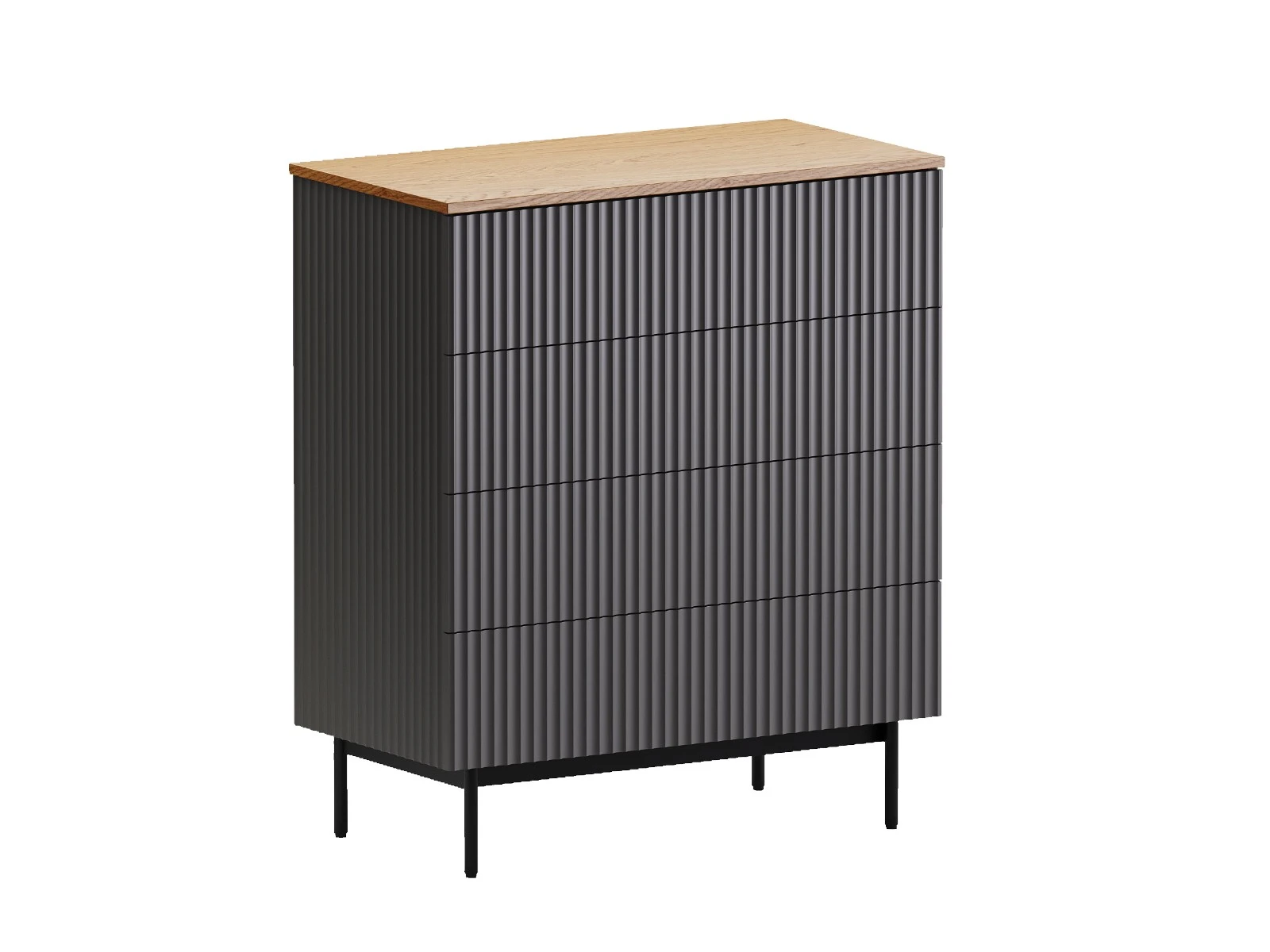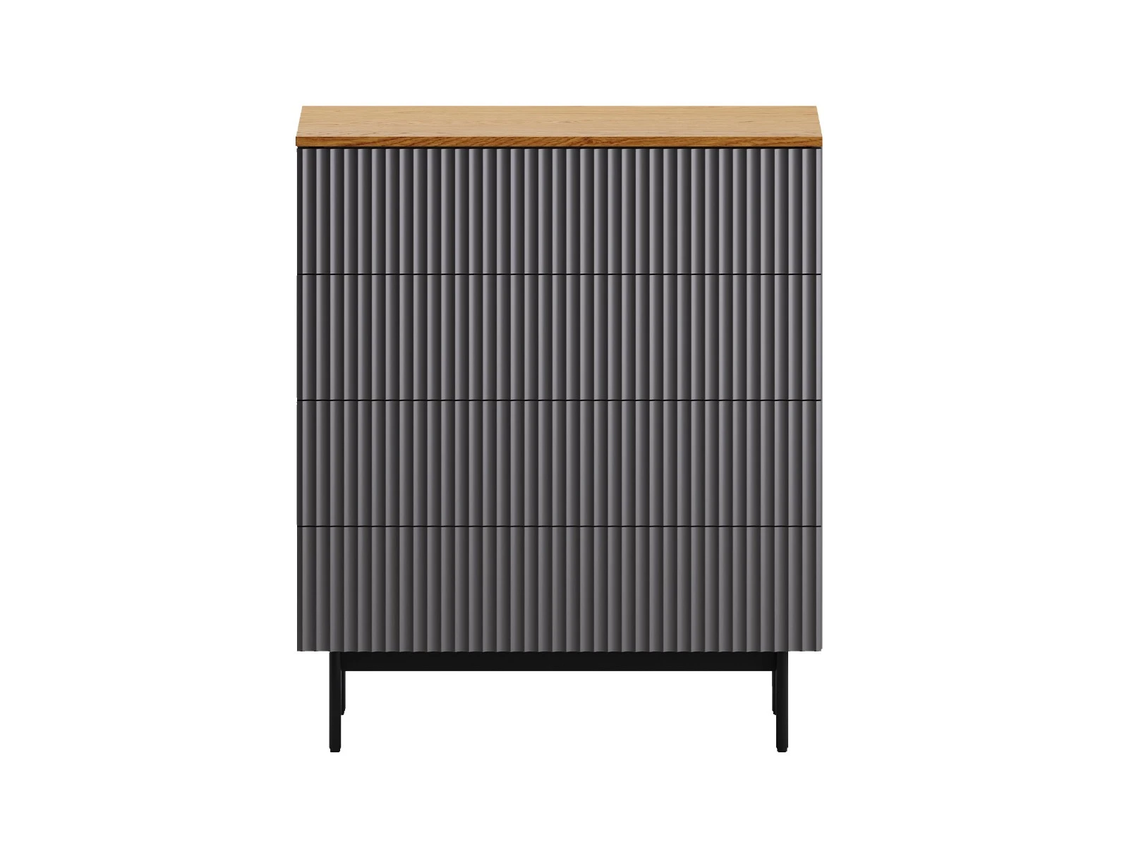 Коллекция Mikko — комплексная система хранения, разработанная для комфортного и актуального интерьера. Вы можете комбинировать различные предметы коллекции или использовать их отдельно. Лаконичный и выразительный внешний вид шкафов, тумб, сервантов, комодов стильно дружит с разными интерьерными решениями. Идея дизайна — баланс индустриального характера и органичных элементов. Мебель сочетает в себе прочное металлическое основание, крышку с дубовым шпоном и рельефный фасад с фрезеровкой. Дверцы и ящики открываются легким нажатием. Отсутствие фурнитуры придает моделям аккуратность и ритмичность. Используйте их для хранения книг, техники в гостиной, одежды и текстиля в спальне, важных мелочей в прихожей, документов и канцелярии в рабочей зоне, декоративных вещей в творческой локации. Можете выбрать цвет крышки: светлый или темный. С мебелью Mikko вы грамотно спрячете лишнее и эстетично экспонируете нужное. Комод Mikko с 4-мя ящиками на скрытых направляющих. Дно ящиков из ЛДСтП 16мм. Фасад и боковые стенки коллекции Mikko с фрезеровкой выполнены из МДФ толщиной 18 мм. в четырех вариантах декоров: Софт Сантьяго, Шарли Терракота, Шарли Грин, Графит. Крышка из МДФ толщиной 16 мм., облицованной строганным шпоном дуба. Остальные детали корпусов выполнены из плиты ламинированной толщиной 16 мм., декор белый гладкий. Лицевая фурнитура отсутствует, открывание фасадов по принципу нажал - открыл. Основания изделий металлические черного цвета с регулируемыми пластиковыми подпятниками.