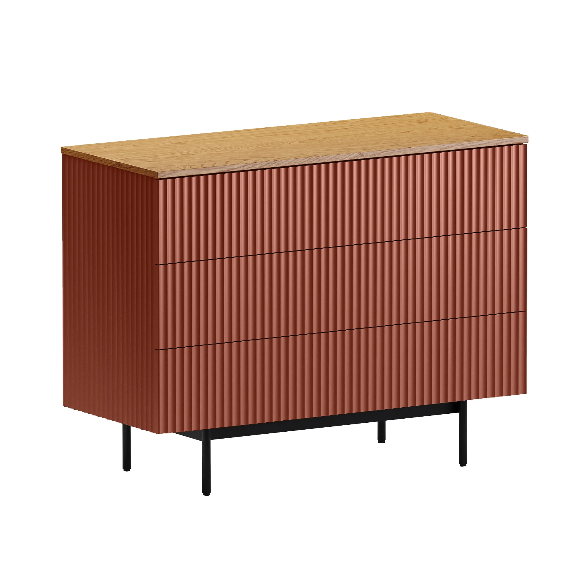 Коллекция Mikko — комплексная система хранения, разработанная для комфортного и актуального интерьера. Вы можете комбинировать различные предметы коллекции или использовать их отдельно. Лаконичный и выразительный внешний вид шкафов, тумб, сервантов, комодов стильно дружит с разными интерьерными решениями. Идея дизайна — баланс индустриального характера и органичных элементов. Мебель сочетает в себе прочное металлическое основание, крышку с дубовым шпоном и рельефный фасад с фрезеровкой. Дверцы и ящики открываются легким нажатием. Отсутствие фурнитуры придает моделям аккуратность и ритмичность. Используйте их для хранения книг, техники в гостиной, одежды и текстиля в спальне, важных мелочей в прихожей, документов и канцелярии в рабочей зоне, декоративных вещей в творческой локации. Можете выбрать цвет крышки: светлый или темный. С мебелью Mikko вы грамотно спрячете лишнее и эстетично экспонируете нужное. Комод Mikko c 3-мя ящиками ящиками на скрытых направляющих. Дно ящиков из ЛДСтП 16мм. Фасад и боковые стенки коллекции Mikko с фрезеровкой выполнены из МДФ толщиной 18 мм. в четырех вариантах декоров: Софт Сантьяго, Шарли Терракота, Шарли Грин, Графит. Крышка из МДФ толщиной 16 мм., облицованной строганным шпоном дуба. Остальные детали корпусов выполнены из плиты ламинированной толщиной 16 мм., декор белый гладкий. Лицевая фурнитура отсутствует, открывание фасадов по принципу нажал - открыл. Основания изделий металлические черного цвета с регулируемыми пластиковыми подпятниками.