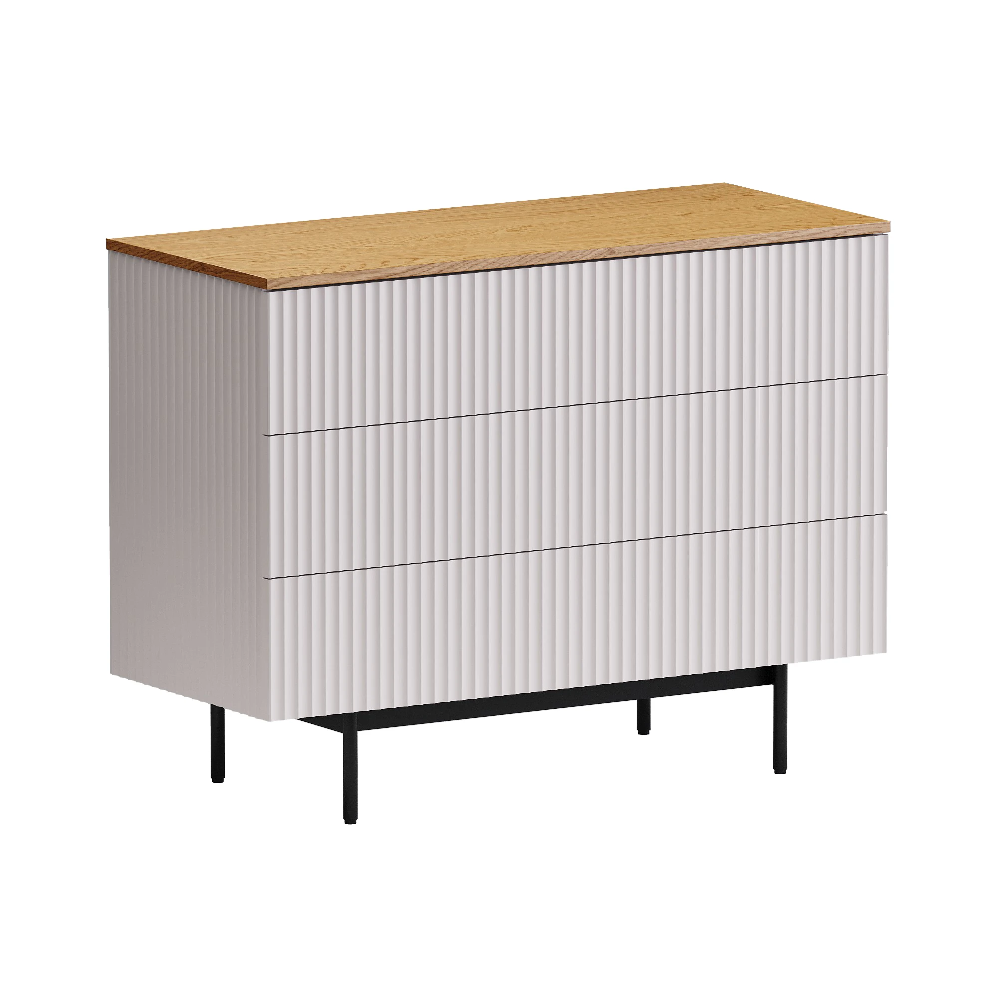 Коллекция Mikko — комплексная система хранения, разработанная для комфортного и актуального интерьера. Вы можете комбинировать различные предметы коллекции или использовать их отдельно. Лаконичный и выразительный внешний вид шкафов, тумб, сервантов, комодов стильно дружит с разными интерьерными решениями. Идея дизайна — баланс индустриального характера и органичных элементов. Мебель сочетает в себе прочное металлическое основание, крышку с дубовым шпоном и рельефный фасад с фрезеровкой. Дверцы и ящики открываются легким нажатием. Отсутствие фурнитуры придает моделям аккуратность и ритмичность. Используйте их для хранения книг, техники в гостиной, одежды и текстиля в спальне, важных мелочей в прихожей, документов и канцелярии в рабочей зоне, декоративных вещей в творческой локации. Можете выбрать цвет крышки: светлый или темный. С мебелью Mikko вы грамотно спрячете лишнее и эстетично экспонируете нужное. Комод Mikko c 3-мя ящиками ящиками на скрытых направляющих. Дно ящиков из ЛДСтП 16мм. Фасад и боковые стенки коллекции Mikko с фрезеровкой выполнены из МДФ толщиной 18 мм. в четырех вариантах декоров: Софт Сантьяго, Шарли Терракота, Шарли Грин, Графит. Крышка из МДФ толщиной 16 мм., облицованной строганным шпоном дуба. Остальные детали корпусов выполнены из плиты ламинированной толщиной 16 мм., декор белый гладкий. Лицевая фурнитура отсутствует, открывание фасадов по принципу нажал - открыл. Основания изделий металлические черного цвета с регулируемыми пластиковыми подпятниками.
