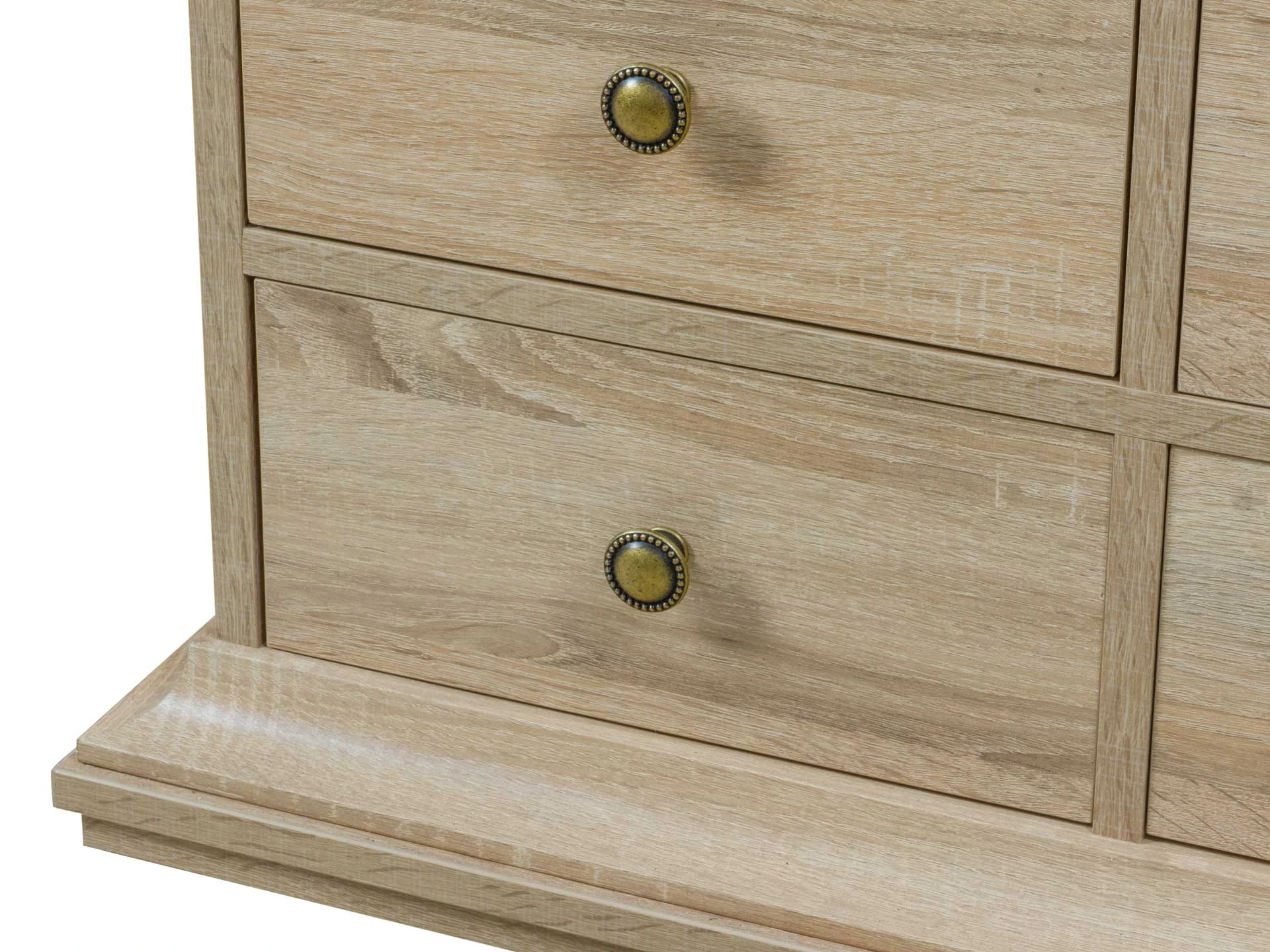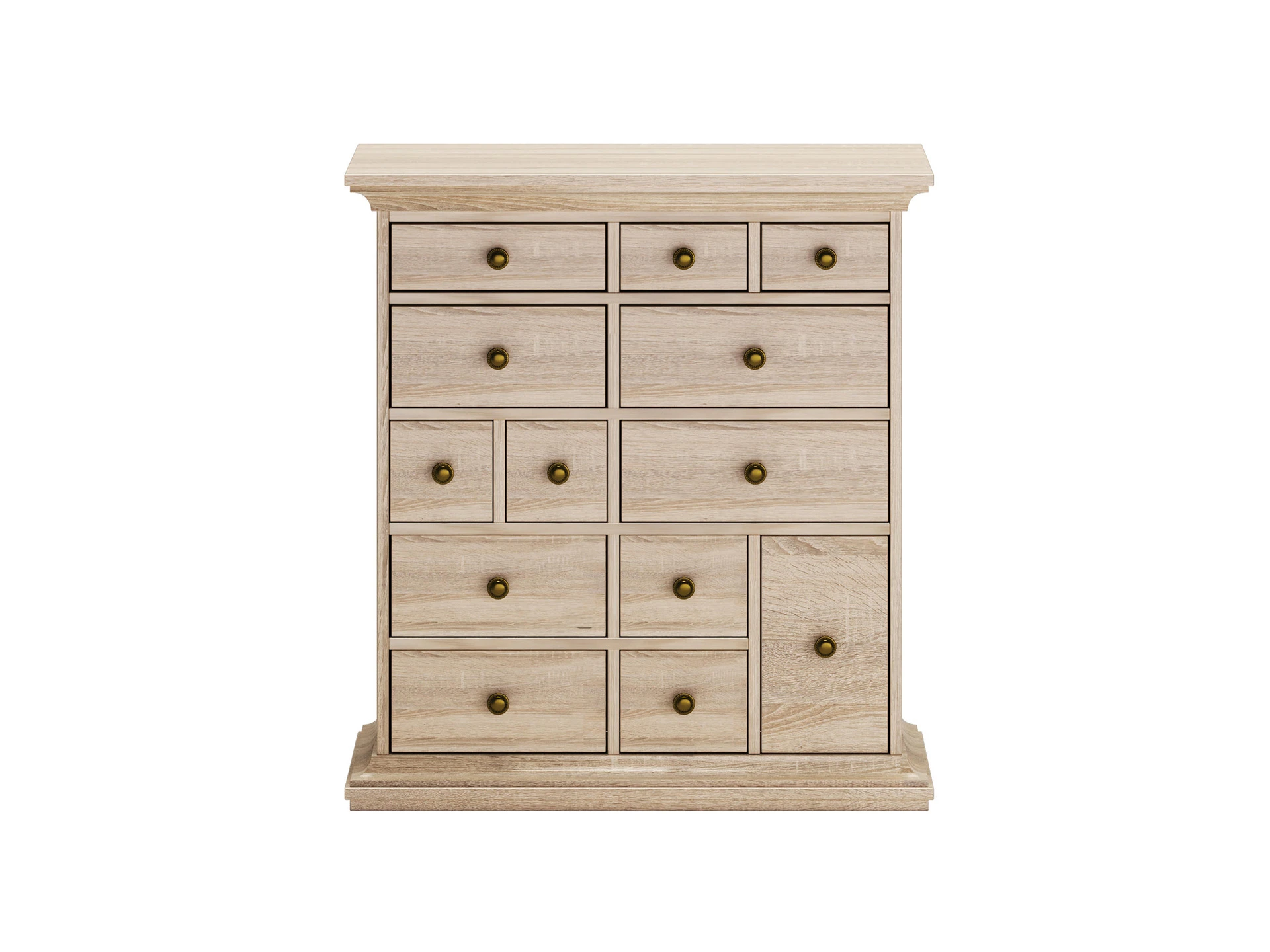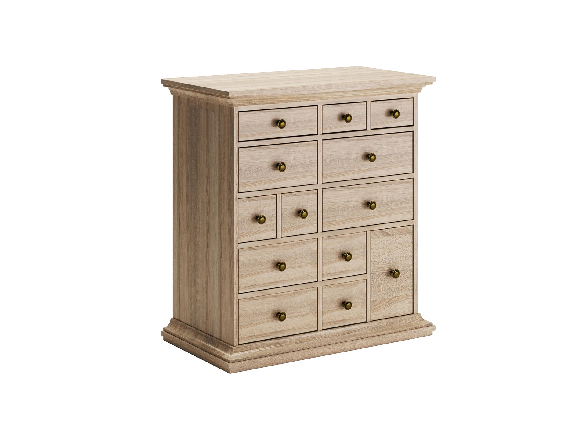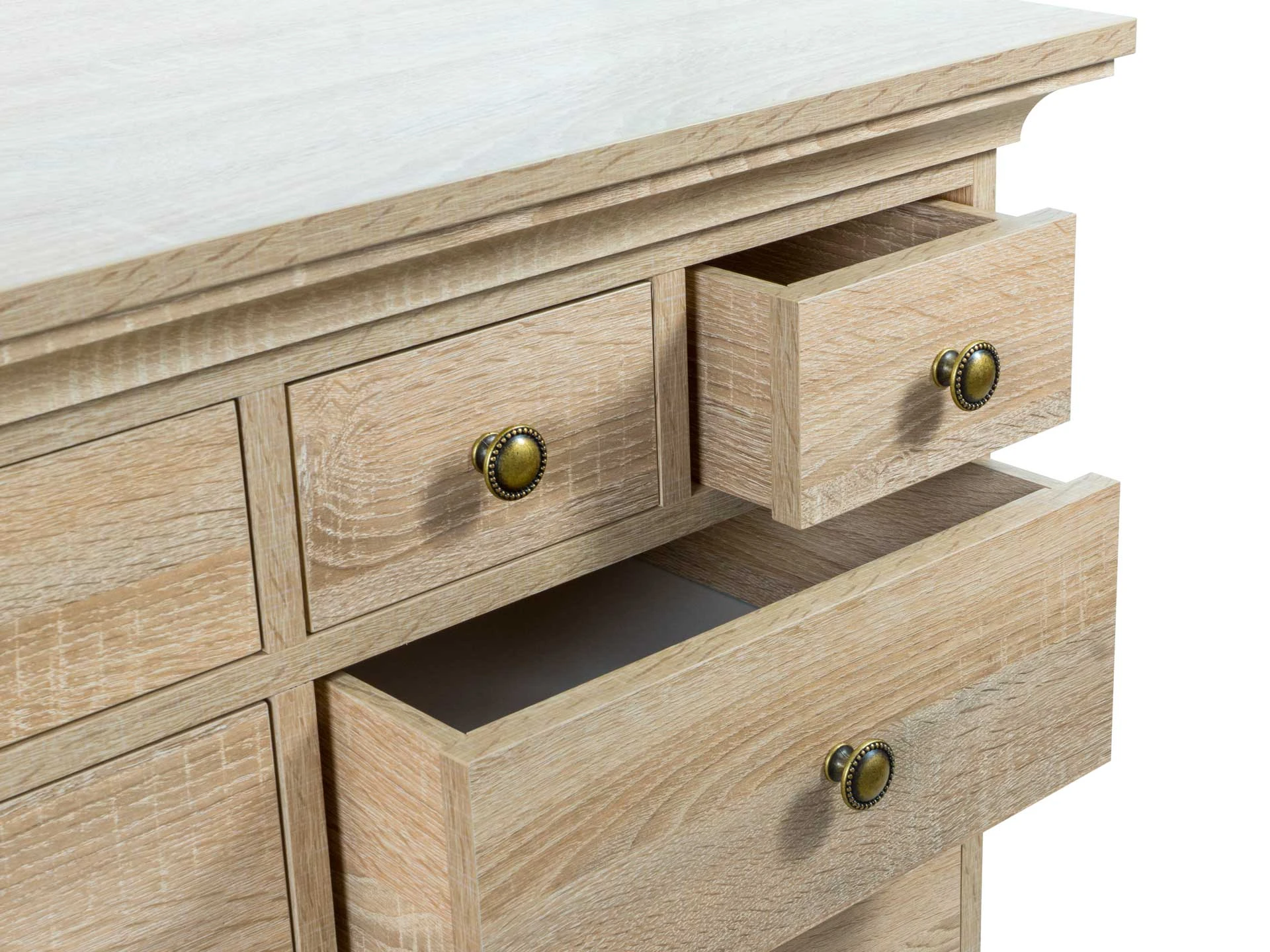 Комод имеет 13 выдвижных ящиков. Движение ящиков происходит скольжением без направляющих, по фанерным брускам, установленных на дно отделений.