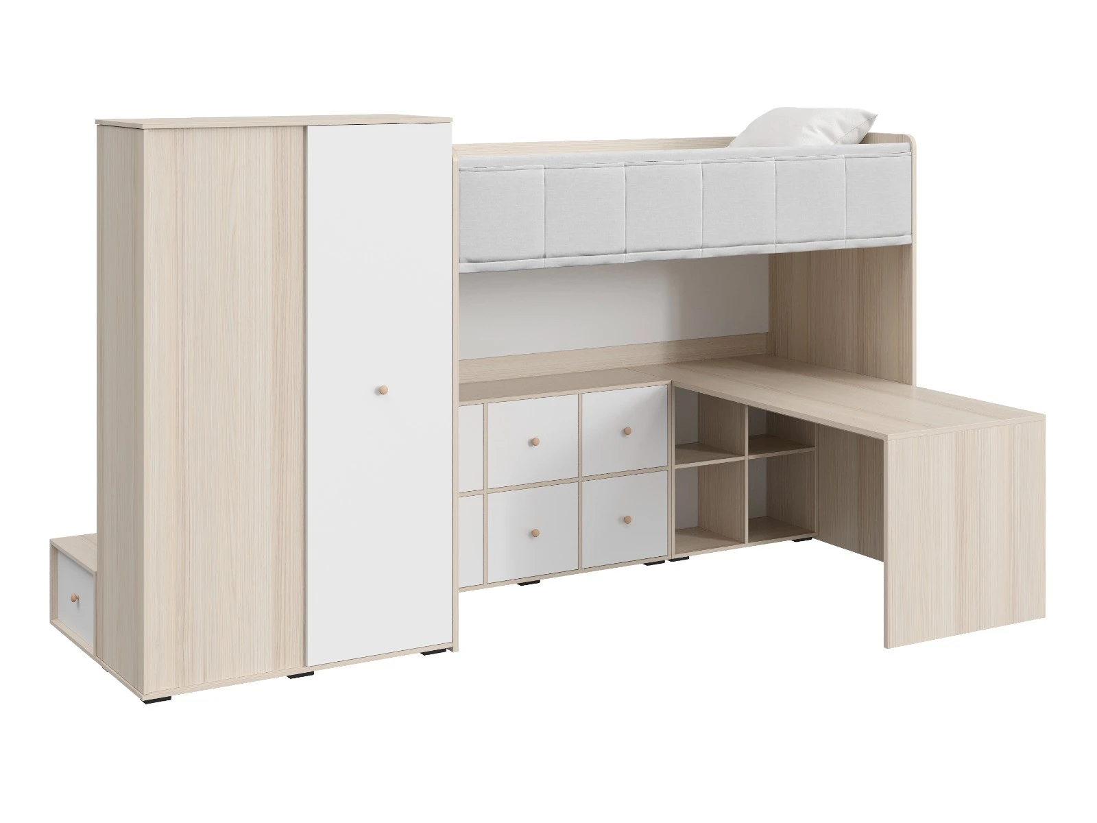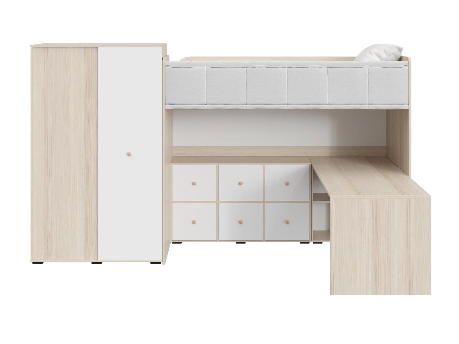 Play — коллекция модульной мебели для детской в спокойных оттенках светлого дерева с локальным добавлением ярких элементов. Естественные формы и цвета подружатся с любой стилевой темой. Подойдет как для дошкольников, так и для подростков. Изделия отвечают главным критериям детской мебели: безопасны, устойчивы, надёжны и эстетичны. Соблюдены экологические показатели, использована ЛДСП класса эмиссии Е1 и Е0,5 — для детской мебели с герметично закрытыми кромками. Из большого количества модулей вы можете спроектировать индивидуальное решение, исходя из потребностей и площади помещения. Для игровой локации, учебного места, спальной зоны, гардероба, хранения игрушек, техники и предметов для творчества — используйте модульные шкафы, стеллажи, тумбы, кровати-чердаки, столы, стеллажи-лестницы. Сквозные стеллажи идеальны в качестве перегородок в детской. Они пропускают свет, не перегружают площадь, позволяют использовать разные декоративные приёмы. Двухярусные кровати и «чердаки» удобно использовать в компактной локации. Шкафы напольные, навесные, тумбы, лаконичные столы — мебель Play поддержит атмосферу порядка и идеальный настрой на учёбу, творчество, поможет развить самостоятельность и аккуратность. Белые фасады отражают свет, освежают интерьер. С коллекцией Play вы легко создадите организованное и креативное пространство, в котором у каждой вещи есть своё место, и где ребенку комфортно учиться, играть, отдыхать, творить. Многофункциональная композиция для детской и молодежной. Ручки в стоимость изделия не включены, приобретаются отдельно.