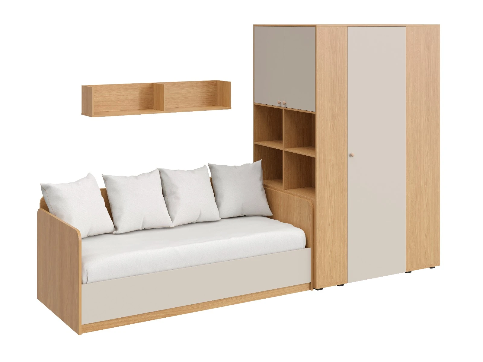 Play — коллекция модульной мебели для детской в спокойных оттенках светлого дерева с локальным добавлением ярких элементов. Естественные формы и цвета подружатся с любой стилевой темой. Подойдет как для дошкольников, так и для подростков. Изделия отвечают главным критериям детской мебели: безопасны, устойчивы, надёжны и эстетичны. Соблюдены экологические показатели, использована ЛДСП класса эмиссии Е1 и Е0,5 — для детской мебели с герметично закрытыми кромками. Из большого количества модулей вы можете спроектировать индивидуальное решение, исходя из потребностей и площади помещения. Для игровой локации, учебного места, спальной зоны, гардероба, хранения игрушек, техники и предметов для творчества — используйте модульные шкафы, стеллажи, тумбы, кровати-чердаки, столы, стеллажи-лестницы. Сквозные стеллажи идеальны в качестве перегородок в детской. Они пропускают свет, не перегружают площадь, позволяют использовать разные декоративные приёмы. Двухярусные кровати и «чердаки» удобно использовать в компактной локации. Шкафы напольные, навесные, тумбы, лаконичные столы — мебель Play поддержит атмосферу порядка и идеальный настрой на учёбу, творчество, поможет развить самостоятельность и аккуратность. Белые фасады отражают свет, освежают интерьер. С коллекцией Play вы легко создадите организованное и креативное пространство, в котором у каждой вещи есть своё место, и где ребенку комфортно учиться, играть, отдыхать, творить. Многофункциональная композиция для детской и молодежной. Ручки в стоимость изделия не включены, приобретаются отдельно.