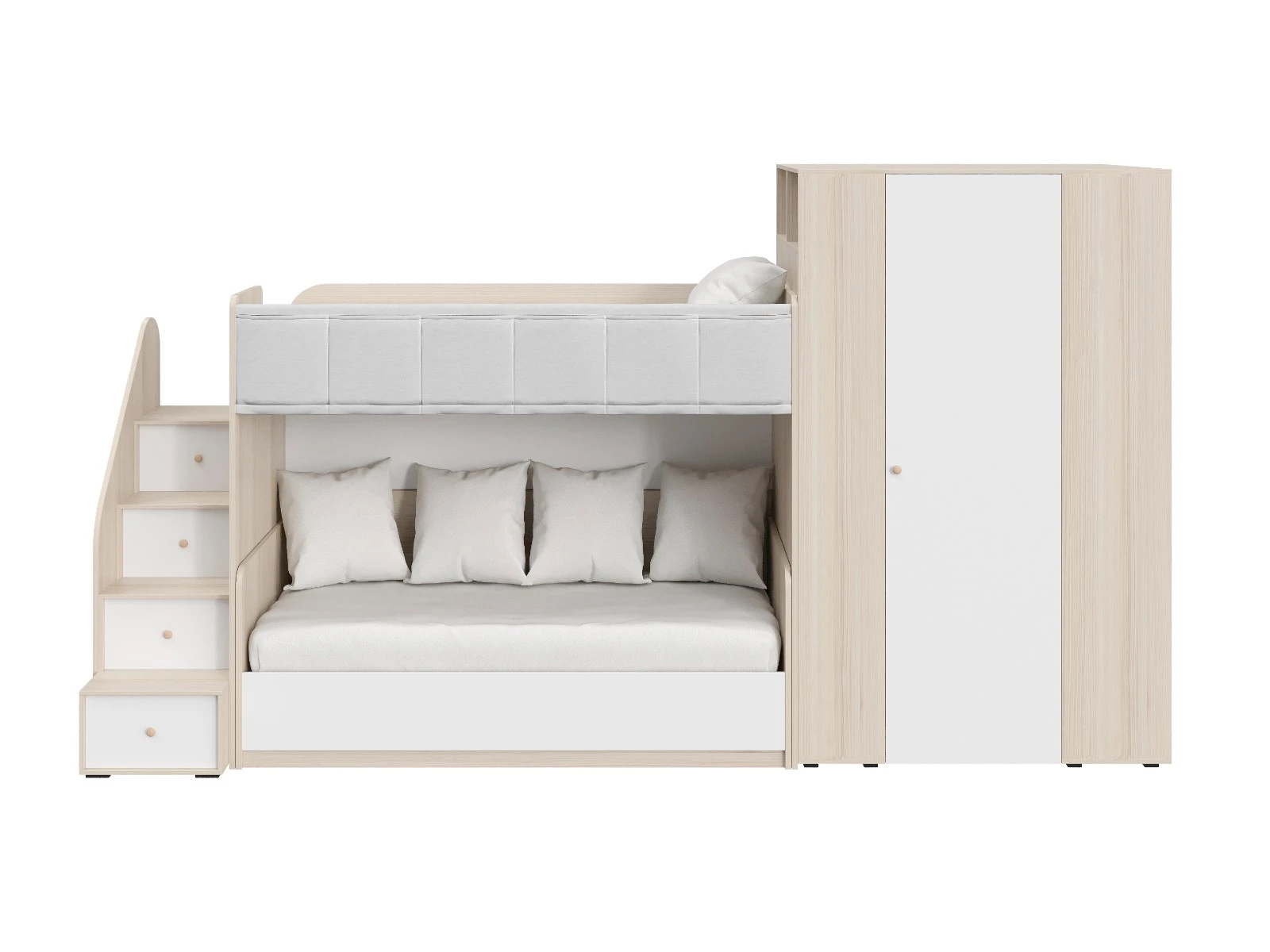 Play — коллекция модульной мебели для детской в спокойных оттенках светлого дерева с локальным добавлением ярких элементов. Естественные формы и цвета подружатся с любой стилевой темой. Подойдет как для дошкольников, так и для подростков. Изделия отвечают главным критериям детской мебели: безопасны, устойчивы, надёжны и эстетичны. Соблюдены экологические показатели, использована ЛДСП класса эмиссии Е1 и Е0,5 — для детской мебели с герметично закрытыми кромками. Из большого количества модулей вы можете спроектировать индивидуальное решение, исходя из потребностей и площади помещения. Для игровой локации, учебного места, спальной зоны, гардероба, хранения игрушек, техники и предметов для творчества — используйте модульные шкафы, стеллажи, тумбы, кровати-чердаки, столы, стеллажи-лестницы. Сквозные стеллажи идеальны в качестве перегородок в детской. Они пропускают свет, не перегружают площадь, позволяют использовать разные декоративные приёмы. Двухярусные кровати и «чердаки» удобно использовать в компактной локации. Шкафы напольные, навесные, тумбы, лаконичные столы — мебель Play поддержит атмосферу порядка и идеальный настрой на учёбу, творчество, поможет развить самостоятельность и аккуратность. Белые фасады отражают свет, освежают интерьер. С коллекцией Play вы легко создадите организованное и креативное пространство, в котором у каждой вещи есть своё место, и где ребенку комфортно учиться, играть, отдыхать, творить. Многофункциональная композиция для детской и молодежной. Ручки в стоимость изделия не включены, приобретаются отдельно.