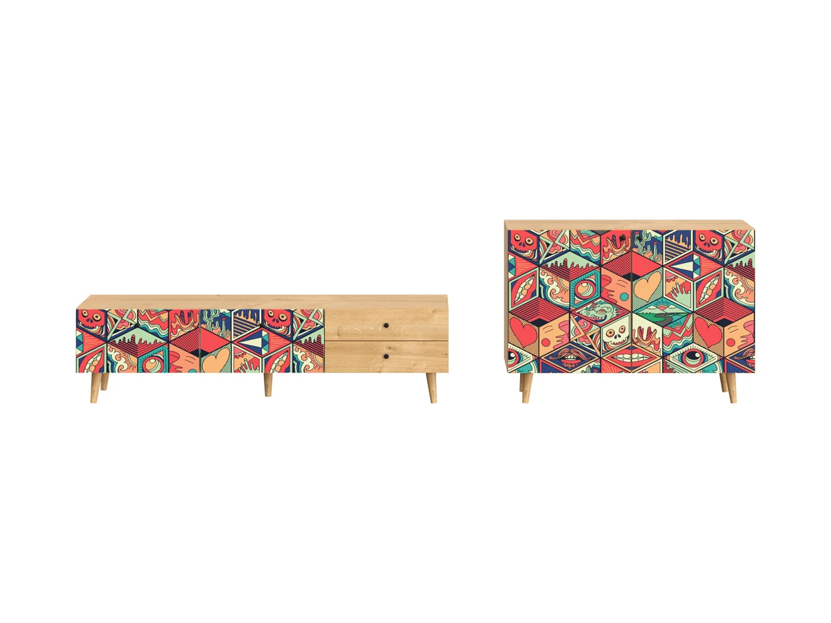 Корпусная мебель, с которой можно составить множество решений для гостиной, детской, кухни, спальни, прихожей, рабочей зоны. Комоды, шкафы, тумбы, столы, витрины, полки, серванты характеризуются универсальностью, многозадачностью, надёжными устойчивыми конструкциями. Имеют выразительный внешний вид, вдохновленный направлением ретро. Смотрятся легко и воздушно за счет деревянных ножек, минимального количества декоративных элементов, спокойных природных оттенков. Их можно использовать в качестве систем хранения, элементов для зонирования, фокусных точек. В дизайне ярко выражена доминанта прямых форм, графичности, лаконичных линий и элегантного исполнения. Что даёт пространству ощущение размеренности, сбалансированности, упорядоченности. Подходят интерьерам как с нейтральной базой, так и локациям с интенсивными цветовыми блоками. Индивидуальности добавят модели с оригинальными паттернами на фасадах. Предметы коллекции Frida гармонично впишутся в эклектичные и стилизованные интерьеры. Ручки входят в стоимость изделия. Высота опор 160 мм. Изображение, нанесенное на фасады, устойчиво к выцветанию, истиранию и влаге. Однако длительное воздействие воды, различных растворителей, спиртосодержащих жидкостей и высоких температур, увеличивают риск повреждения целостности покрытия. Поэтому при использовании необходимо соблюдать ряд правил: 1. Протирайте поверхность с рисунком влажной (но не мокрой) тканью. 2. Используйте мягкие ткани, например, салфетки для стекла или зеркал. 3. Не используйте для обработки поверхности с нанесенным на нее рисунком чистящие порошки и средства, в состав которых входят ацетон, растворитель или спирт. 4. Не используйте металлические губки и щетки с жесткой щетиной. 5. Избегайте ударов, падения, царапания, трения изделий с фотопечатью.