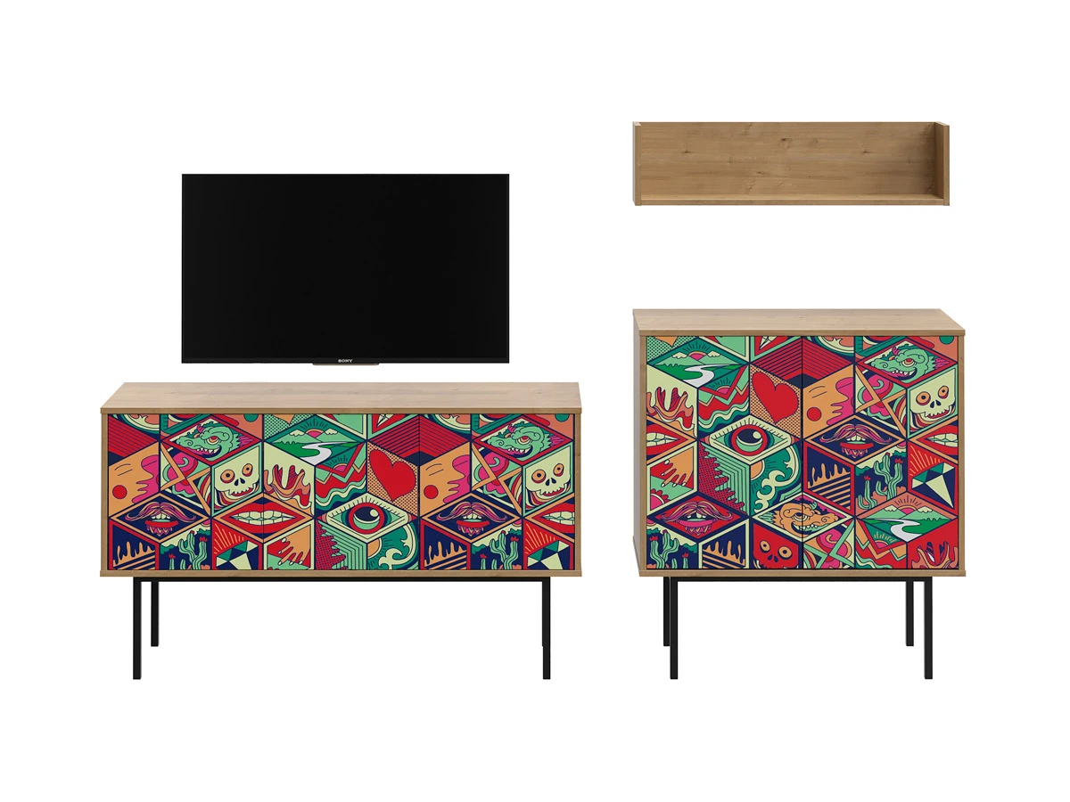 Коллекция Boho Color — более 40 комбинаций изящных тумб, шкафов, консолей с оригинальными принтами на фасадах. Узор напечатан на ЛДСП, остаётся ярким и насыщенным спустя годы использования, не выцветает, не тускнеет, смотрится красиво и актуально. Изделия станут притягательной фишкой гостиной, спальни, детской, кабинета, творческой студии, лаундж и бьюти-зоны. За их насыщенными данными скрывается функциональность, которая гарантирует удобное размещение необходимых вещей. Характерная черта серии — тонкие, но прочные металлические ножки. Которые контрастируют с четкими прямоугольными формами, что придает мебели легкий воздушный вид. Поэтому предметы Boho Color не перегружают пространство. Экзотические мотивы, растительные орнаменты, тропические цветы, колоритные узоры рисуют расслабленную атмосферу отдыха и приключений. Добавляют интерьеру многослойности, объёма, сочности, теплоты, природной энергетики. С помощью этих деталей можно задать тон общей композиции, расставить необходимые акценты или подчеркнуть индивидуальность интерьера. Высота опор 27 см. Изображение, нанесенное на фасады, устойчиво к выцветанию, истиранию и влаге. Однако длительное воздействие воды, различных растворителей, спиртосодержащих жидкостей и высоких температур, увеличивают риск повреждения целостности покрытия. Поэтому при использовании необходимо соблюдать ряд правил: 1. Протирайте поверхность с рисунком влажной (но не мокрой) тканью. 2. Используйте мягкие ткани, например, салфетки для стекла или зеркал. 3. Не используйте для обработки поверхности с нанесенным на нее рисунком чистящие порошки и средства, в состав которых входят ацетон, растворитель или спирт. 4. Не используйте металлические губки и щетки с жесткой щетиной. 5. Избегайте ударов, падения, царапания, трения изделий с фотопечатью.