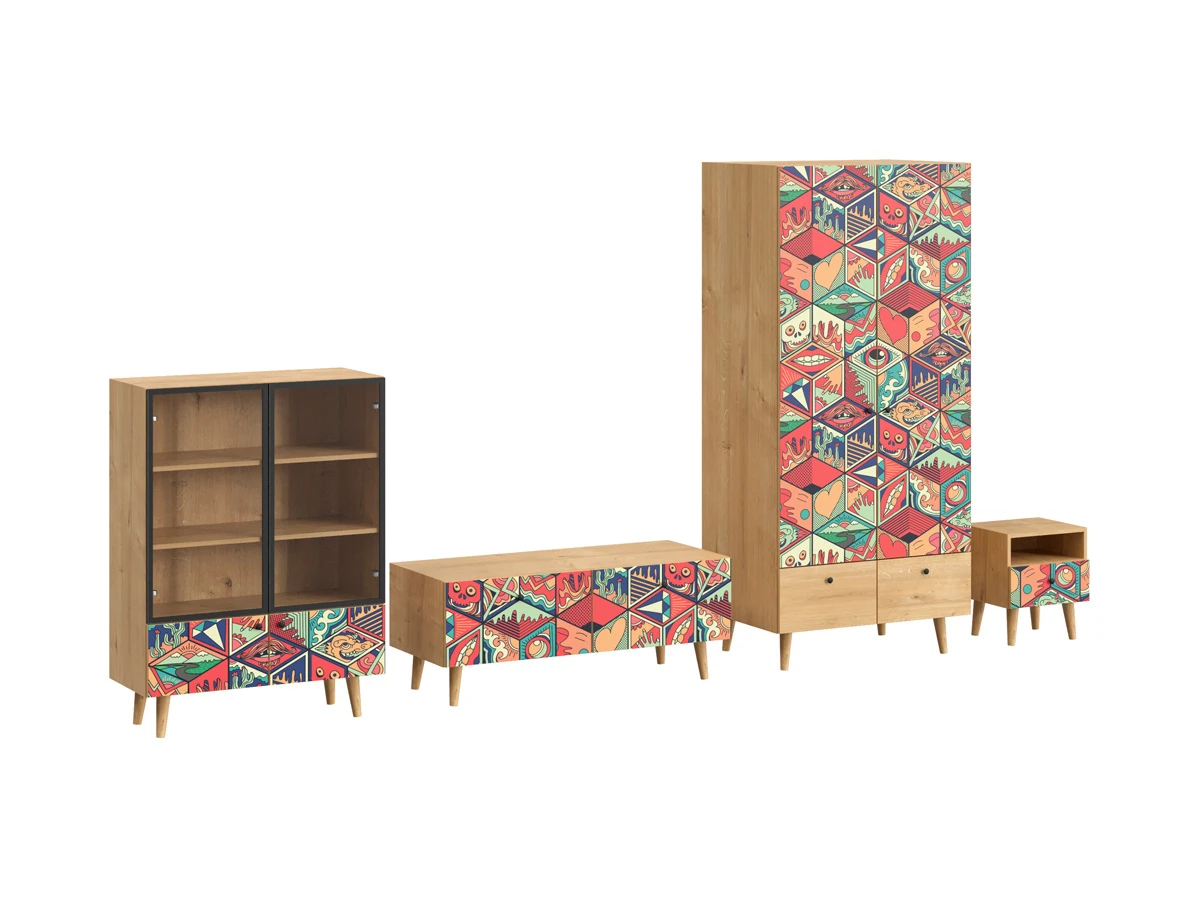 Корпусная мебель, с которой можно составить множество решений для гостиной, детской, кухни, спальни, прихожей, рабочей зоны. Комоды, шкафы, тумбы, столы, витрины, полки, серванты характеризуются универсальностью, многозадачностью, надёжными устойчивыми конструкциями. Имеют выразительный внешний вид, вдохновленный направлением ретро. Смотрятся легко и воздушно за счет деревянных ножек, минимального количества декоративных элементов, спокойных природных оттенков. Их можно использовать в качестве систем хранения, элементов для зонирования, фокусных точек. В дизайне ярко выражена доминанта прямых форм, графичности, лаконичных линий и элегантного исполнения. Что даёт пространству ощущение размеренности, сбалансированности, упорядоченности. Подходят интерьерам как с нейтральной базой, так и локациям с интенсивными цветовыми блоками. Индивидуальности добавят модели с оригинальными паттернами на фасадах. Предметы коллекции Frida гармонично впишутся в эклектичные и стилизованные интерьеры. Ручки входят в стоимость изделия. Высота опор 160 мм. Изображение, нанесенное на фасады, устойчиво к выцветанию, истиранию и влаге. Однако длительное воздействие воды, различных растворителей, спиртосодержащих жидкостей и высоких температур, увеличивают риск повреждения целостности покрытия. Поэтому при использовании необходимо соблюдать ряд правил: 1. Протирайте поверхность с рисунком влажной (но не мокрой) тканью. 2. Используйте мягкие ткани, например, салфетки для стекла или зеркал. 3. Не используйте для обработки поверхности с нанесенным на нее рисунком чистящие порошки и средства, в состав которых входят ацетон, растворитель или спирт. 4. Не используйте металлические губки и щетки с жесткой щетиной. 5. Избегайте ударов, падения, царапания, трения изделий с фотопечатью.