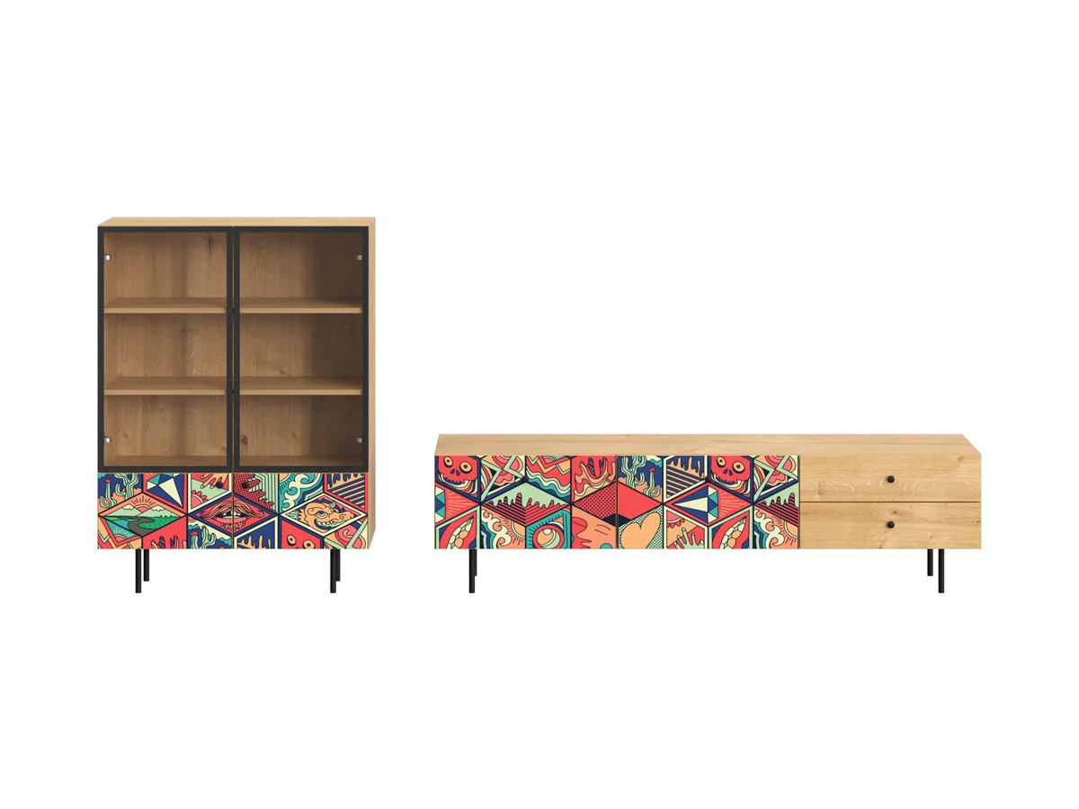 Корпусная мебель, с которой можно составить множество решений для гостиной, детской, кухни, спальни, прихожей, рабочей зоны. Комоды, шкафы, тумбы, столы, витрины, полки, серванты характеризуются универсальностью, многозадачностью, надёжными устойчивыми конструкциями. Имеют выразительный внешний вид, вдохновленный направлением ретро. Смотрятся легко и воздушно за счет деревянных ножек, минимального количества декоративных элементов, спокойных природных оттенков. Их можно использовать в качестве систем хранения, элементов для зонирования, фокусных точек. В дизайне ярко выражена доминанта прямых форм, графичности, лаконичных линий и элегантного исполнения. Что даёт пространству ощущение размеренности, сбалансированности, упорядоченности. Подходят интерьерам как с нейтральной базой, так и локациям с интенсивными цветовыми блоками. Индивидуальности добавят модели с оригинальными паттернами на фасадах. Предметы коллекции Frida гармонично впишутся в эклектичные и стилизованные интерьеры. Ручки входят в стоимость изделия. Высота опор 160 мм. Изображение, нанесенное на фасады, устойчиво к выцветанию, истиранию и влаге. Однако длительное воздействие воды, различных растворителей, спиртосодержащих жидкостей и высоких температур, увеличивают риск повреждения целостности покрытия. Поэтому при использовании необходимо соблюдать ряд правил: 1. Протирайте поверхность с рисунком влажной (но не мокрой) тканью. 2. Используйте мягкие ткани, например, салфетки для стекла или зеркал. 3. Не используйте для обработки поверхности с нанесенным на нее рисунком чистящие порошки и средства, в состав которых входят ацетон, растворитель или спирт. 4. Не используйте металлические губки и щетки с жесткой щетиной. 5. Избегайте ударов, падения, царапания, трения изделий с фотопечатью.