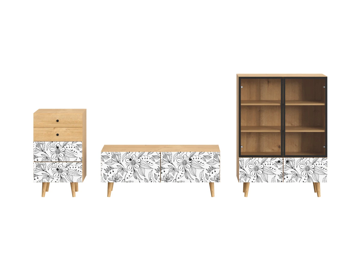 Корпусная мебель, с которой можно составить множество решений для гостиной, детской, кухни, спальни, прихожей, рабочей зоны. Комоды, шкафы, тумбы, столы, витрины, полки, серванты характеризуются универсальностью, многозадачностью, надёжными устойчивыми конструкциями. Имеют выразительный внешний вид, вдохновленный направлением ретро. Смотрятся легко и воздушно за счет деревянных ножек, минимального количества декоративных элементов, спокойных природных оттенков. Их можно использовать в качестве систем хранения, элементов для зонирования, фокусных точек. В дизайне ярко выражена доминанта прямых форм, графичности, лаконичных линий и элегантного исполнения. Что даёт пространству ощущение размеренности, сбалансированности, упорядоченности. Подходят интерьерам как с нейтральной базой, так и локациям с интенсивными цветовыми блоками. Индивидуальности добавят модели с оригинальными паттернами на фасадах. Предметы коллекции Frida гармонично впишутся в эклектичные и стилизованные интерьеры. Ручки входят в стоимость изделия. Высота опор 160 мм. Изображение, нанесенное на фасады, устойчиво к выцветанию, истиранию и влаге. Однако длительное воздействие воды, различных растворителей, спиртосодержащих жидкостей и высоких температур, увеличивают риск повреждения целостности покрытия. Поэтому при использовании необходимо соблюдать ряд правил: 1. Протирайте поверхность с рисунком влажной (но не мокрой) тканью. 2. Используйте мягкие ткани, например, салфетки для стекла или зеркал. 3. Не используйте для обработки поверхности с нанесенным на нее рисунком чистящие порошки и средства, в состав которых входят ацетон, растворитель или спирт. 4. Не используйте металлические губки и щетки с жесткой щетиной. 5. Избегайте ударов, падения, царапания, трения изделий с фотопечатью.