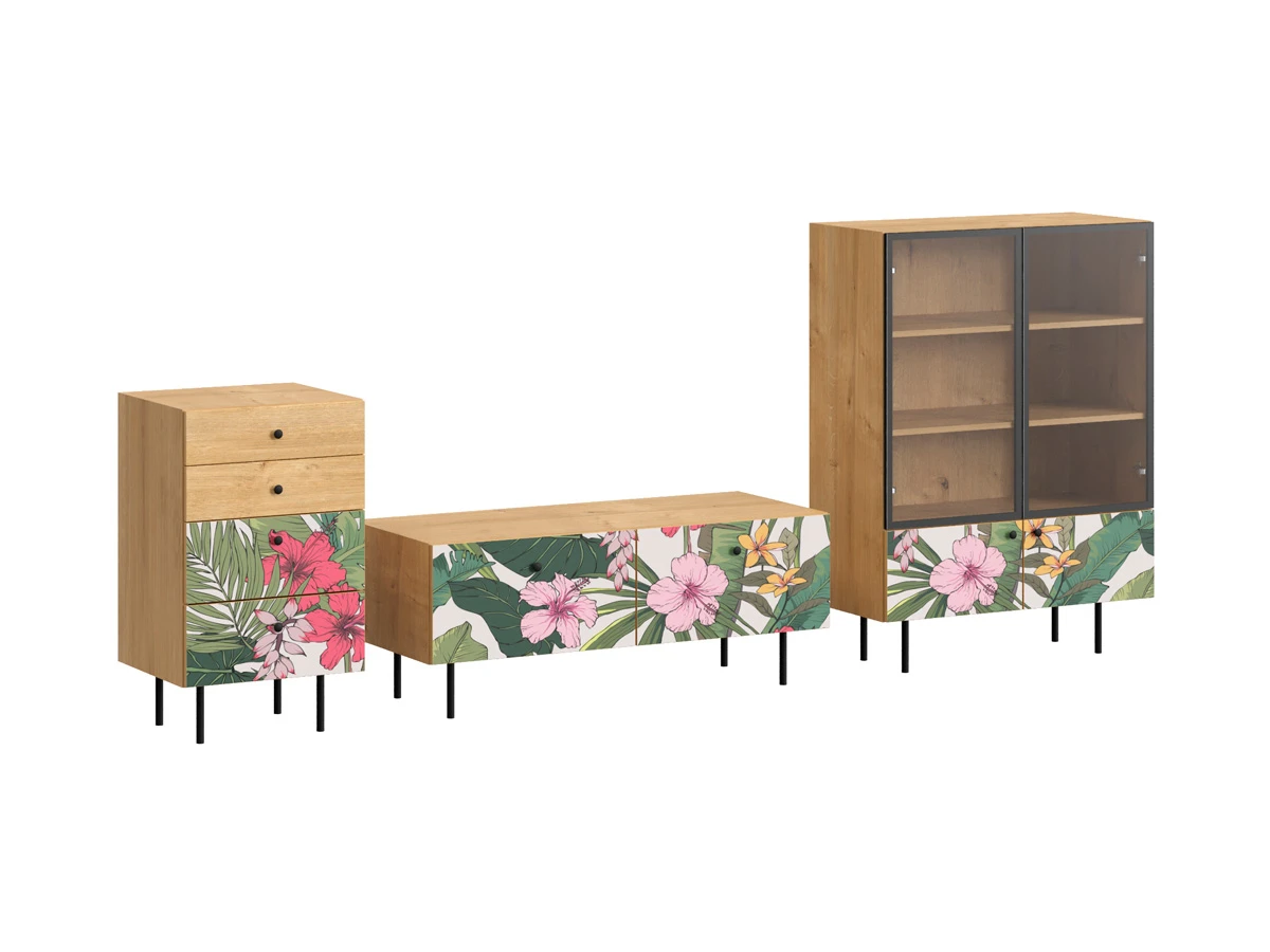 Корпусная мебель, с которой можно составить множество решений для гостиной, детской, кухни, спальни, прихожей, рабочей зоны. Комоды, шкафы, тумбы, столы, витрины, полки, серванты характеризуются универсальностью, многозадачностью, надёжными устойчивыми конструкциями. Имеют выразительный внешний вид, вдохновленный направлением ретро. Смотрятся легко и воздушно за счет деревянных ножек, минимального количества декоративных элементов, спокойных природных оттенков. Их можно использовать в качестве систем хранения, элементов для зонирования, фокусных точек. В дизайне ярко выражена доминанта прямых форм, графичности, лаконичных линий и элегантного исполнения. Что даёт пространству ощущение размеренности, сбалансированности, упорядоченности. Подходят интерьерам как с нейтральной базой, так и локациям с интенсивными цветовыми блоками. Индивидуальности добавят модели с оригинальными паттернами на фасадах. Предметы коллекции Frida гармонично впишутся в эклектичные и стилизованные интерьеры. Ручки входят в стоимость изделия. Высота опор 160 мм. Изображение, нанесенное на фасады, устойчиво к выцветанию, истиранию и влаге. Однако длительное воздействие воды, различных растворителей, спиртосодержащих жидкостей и высоких температур, увеличивают риск повреждения целостности покрытия. Поэтому при использовании необходимо соблюдать ряд правил: 1. Протирайте поверхность с рисунком влажной (но не мокрой) тканью. 2. Используйте мягкие ткани, например, салфетки для стекла или зеркал. 3. Не используйте для обработки поверхности с нанесенным на нее рисунком чистящие порошки и средства, в состав которых входят ацетон, растворитель или спирт. 4. Не используйте металлические губки и щетки с жесткой щетиной. 5. Избегайте ударов, падения, царапания, трения изделий с фотопечатью.