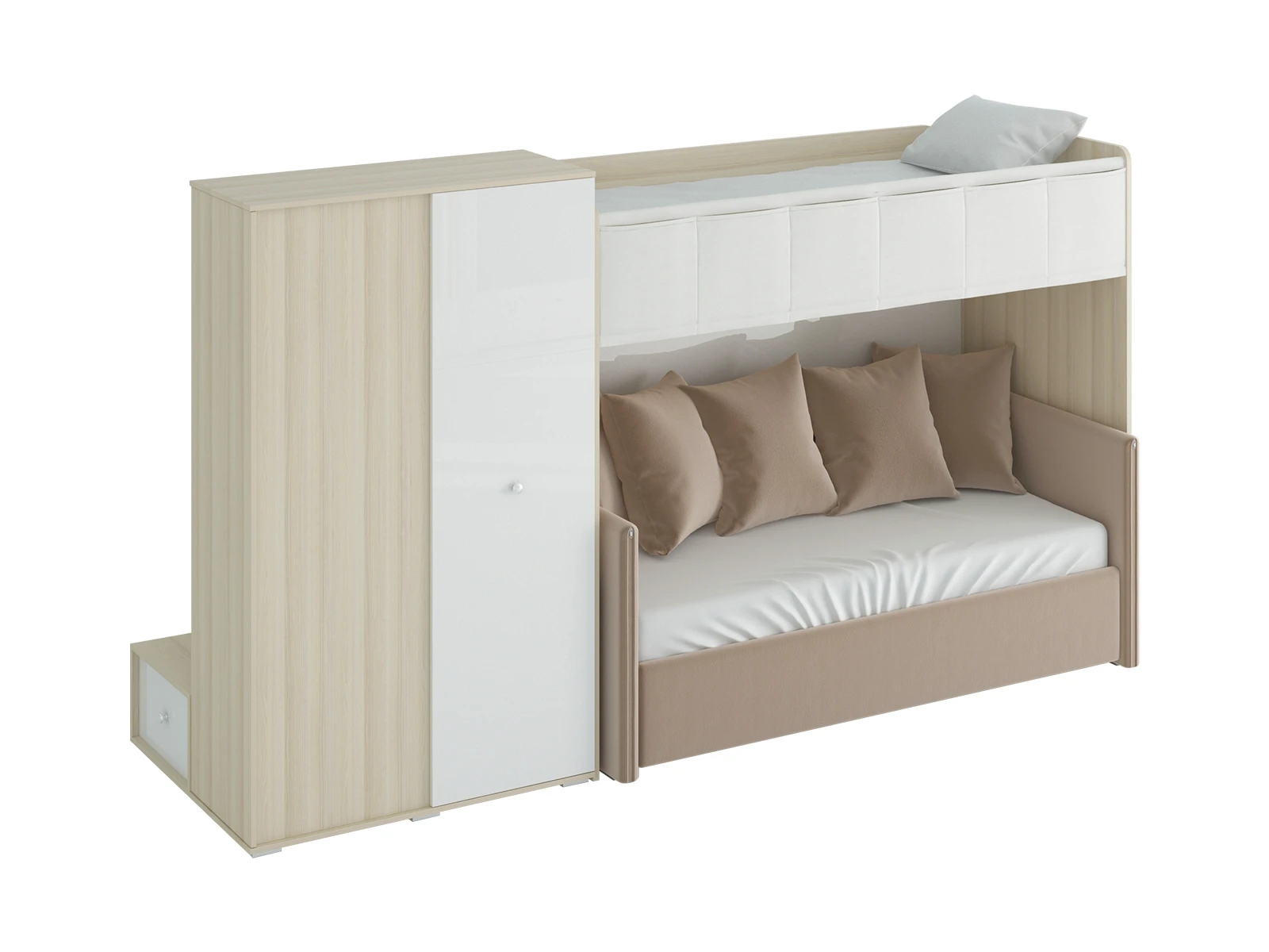Play — коллекция модульной мебели для детской в спокойных оттенках светлого дерева с локальным добавлением ярких элементов. Естественные формы и цвета подружатся с любой стилевой темой. Подойдет как для дошкольников, так и для подростков. Изделия отвечают главным критериям детской мебели: безопасны, устойчивы, надёжны и эстетичны. Соблюдены экологические показатели, использована ЛДСП класса эмиссии Е1 и Е0,5 — для детской мебели с герметично закрытыми кромками. Из большого количества модулей вы можете спроектировать индивидуальное решение, исходя из потребностей и площади помещения. Для игровой локации, учебного места, спальной зоны, гардероба, хранения игрушек, техники и предметов для творчества — используйте модульные шкафы, стеллажи, тумбы, кровати-чердаки, столы, стеллажи-лестницы. Сквозные стеллажи идеальны в качестве перегородок в детской. Они пропускают свет, не перегружают площадь, позволяют использовать разные декоративные приёмы. Двухярусные кровати и «чердаки» удобно использовать в компактной локации. Шкафы напольные, навесные, тумбы, лаконичные столы — мебель Play поддержит атмосферу порядка и идеальный настрой на учёбу, творчество, поможет развить самостоятельность и аккуратность. Белые фасады отражают свет, освежают интерьер. С коллекцией Play вы легко создадите организованное и креативное пространство, в котором у каждой вещи есть своё место, и где ребенку комфортно учиться, играть, отдыхать, творить. Многофункциональная композиция для детской и молодежной. Ручки в стоимость изделия не включены, приобретаются отдельно.