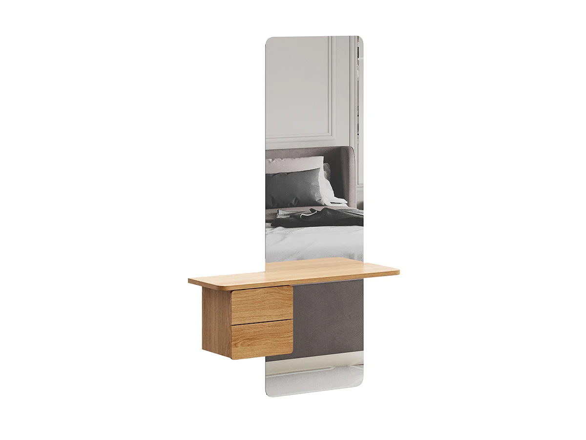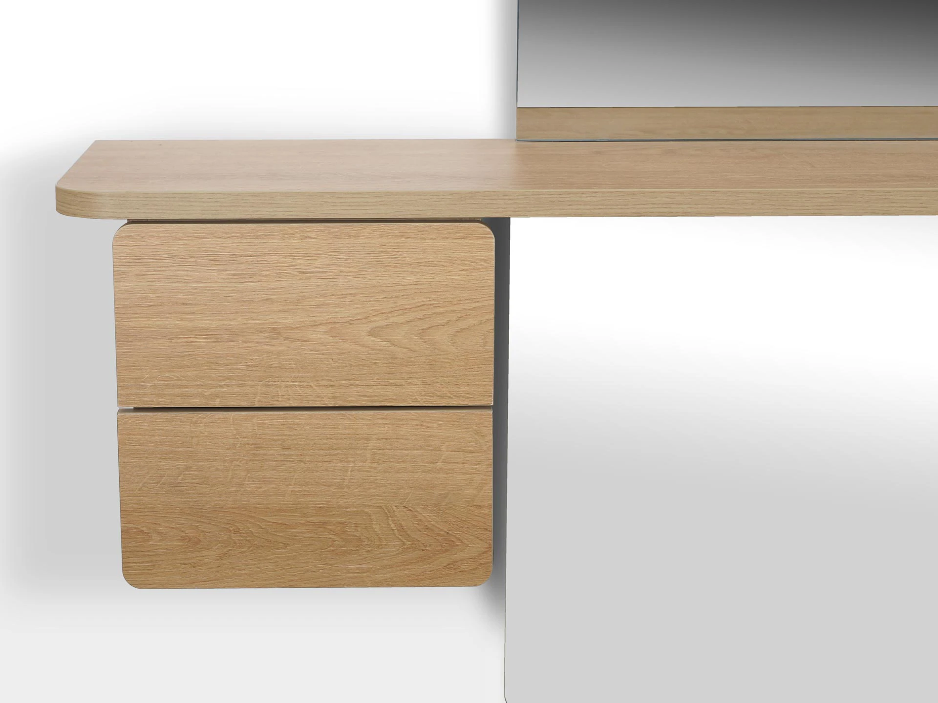 Изделие состоит из столешницы с подвесной тумбой и двух навесных зеркал – верхнего и нижнего. Углы зеркала, столешницы и фасада скруглены. Подзеркальный щит заглублен по отношению к зеркалу на 40мм. Вся конструкция крепится на стену. От тщательности выполнения разметки зависит качество сборки изделия. В тумбе два ящика на направляющих скрытого монтажа, неполного выдвижения. Открываются от нажатия. Материал корпуса тумбы: ЛДСП 16мм, Дуб корбридж. Столешница и подзеркальные щиты: ЛДСП 22мм, Дуб корбридж . Фасад в двух характеристиках: Дуб корбридж и Черный . Материал фасада Дуб корбридж: ЛДСП 16мм. Изделие может собрано с расположением зеркал как слева, так и справа. Крепление : врезной навес, крючок для навеса, дюбель для крючка.