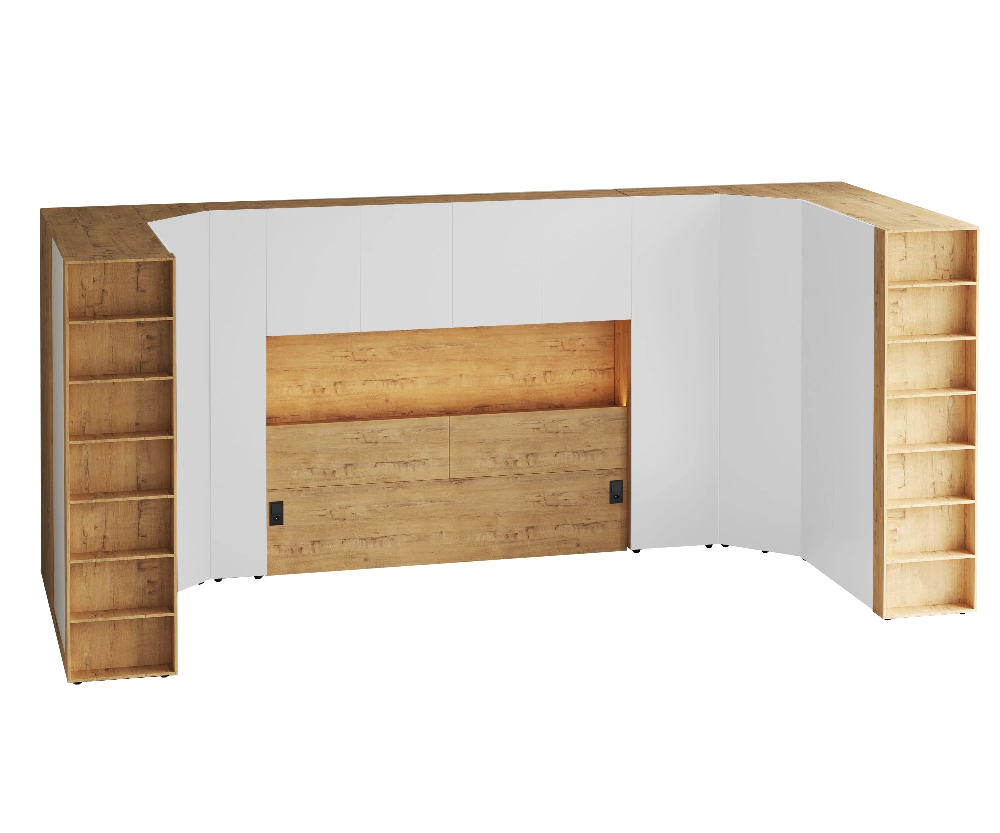 Линейка корпусной мебели, которая закрывает большинство потребностей по хранению и организации вещей. Универсальные и функциональные шкафы, тумбы, стеллажи, столы группируются по функциональны зонам. С их помощью можно обустроить прихожую, гостиную, кабинет, спальню, детскую. В основе дизайна — софт-минимализм с продуманными деталями и материалами. Скрытые механизмы открытия дверей, естественная древесная текстура, большая вместительность, белый цвет делают их исключительно удачными для большинства современных пространств. Гладкие фасады без декора и ручек поддерживают идею отказа от визуального шума, двери открываются по принципу «нажал-открыл». Мебель Modus создает уравновешенный интерьер с выразительными компонентами, настраивающими на ритмичный образ жизни, целеустремленность и чувство свободы от избыточных деталей. Кроватный блок предназначен для использования совместно с кроватью или диваном. Блок имеет два отделения за откидными дверьми и открытую полку над ними. Двери открываются за кромку, с помощью газовых кронштейнов. Кроватный блок оснащен светодиодным светильником, расположенным на открытой верхней полке. Светильник представляет собой алюминиевый профиль с матовым экраном, внутри которого установлена светодиодная лента. С левой и с правой стороны переднего щита блока установлены выключатели светильника и эл. розетки с разъемами USB А и Type C. Блок установлен на регулируемые опоры. Внутренние размеры отделений для хранения: 1160х850х260мм каждое отделение. Максимальная нагрузка на верхнюю полку не должна превышать 20 кг. Панель представляет собой щит из ЛДСП 16 мм. предназначенный для установки над кроватным блоком. Панель навешивается на регулируемые подвесы. Шкаф имеет три регулируемых подвеса для навешивания на стену. Полки имеют возможность перестановки по высоте в трех уровнях. Дверь открывается по принципу «нажал-открыл». Максимальная нагрузка на каждую полку не должна превышать 7 кг. Пенал Modus состоит из корпуса и фасада. Корпус с проходным нижним и верхним щитом установлен на опоры. Опоры регулируемые, пластик черный, круглые. Корпус горизонтальной стенкой разделен на два отделения по высоте. Верхнее отделение оснащено одной съёмной полкой, нижнее – пятью съёмными полками. Полки 6 – съемные, с перестановкой по высоте в 3 положения. Максимальная нагрузка на одну полку не должна превышать 4кг. Фасад представляет собой распашную дверь, которая открывается по принципу «нажал-открыл». Установка двери возможна с открыванием как в левую, так и в правую сторону.
