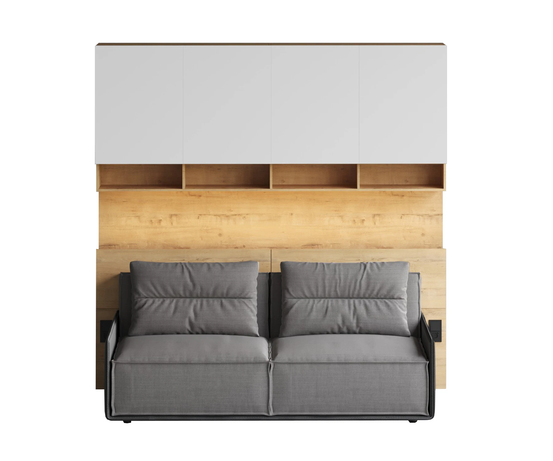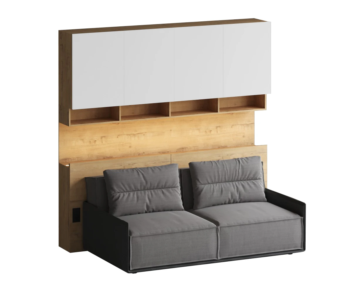 Линейка корпусной мебели, которая закрывает большинство потребностей по хранению и организации вещей. Универсальные и функциональные шкафы, тумбы, стеллажи, столы группируются по функциональны зонам. С их помощью можно обустроить прихожую, гостиную, кабинет, спальню, детскую. В основе дизайна — софт-минимализм с продуманными деталями и материалами. Скрытые механизмы открытия дверей, естественная древесная текстура, большая вместительность, белый цвет делают их исключительно удачными для большинства современных пространств. Гладкие фасады без декора и ручек поддерживают идею отказа от визуального шума, двери открываются по принципу «нажал-открыл». Мебель Modus создает уравновешенный интерьер с выразительными компонентами, настраивающими на ритмичный образ жизни, целеустремленность и чувство свободы от избыточных деталей. Кроватный блок предназначен для использования совместно с кроватью или диваном. Блок имеет два отделения за откидными дверьми и открытую полку над ними. Двери открываются за кромку, с помощью газовых кронштейнов. Кроватный блок оснащен светодиодным светильником, расположенным на открытой верхней полке. Светильник представляет собой алюминиевый профиль с матовым экраном, внутри которого установлена светодиодная лента. С левой и с правой стороны переднего щита блока установлены выключатели светильника и эл. розетки с разъемами USB А и Type C. Блок установлен на регулируемые опоры. Внутренние размеры отделений для хранения: 1160х850х260мм каждое отделение. Максимальная нагрузка на верхнюю полку не должна превышать 20 кг. Панель представляет собой щит из ЛДСП 16 мм. предназначенный для установки над кроватным блоком. Панель навешивается на регулируемые подвесы. Шкаф имеет три регулируемых подвеса для навешивания на стену. Полки имеют возможность перестановки по высоте в трех уровнях. Дверь открывается по принципу «нажал-открыл». Максимальная нагрузка на каждую полку не должна превышать 7 кг. Диван входит в стоимость.