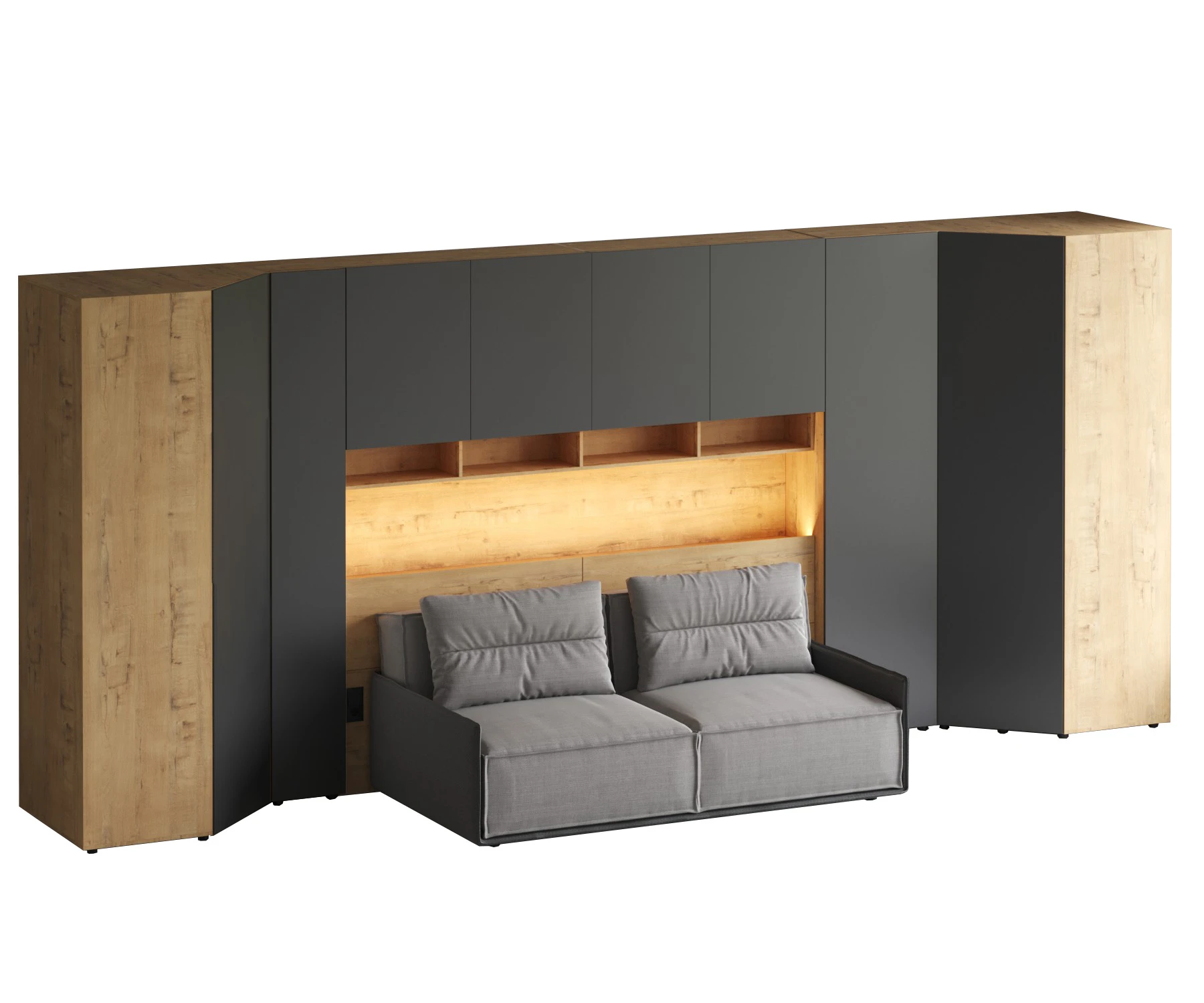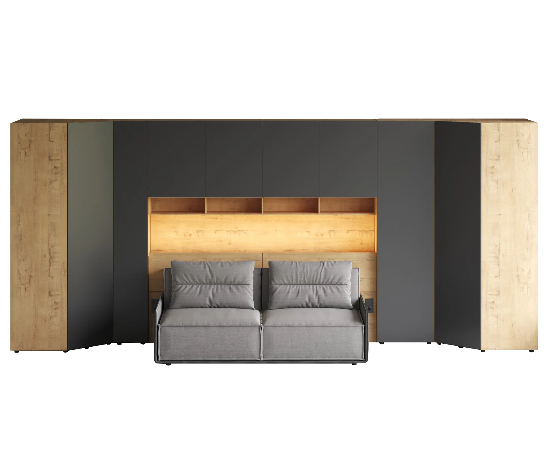 Линейка корпусной мебели, которая закрывает большинство потребностей по хранению и организации вещей. Универсальные и функциональные шкафы, тумбы, стеллажи, столы группируются по функциональны зонам. С их помощью можно обустроить прихожую, гостиную, кабинет, спальню, детскую. В основе дизайна — софт-минимализм с продуманными деталями и материалами. Скрытые механизмы открытия дверей, естественная древесная текстура, большая вместительность, белый цвет делают их исключительно удачными для большинства современных пространств. Гладкие фасады без декора и ручек поддерживают идею отказа от визуального шума, двери открываются по принципу «нажал-открыл». Мебель Modus создает уравновешенный интерьер с выразительными компонентами, настраивающими на ритмичный образ жизни, целеустремленность и чувство свободы от избыточных деталей. Кроватный блок предназначен для использования совместно с кроватью или диваном. Блок имеет два отделения за откидными дверьми и открытую полку над ними. Двери открываются за кромку, с помощью газовых кронштейнов. Кроватный блок оснащен светодиодным светильником, расположенным на открытой верхней полке. Светильник представляет собой алюминиевый профиль с матовым экраном, внутри которого установлена светодиодная лента. С левой и с правой стороны переднего щита блока установлены выключатели светильника и эл. розетки с разъемами USB А и Type C. Блок установлен на регулируемые опоры. Внутренние размеры отделений для хранения: 1160х850х260мм каждое отделение. Максимальная нагрузка на верхнюю полку не должна превышать 20 кг. Панель представляет собой щит из ЛДСП 16 мм. предназначенный для установки над кроватным блоком. Панель навешивается на регулируемые подвесы. Шкаф имеет три регулируемых подвеса для навешивания на стену. Полки имеют возможность перестановки по высоте в трех уровнях. Дверь открывается по принципу «нажал-открыл». Максимальная нагрузка на каждую полку не должна превышать 7 кг. Пенал Modus состоит из корпуса и фасада. Корпус с проходным нижним и верхним щитом установлен на опоры. Опоры регулируемые, пластик черный, круглые. Корпус горизонтальной стенкой разделен на два отделения по высоте. Верхнее отделение оснащено одной съёмной полкой, нижнее – пятью съёмными полками. Полки 6 – съемные, с перестановкой по высоте в 3 положения. Максимальная нагрузка на одну полку не должна превышать 4кг. Фасад представляет собой распашную дверь, которая открывается по принципу «нажал-открыл». Установка двери возможна с открыванием как в левую, так и в правую сторону.