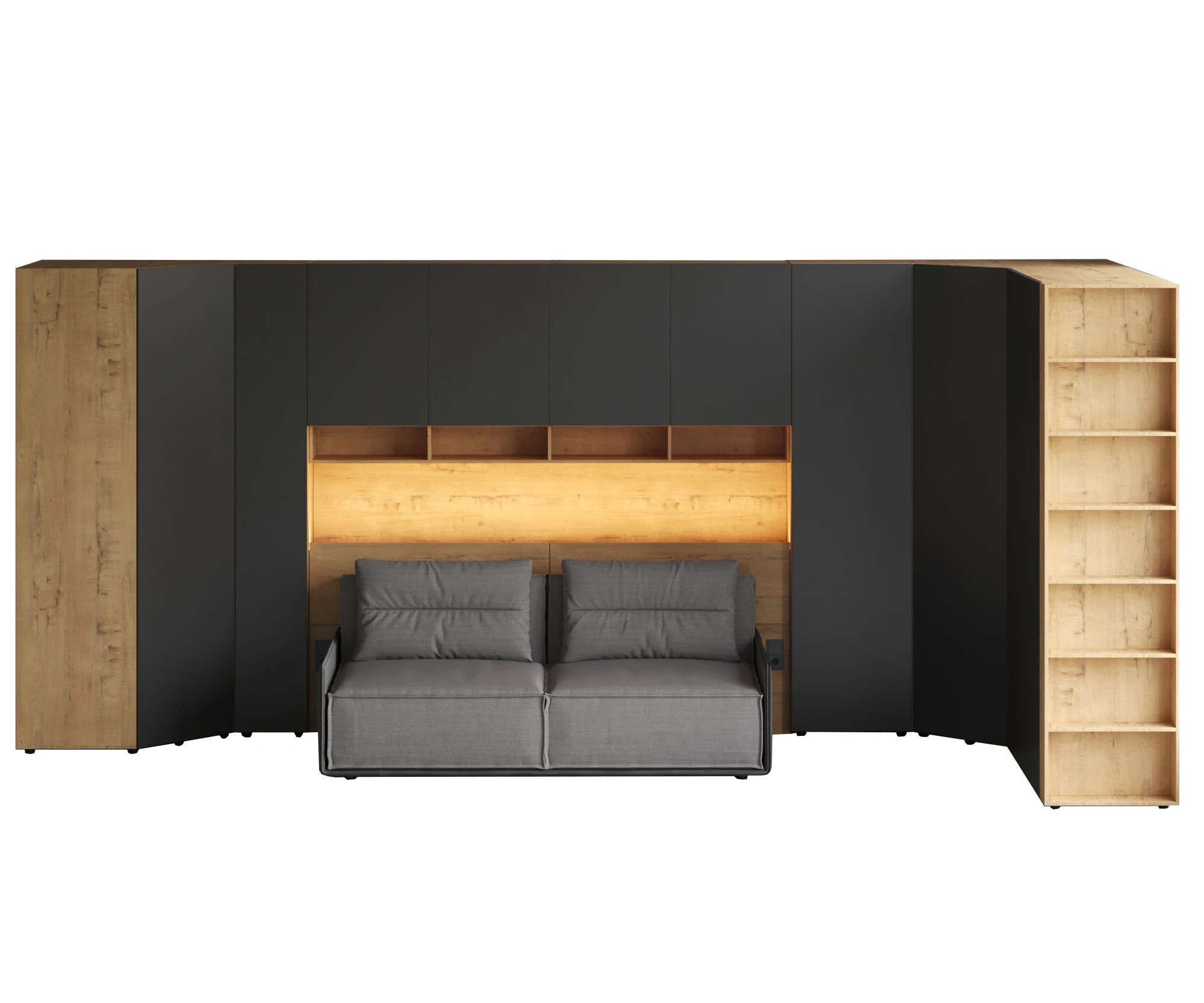 Линейка корпусной мебели, которая закрывает большинство потребностей по хранению и организации вещей. Универсальные и функциональные шкафы, тумбы, стеллажи, столы группируются по функциональны зонам. С их помощью можно обустроить прихожую, гостиную, кабинет, спальню, детскую. В основе дизайна — софт-минимализм с продуманными деталями и материалами. Скрытые механизмы открытия дверей, естественная древесная текстура, большая вместительность, белый цвет делают их исключительно удачными для большинства современных пространств. Гладкие фасады без декора и ручек поддерживают идею отказа от визуального шума, двери открываются по принципу «нажал-открыл». Мебель Modus создает уравновешенный интерьер с выразительными компонентами, настраивающими на ритмичный образ жизни, целеустремленность и чувство свободы от избыточных деталей. Кроватный блок предназначен для использования совместно с кроватью или диваном. Блок имеет два отделения за откидными дверьми и открытую полку над ними. Двери открываются за кромку, с помощью газовых кронштейнов. Кроватный блок оснащен светодиодным светильником, расположенным на открытой верхней полке. Светильник представляет собой алюминиевый профиль с матовым экраном, внутри которого установлена светодиодная лента. С левой и с правой стороны переднего щита блока установлены выключатели светильника и эл. розетки с разъемами USB А и Type C. Блок установлен на регулируемые опоры. Внутренние размеры отделений для хранения: 1160х850х260мм каждое отделение. Максимальная нагрузка на верхнюю полку не должна превышать 20 кг. Панель представляет собой щит из ЛДСП 16 мм. предназначенный для установки над кроватным блоком. Панель навешивается на регулируемые подвесы. Шкаф имеет три регулируемых подвеса для навешивания на стену. Полки имеют возможность перестановки по высоте в трех уровнях. Дверь открывается по принципу «нажал-открыл». Максимальная нагрузка на каждую полку не должна превышать 7 кг. Пенал Modus состоит из корпуса и фасада. Корпус с проходным нижним и верхним щитом установлен на опоры. Опоры регулируемые, пластик черный, круглые. Корпус горизонтальной стенкой разделен на два отделения по высоте. Верхнее отделение оснащено одной съёмной полкой, нижнее – пятью съёмными полками. Полки 6 – съемные, с перестановкой по высоте в 3 положения. Максимальная нагрузка на одну полку не должна превышать 4кг. Фасад представляет собой распашную дверь, которая открывается по принципу «нажал-открыл». Установка двери возможна с открыванием как в левую, так и в правую сторону.