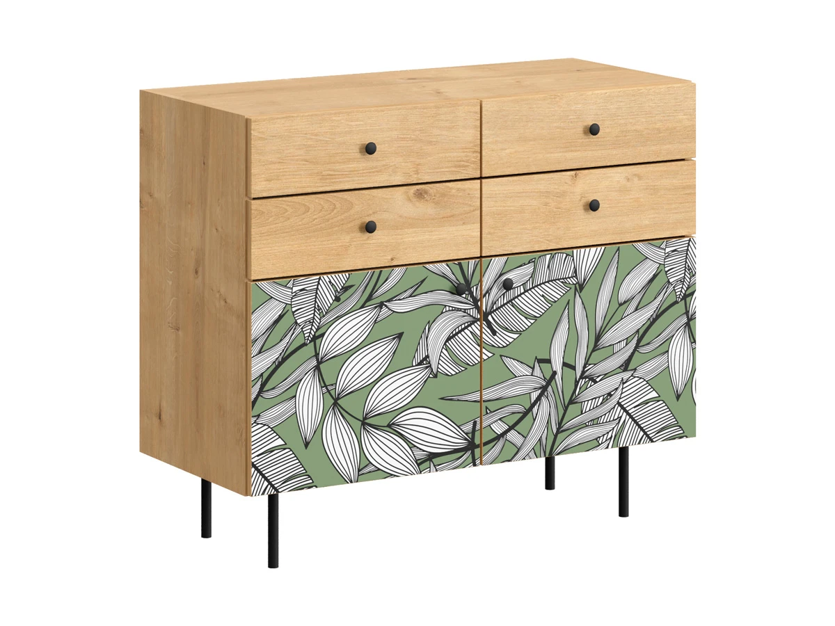 Корпусная мебель, с которой можно составить множество решений для гостиной, детской, кухни, спальни, прихожей, рабочей зоны. Комоды, шкафы, тумбы, столы, витрины, полки, серванты характеризуются универсальностью, многозадачностью, надёжными устойчивыми конструкциями. Имеют выразительный внешний вид, вдохновленный направлением ретро. Смотрятся легко и воздушно за счет деревянных ножек, минимального количества декоративных элементов, спокойных природных оттенков. Их можно использовать в качестве систем хранения, элементов для зонирования, фокусных точек. В дизайне ярко выражена доминанта прямых форм, графичности, лаконичных линий и элегантного исполнения. Что даёт пространству ощущение размеренности, сбалансированности, упорядоченности. Подходят интерьерам как с нейтральной базой, так и локациям с интенсивными цветовыми блоками. Индивидуальности добавят модели с оригинальными паттернами на фасадах. Предметы коллекции Frida гармонично впишутся в эклектичные и стилизованные интерьеры. Ручки входят в стоимость изделия. Высота опор 160 мм. Изображение, нанесенное на фасады, устойчиво к выцветанию, истиранию и влаге. Однако длительное воздействие воды, различных растворителей, спиртосодержащих жидкостей и высоких температур, увеличивают риск повреждения целостности покрытия. Поэтому при использовании необходимо соблюдать ряд правил: 1. Протирайте поверхность с рисунком влажной (но не мокрой) тканью. 2. Используйте мягкие ткани, например, салфетки для стекла или зеркал. 3. Не используйте для обработки поверхности с нанесенным на нее рисунком чистящие порошки и средства, в состав которых входят ацетон, растворитель или спирт. 4. Не используйте металлические губки и щетки с жесткой щетиной. 5. Избегайте ударов, падения, царапания, трения изделий с фотопечатью.