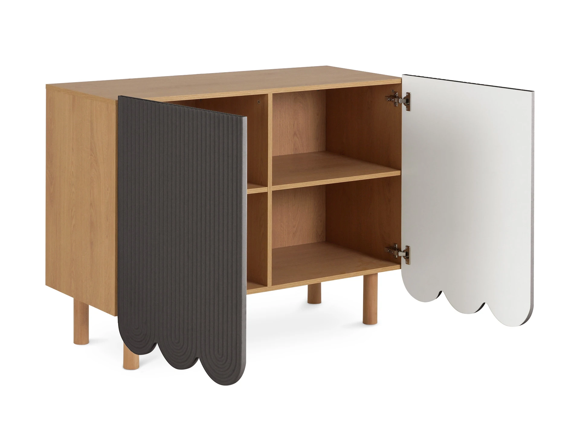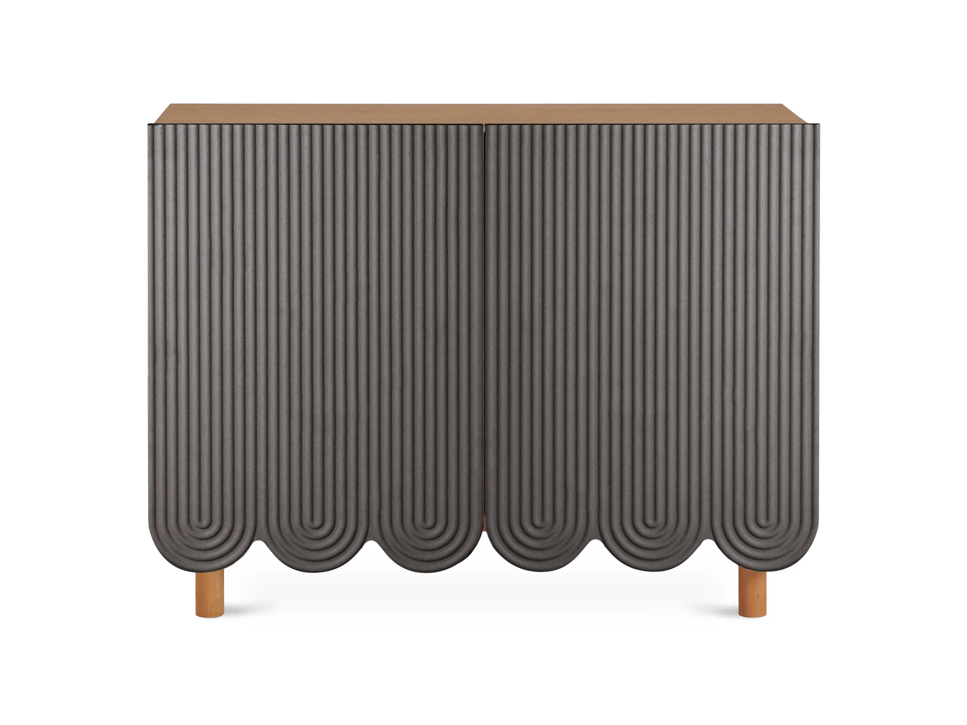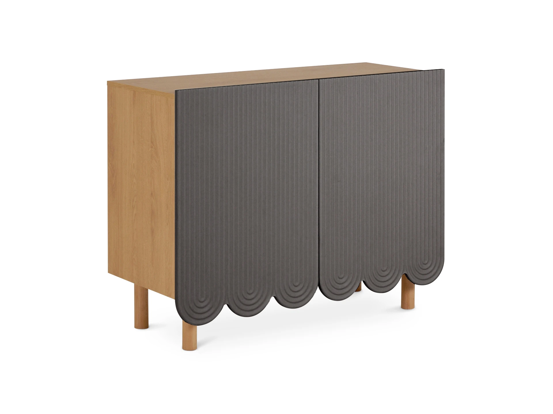 Mira — коллекция выразительных сервантов, особенностью которых являются фактурные фасады с волнообразной обработкой нижнего края. Дизайн привлекает внимание. Рифлёная поверхность распашных дверей придаёт динамики и разнообразия. Компактные круглые ножки из бука невысоко приподнимают над полом корпус серванта. Что обеспечивает лёгкость восприятия и воздушность модели. А также простоту уборки. За дверцами скрываются 4 отсека для хранения разных предметов от техники до косметики. Сервант Mira можно использовать в качестве ТВ-тумбы в гостиной, найдётся ему местечко и в спальне, рабочей или обеденной зоне. Можно дополнить органайзерами для хранения украшений, аксессуаров. Цвет фасадов может быть ярким, например, терракотовым, графитовым, или нейтральным: белым, бежевым. В любом варианте сервант Mira станет эффектным акцентом интерьера. Материал корпуса: ЛДСтП 16 мм. (все панели, включая заднюю стенку). Материал фасада: МДФ 19 мм., облицованная пленкой ПВХ. Опоры: массив бука. На опоры установлены фетровые подпятники. Отделка опор – масло защитное для дерева. Петли дверей – с плавным закрыванием. Внутренние полки – съемные. Сервант рекомендуется крепить к стене (крепежи в комплекте).