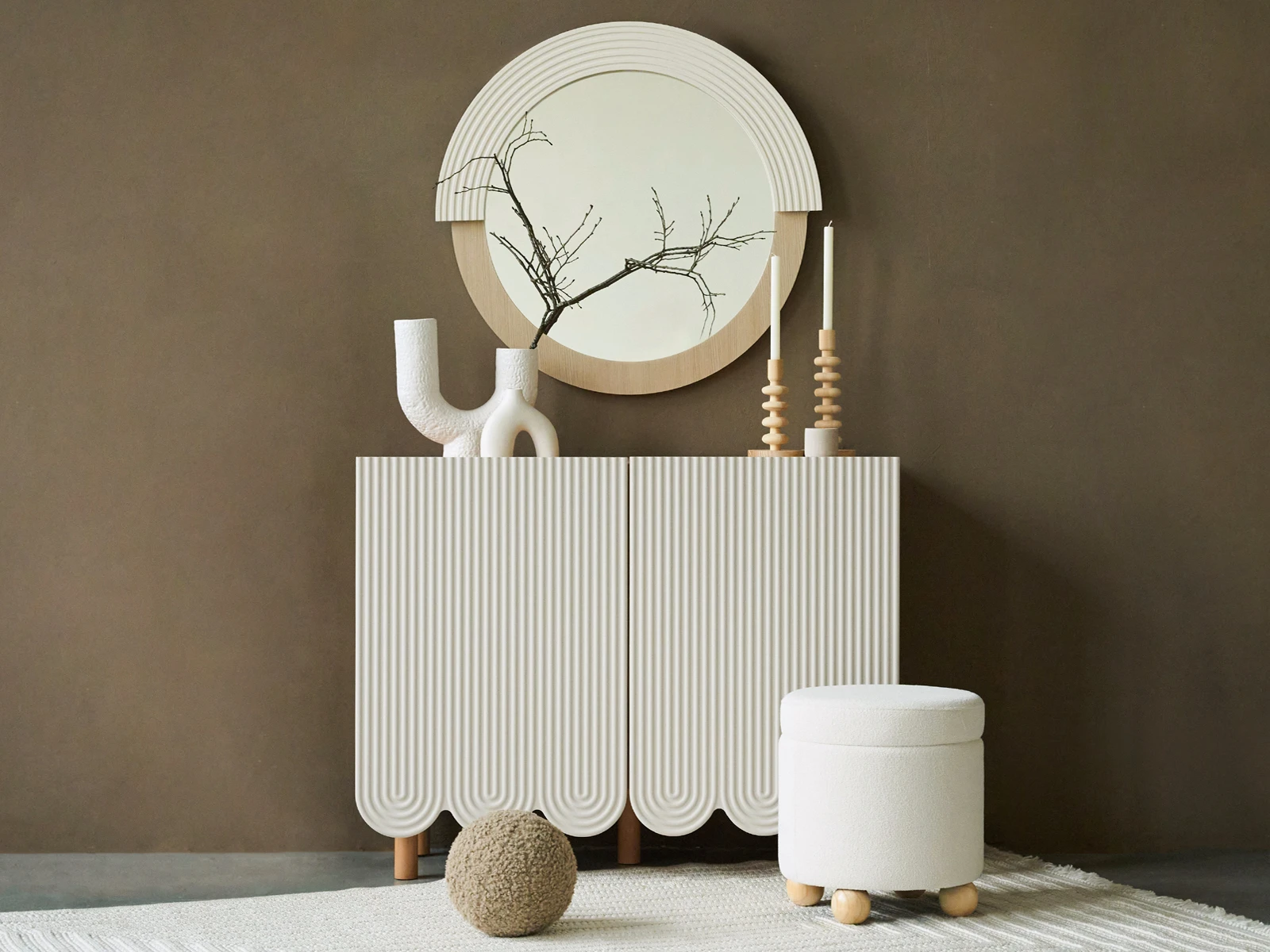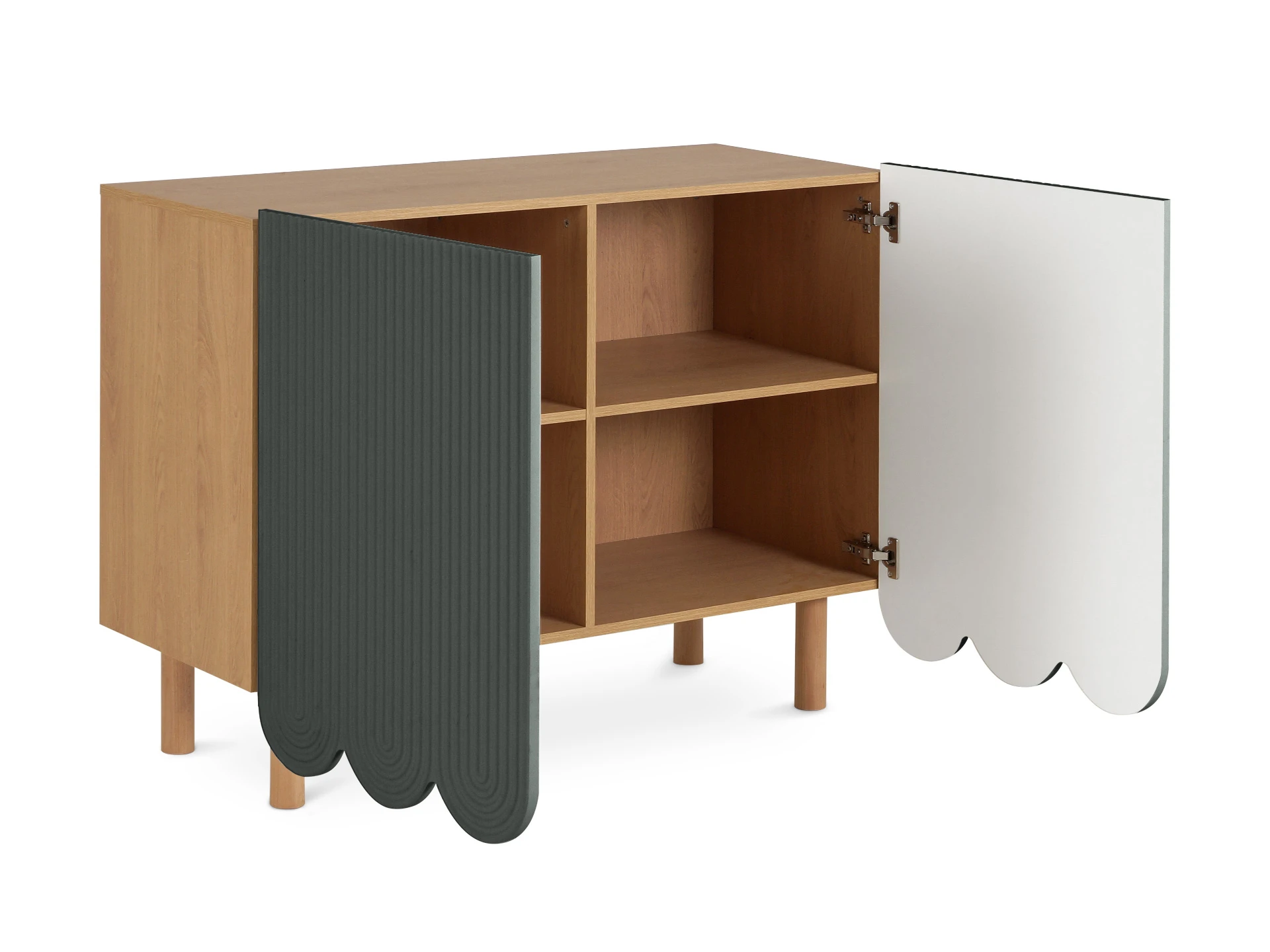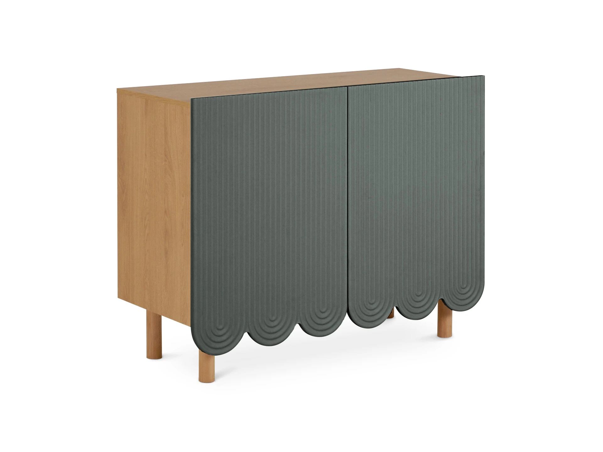 Mira — коллекция выразительных сервантов, особенностью которых являются фактурные фасады с волнообразной обработкой нижнего края. Дизайн привлекает внимание. Рифлёная поверхность распашных дверей придаёт динамики и разнообразия. Компактные круглые ножки из бука невысоко приподнимают над полом корпус серванта. Что обеспечивает лёгкость восприятия и воздушность модели. А также простоту уборки. За дверцами скрываются 4 отсека для хранения разных предметов от техники до косметики. Сервант Mira можно использовать в качестве ТВ-тумбы в гостиной, найдётся ему местечко и в спальне, рабочей или обеденной зоне. Можно дополнить органайзерами для хранения украшений, аксессуаров. Цвет фасадов может быть ярким, например, терракотовым, графитовым, или нейтральным: белым, бежевым. В любом варианте сервант Mira станет эффектным акцентом интерьера. Материал корпуса: ЛДСтП 16 мм. (все панели, включая заднюю стенку). Материал фасада: МДФ 19 мм., облицованная пленкой ПВХ. Опоры: массив бука. На опоры установлены фетровые подпятники. Отделка опор – масло защитное для дерева. Петли дверей – с плавным закрыванием. Внутренние полки – съемные. Сервант рекомендуется крепить к стене (крепежи в комплекте).