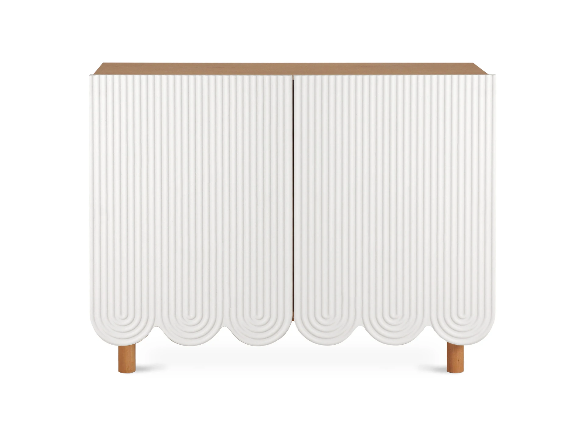 Mira — коллекция выразительных сервантов, особенностью которых являются фактурные фасады с волнообразной обработкой нижнего края. Дизайн привлекает внимание. Рифлёная поверхность распашных дверей придаёт динамики и разнообразия. Компактные круглые ножки из бука невысоко приподнимают над полом корпус серванта. Что обеспечивает лёгкость восприятия и воздушность модели. А также простоту уборки. За дверцами скрываются 4 отсека для хранения разных предметов от техники до косметики. Сервант Mira можно использовать в качестве ТВ-тумбы в гостиной, найдётся ему местечко и в спальне, рабочей или обеденной зоне. Можно дополнить органайзерами для хранения украшений, аксессуаров. Цвет фасадов может быть ярким, например, терракотовым, графитовым, или нейтральным: белым, бежевым. В любом варианте сервант Mira станет эффектным акцентом интерьера. Материал корпуса: ЛДСтП 16 мм. (все панели, включая заднюю стенку). Материал фасада: МДФ 19 мм., облицованная пленкой ПВХ. Опоры: массив бука. На опоры установлены фетровые подпятники. Отделка опор – масло защитное для дерева. Петли дверей – с плавным закрыванием. Внутренние полки – съемные. Сервант рекомендуется крепить к стене (крепежи в комплекте).