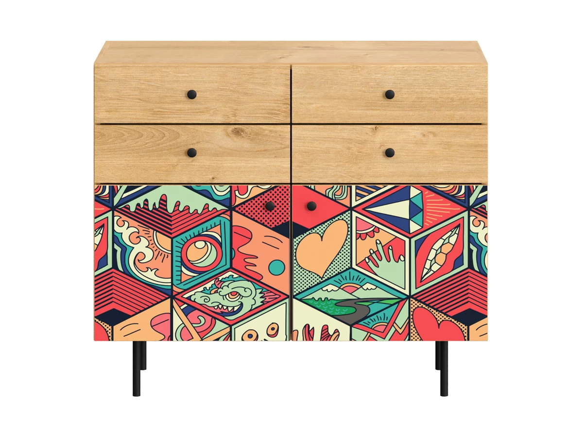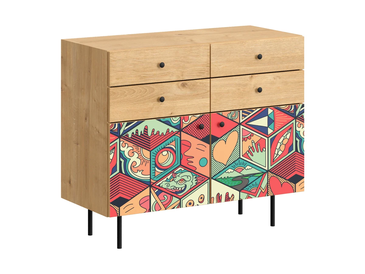 Корпусная мебель, с которой можно составить множество решений для гостиной, детской, кухни, спальни, прихожей, рабочей зоны. Комоды, шкафы, тумбы, столы, витрины, полки, серванты характеризуются универсальностью, многозадачностью, надёжными устойчивыми конструкциями. Имеют выразительный внешний вид, вдохновленный направлением ретро. Смотрятся легко и воздушно за счет деревянных ножек, минимального количества декоративных элементов, спокойных природных оттенков. Их можно использовать в качестве систем хранения, элементов для зонирования, фокусных точек. В дизайне ярко выражена доминанта прямых форм, графичности, лаконичных линий и элегантного исполнения. Что даёт пространству ощущение размеренности, сбалансированности, упорядоченности. Подходят интерьерам как с нейтральной базой, так и локациям с интенсивными цветовыми блоками. Индивидуальности добавят модели с оригинальными паттернами на фасадах. Предметы коллекции Frida гармонично впишутся в эклектичные и стилизованные интерьеры. Ручки входят в стоимость изделия. Высота опор 160 мм. Изображение, нанесенное на фасады, устойчиво к выцветанию, истиранию и влаге. Однако длительное воздействие воды, различных растворителей, спиртосодержащих жидкостей и высоких температур, увеличивают риск повреждения целостности покрытия. Поэтому при использовании необходимо соблюдать ряд правил: 1. Протирайте поверхность с рисунком влажной (но не мокрой) тканью. 2. Используйте мягкие ткани, например, салфетки для стекла или зеркал. 3. Не используйте для обработки поверхности с нанесенным на нее рисунком чистящие порошки и средства, в состав которых входят ацетон, растворитель или спирт. 4. Не используйте металлические губки и щетки с жесткой щетиной. 5. Избегайте ударов, падения, царапания, трения изделий с фотопечатью.