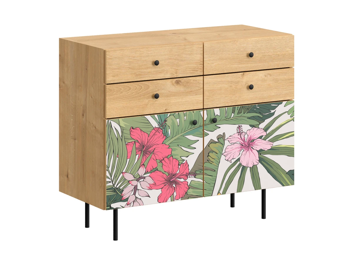 Корпусная мебель, с которой можно составить множество решений для гостиной, детской, кухни, спальни, прихожей, рабочей зоны. Комоды, шкафы, тумбы, столы, витрины, полки, серванты характеризуются универсальностью, многозадачностью, надёжными устойчивыми конструкциями. Имеют выразительный внешний вид, вдохновленный направлением ретро. Смотрятся легко и воздушно за счет деревянных ножек, минимального количества декоративных элементов, спокойных природных оттенков. Их можно использовать в качестве систем хранения, элементов для зонирования, фокусных точек. В дизайне ярко выражена доминанта прямых форм, графичности, лаконичных линий и элегантного исполнения. Что даёт пространству ощущение размеренности, сбалансированности, упорядоченности. Подходят интерьерам как с нейтральной базой, так и локациям с интенсивными цветовыми блоками. Индивидуальности добавят модели с оригинальными паттернами на фасадах. Предметы коллекции Frida гармонично впишутся в эклектичные и стилизованные интерьеры. Ручки входят в стоимость изделия. Высота опор 160 мм. Изображение, нанесенное на фасады, устойчиво к выцветанию, истиранию и влаге. Однако длительное воздействие воды, различных растворителей, спиртосодержащих жидкостей и высоких температур, увеличивают риск повреждения целостности покрытия. Поэтому при использовании необходимо соблюдать ряд правил: 1. Протирайте поверхность с рисунком влажной (но не мокрой) тканью. 2. Используйте мягкие ткани, например, салфетки для стекла или зеркал. 3. Не используйте для обработки поверхности с нанесенным на нее рисунком чистящие порошки и средства, в состав которых входят ацетон, растворитель или спирт. 4. Не используйте металлические губки и щетки с жесткой щетиной. 5. Избегайте ударов, падения, царапания, трения изделий с фотопечатью.