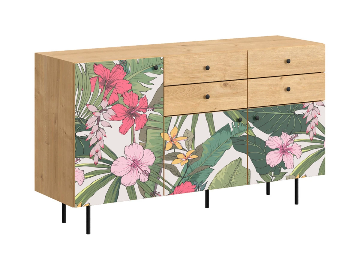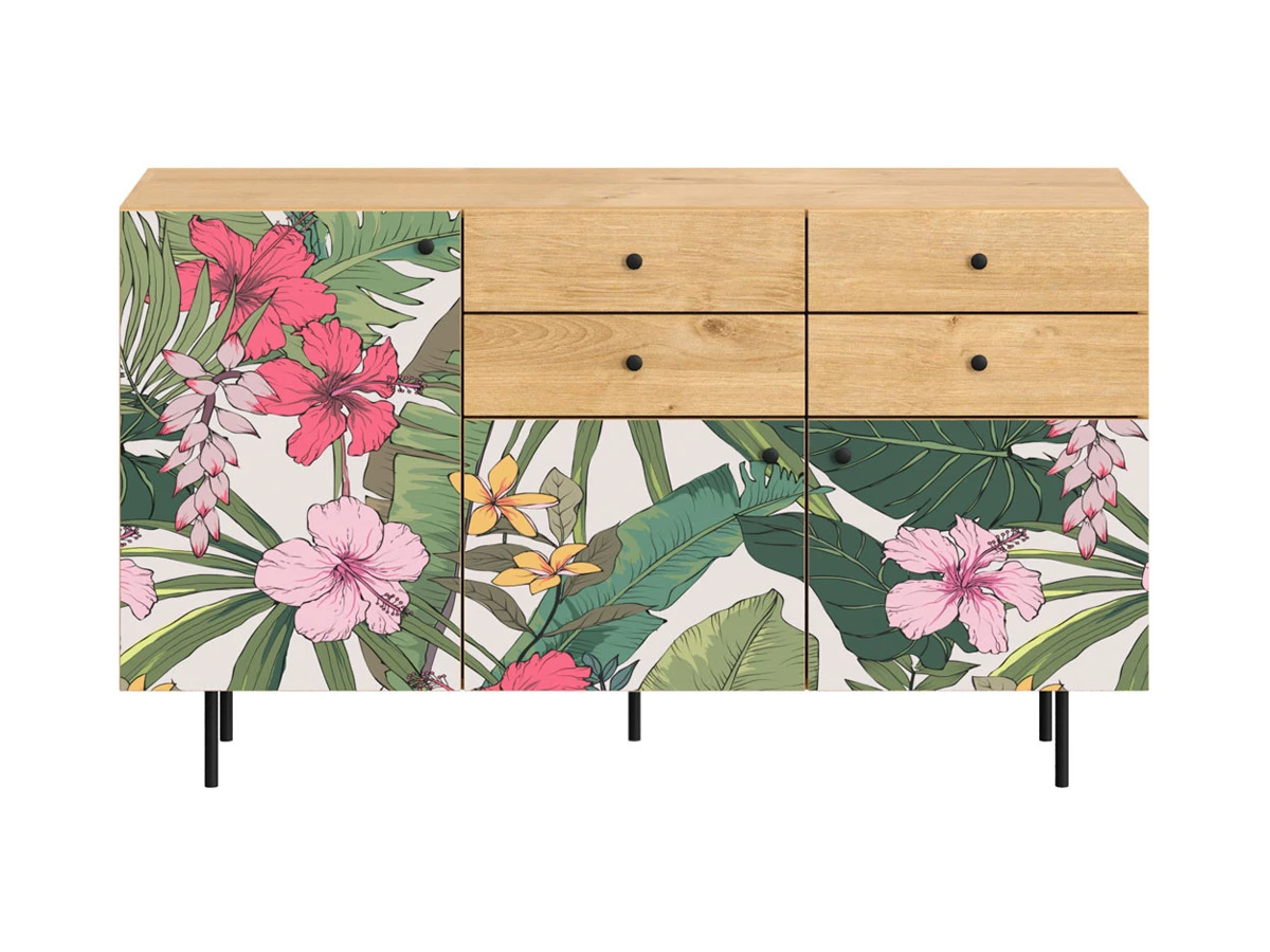 Корпусная мебель, с которой можно составить множество решений для гостиной, детской, кухни, спальни, прихожей, рабочей зоны. Комоды, шкафы, тумбы, столы, витрины, полки, серванты характеризуются универсальностью, многозадачностью, надёжными устойчивыми конструкциями. Имеют выразительный внешний вид, вдохновленный направлением ретро. Смотрятся легко и воздушно за счет деревянных ножек, минимального количества декоративных элементов, спокойных природных оттенков. Их можно использовать в качестве систем хранения, элементов для зонирования, фокусных точек. В дизайне ярко выражена доминанта прямых форм, графичности, лаконичных линий и элегантного исполнения. Что даёт пространству ощущение размеренности, сбалансированности, упорядоченности. Подходят интерьерам как с нейтральной базой, так и локациям с интенсивными цветовыми блоками. Индивидуальности добавят модели с оригинальными паттернами на фасадах. Предметы коллекции Frida гармонично впишутся в эклектичные и стилизованные интерьеры. Ручки входят в стоимость изделия. Высота опор 160 мм. Изображение, нанесенное на фасады, устойчиво к выцветанию, истиранию и влаге. Однако длительное воздействие воды, различных растворителей, спиртосодержащих жидкостей и высоких температур, увеличивают риск повреждения целостности покрытия. Поэтому при использовании необходимо соблюдать ряд правил: 1. Протирайте поверхность с рисунком влажной (но не мокрой) тканью. 2. Используйте мягкие ткани, например, салфетки для стекла или зеркал. 3. Не используйте для обработки поверхности с нанесенным на нее рисунком чистящие порошки и средства, в состав которых входят ацетон, растворитель или спирт. 4. Не используйте металлические губки и щетки с жесткой щетиной. 5. Избегайте ударов, падения, царапания, трения изделий с фотопечатью.