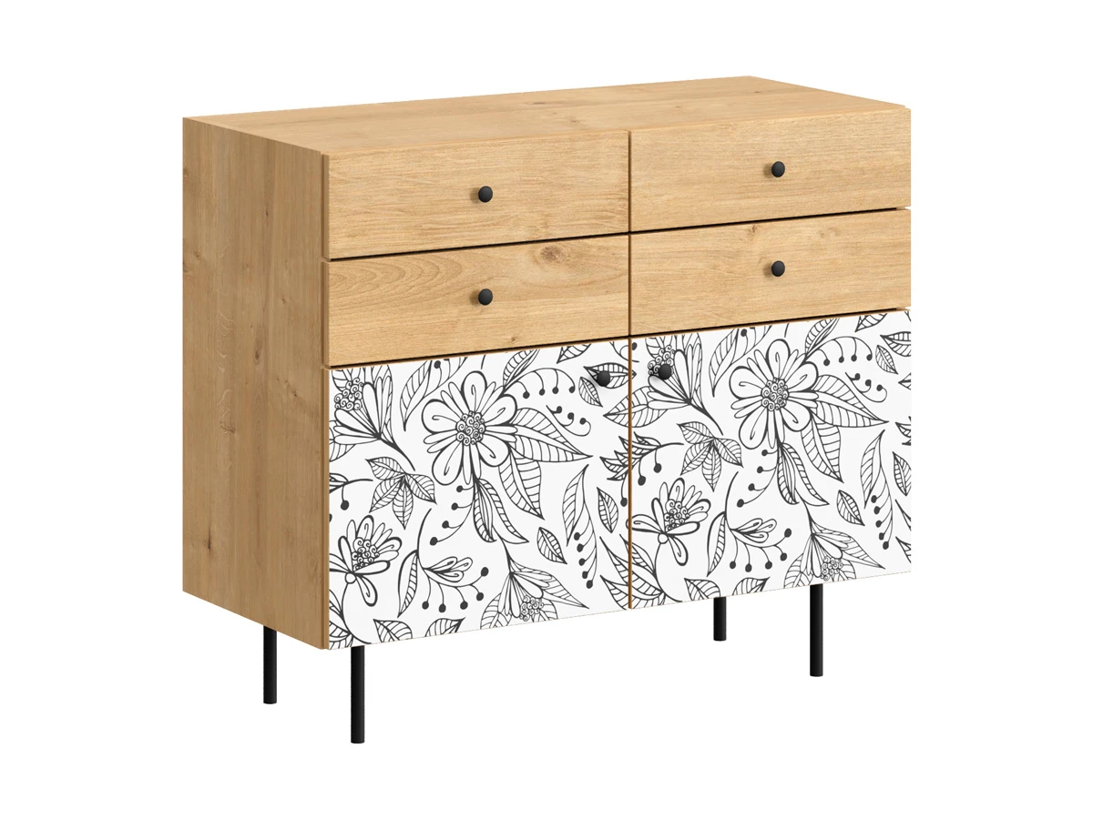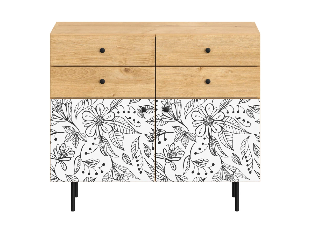 Корпусная мебель, с которой можно составить множество решений для гостиной, детской, кухни, спальни, прихожей, рабочей зоны. Комоды, шкафы, тумбы, столы, витрины, полки, серванты характеризуются универсальностью, многозадачностью, надёжными устойчивыми конструкциями. Имеют выразительный внешний вид, вдохновленный направлением ретро. Смотрятся легко и воздушно за счет деревянных ножек, минимального количества декоративных элементов, спокойных природных оттенков. Их можно использовать в качестве систем хранения, элементов для зонирования, фокусных точек. В дизайне ярко выражена доминанта прямых форм, графичности, лаконичных линий и элегантного исполнения. Что даёт пространству ощущение размеренности, сбалансированности, упорядоченности. Подходят интерьерам как с нейтральной базой, так и локациям с интенсивными цветовыми блоками. Индивидуальности добавят модели с оригинальными паттернами на фасадах. Предметы коллекции Frida гармонично впишутся в эклектичные и стилизованные интерьеры. Ручки входят в стоимость изделия. Высота опор 160 мм. Изображение, нанесенное на фасады, устойчиво к выцветанию, истиранию и влаге. Однако длительное воздействие воды, различных растворителей, спиртосодержащих жидкостей и высоких температур, увеличивают риск повреждения целостности покрытия. Поэтому при использовании необходимо соблюдать ряд правил: 1. Протирайте поверхность с рисунком влажной (но не мокрой) тканью. 2. Используйте мягкие ткани, например, салфетки для стекла или зеркал. 3. Не используйте для обработки поверхности с нанесенным на нее рисунком чистящие порошки и средства, в состав которых входят ацетон, растворитель или спирт. 4. Не используйте металлические губки и щетки с жесткой щетиной. 5. Избегайте ударов, падения, царапания, трения изделий с фотопечатью.