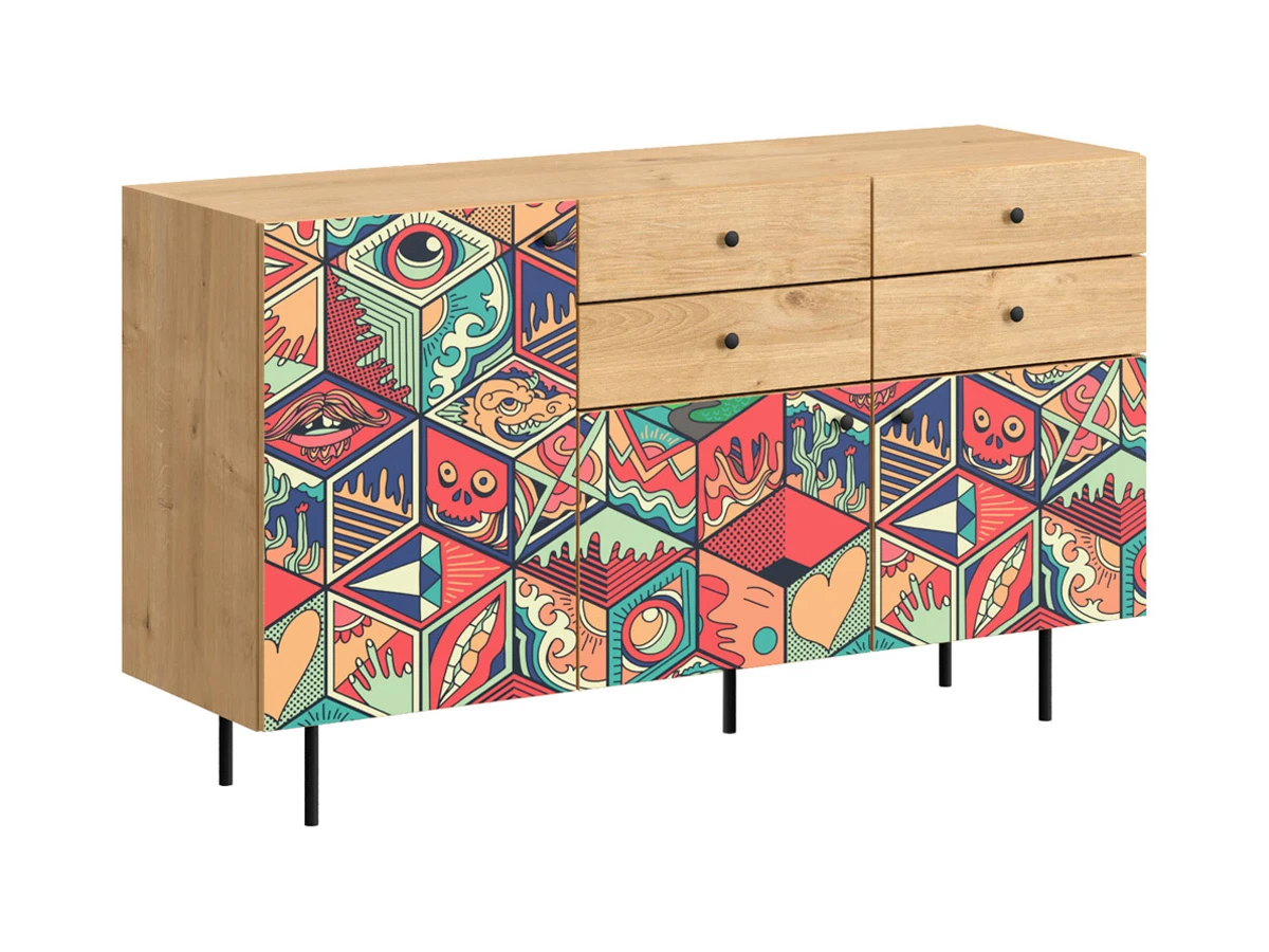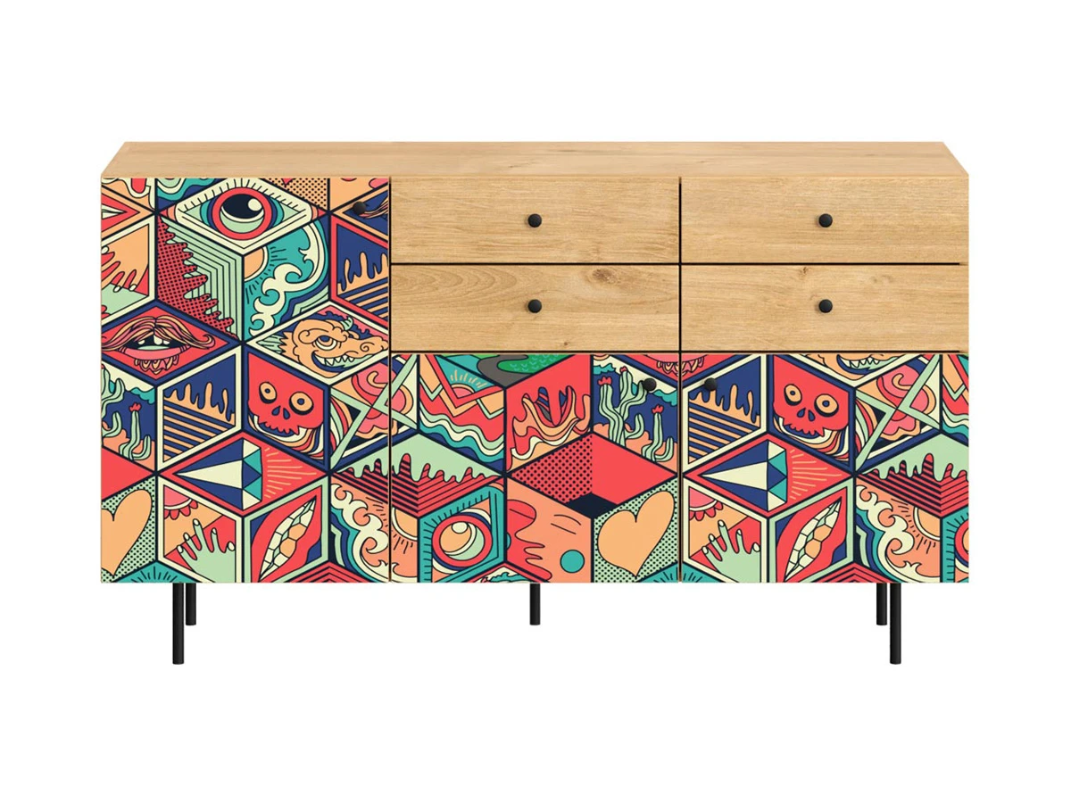 Корпусная мебель, с которой можно составить множество решений для гостиной, детской, кухни, спальни, прихожей, рабочей зоны. Комоды, шкафы, тумбы, столы, витрины, полки, серванты характеризуются универсальностью, многозадачностью, надёжными устойчивыми конструкциями. Имеют выразительный внешний вид, вдохновленный направлением ретро. Смотрятся легко и воздушно за счет деревянных ножек, минимального количества декоративных элементов, спокойных природных оттенков. Их можно использовать в качестве систем хранения, элементов для зонирования, фокусных точек. В дизайне ярко выражена доминанта прямых форм, графичности, лаконичных линий и элегантного исполнения. Что даёт пространству ощущение размеренности, сбалансированности, упорядоченности. Подходят интерьерам как с нейтральной базой, так и локациям с интенсивными цветовыми блоками. Индивидуальности добавят модели с оригинальными паттернами на фасадах. Предметы коллекции Frida гармонично впишутся в эклектичные и стилизованные интерьеры. Ручки входят в стоимость изделия. Высота опор 160 мм. Изображение, нанесенное на фасады, устойчиво к выцветанию, истиранию и влаге. Однако длительное воздействие воды, различных растворителей, спиртосодержащих жидкостей и высоких температур, увеличивают риск повреждения целостности покрытия. Поэтому при использовании необходимо соблюдать ряд правил: 1. Протирайте поверхность с рисунком влажной (но не мокрой) тканью. 2. Используйте мягкие ткани, например, салфетки для стекла или зеркал. 3. Не используйте для обработки поверхности с нанесенным на нее рисунком чистящие порошки и средства, в состав которых входят ацетон, растворитель или спирт. 4. Не используйте металлические губки и щетки с жесткой щетиной. 5. Избегайте ударов, падения, царапания, трения изделий с фотопечатью.