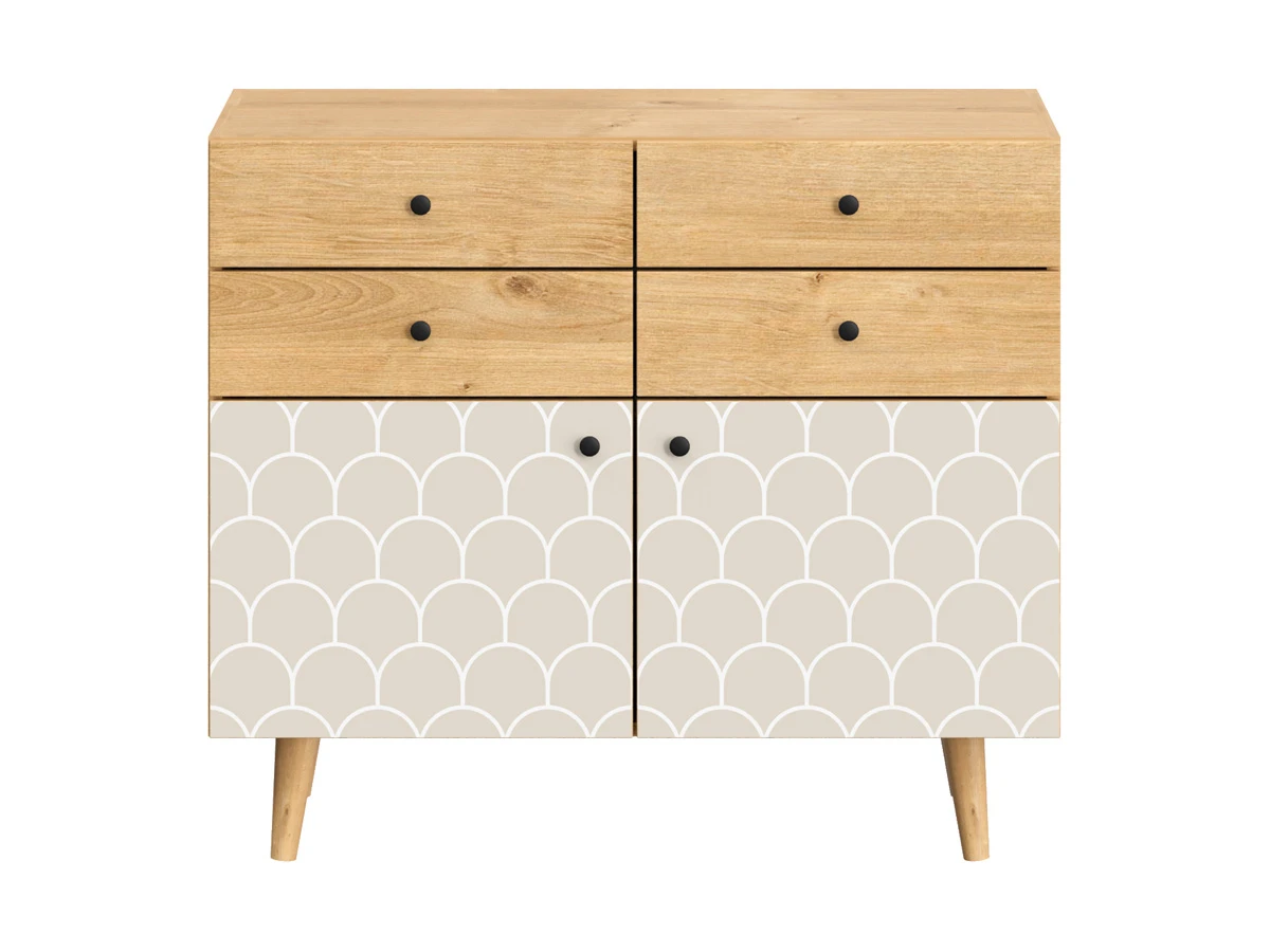 Корпусная мебель, с которой можно составить множество решений для гостиной, детской, кухни, спальни, прихожей, рабочей зоны. Комоды, шкафы, тумбы, столы, витрины, полки, серванты характеризуются универсальностью, многозадачностью, надёжными устойчивыми конструкциями. Имеют выразительный внешний вид, вдохновленный направлением ретро. Смотрятся легко и воздушно за счет деревянных ножек, минимального количества декоративных элементов, спокойных природных оттенков. Их можно использовать в качестве систем хранения, элементов для зонирования, фокусных точек. В дизайне ярко выражена доминанта прямых форм, графичности, лаконичных линий и элегантного исполнения. Что даёт пространству ощущение размеренности, сбалансированности, упорядоченности. Подходят интерьерам как с нейтральной базой, так и локациям с интенсивными цветовыми блоками. Индивидуальности добавят модели с оригинальными паттернами на фасадах. Предметы коллекции Frida гармонично впишутся в эклектичные и стилизованные интерьеры. Ручки входят в стоимость изделия. Высота опор 160 мм. Изображение, нанесенное на фасады, устойчиво к выцветанию, истиранию и влаге. Однако длительное воздействие воды, различных растворителей, спиртосодержащих жидкостей и высоких температур, увеличивают риск повреждения целостности покрытия. Поэтому при использовании необходимо соблюдать ряд правил: 1. Протирайте поверхность с рисунком влажной (но не мокрой) тканью. 2. Используйте мягкие ткани, например, салфетки для стекла или зеркал. 3. Не используйте для обработки поверхности с нанесенным на нее рисунком чистящие порошки и средства, в состав которых входят ацетон, растворитель или спирт. 4. Не используйте металлические губки и щетки с жесткой щетиной. 5. Избегайте ударов, падения, царапания, трения изделий с фотопечатью.