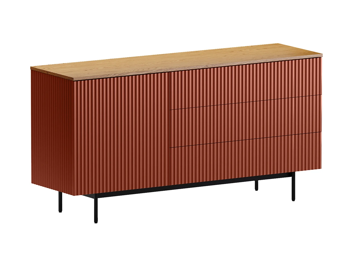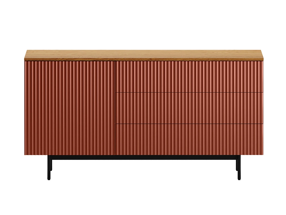 Коллекция Mikko — комплексная система хранения, разработанная для комфортного и актуального интерьера. Вы можете комбинировать различные предметы коллекции или использовать их отдельно. Лаконичный и выразительный внешний вид шкафов, тумб, сервантов, комодов стильно дружит с разными интерьерными решениями. Идея дизайна — баланс индустриального характера и органичных элементов. Мебель сочетает в себе прочное металлическое основание, крышку с дубовым шпоном и рельефный фасад с фрезеровкой. Дверцы и ящики открываются легким нажатием. Отсутствие фурнитуры придает моделям аккуратность и ритмичность. Используйте их для хранения книг, техники в гостиной, одежды и текстиля в спальне, важных мелочей в прихожей, документов и канцелярии в рабочей зоне, декоративных вещей в творческой локации. Можете выбрать цвет крышки: светлый или темный. С мебелью Mikko вы грамотно спрячете лишнее и эстетично экспонируете нужное. Сервант Mikko разделен вертикальной перегородкой на два отделения, левое за распашной дверью, в правом три ящика на скрытых направляющих, дно ящиков из ЛДСтП 16мм. За дверью одна съёмная полка, перестановка полки по высоте не предусмотрена. Фасад и боковые стенки коллекции Mikko с фрезеровкой выполнены из МДФ толщиной 18 мм. в четырех вариантах декоров: Софт Сантьяго, Шарли Терракота, Шарли Грин, Графит. Крышка из МДФ толщиной 16 мм., облицованной строганным шпоном дуба. Остальные детали корпусов выполнены из плиты ламинированной толщиной 16 мм., декор белый гладкий. Лицевая фурнитура отсутствует, открывание фасадов по принципу нажал - открыл. Основания изделий металлические черного цвета с регулируемыми пластиковыми подпятниками.