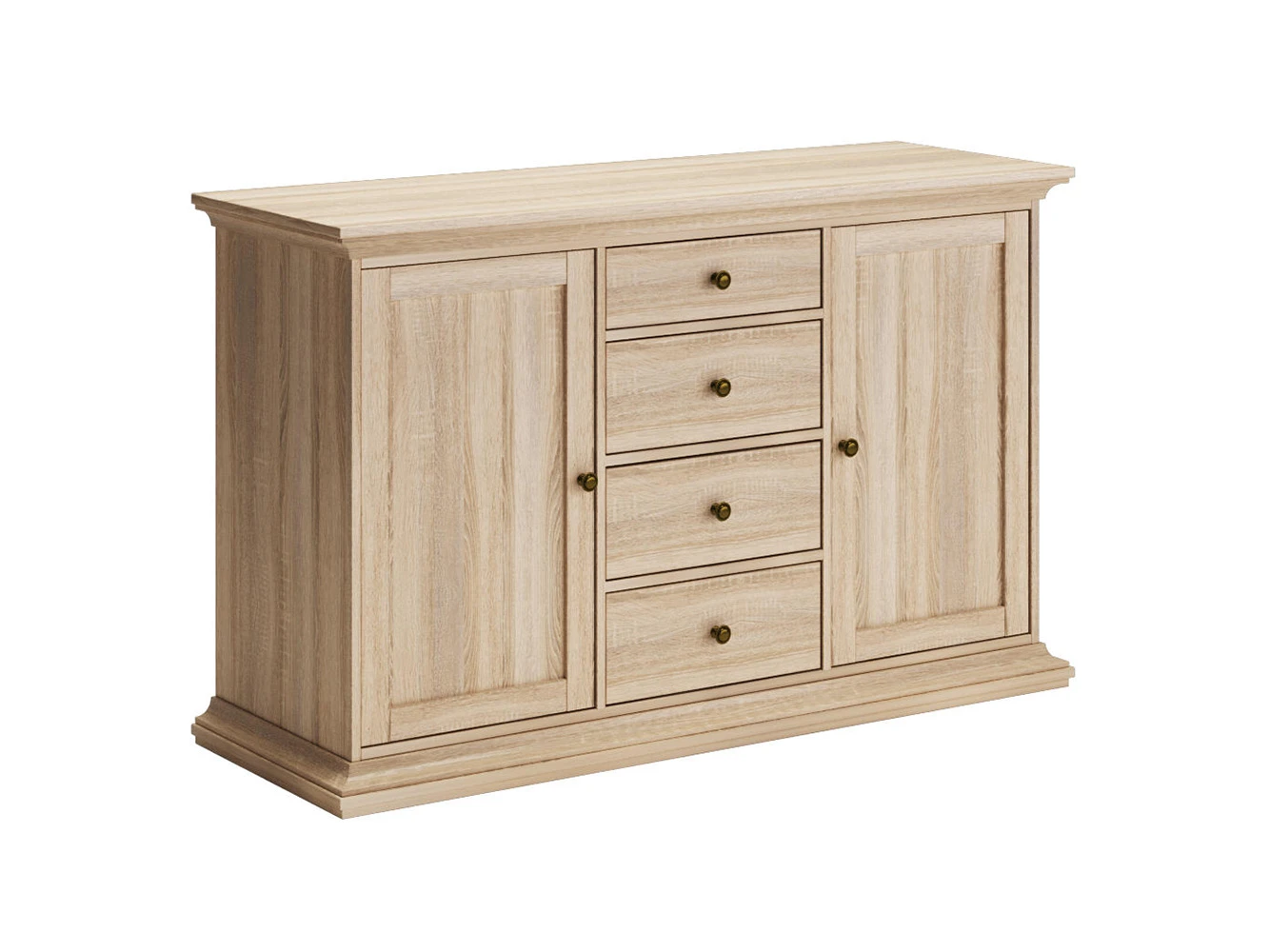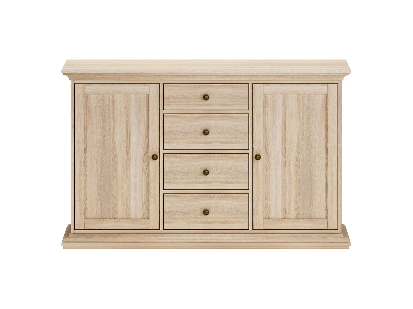 Сервант средний состоит из трех отделений. Левое и правое отделения с распашными дверцами и съемными полками. Среднее отделение имеет четыре выдвижных ящика.
