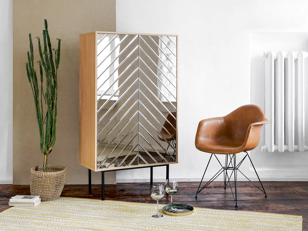 Представляем новую коллекцию мебели для Вашего дома - Boho. Это 6 предметов, созданных в едином стиле, которые прекрасно сочетаются между собой и дополняют друг друга. Разные по размеру и функционалу, вместе они сделают пространство гостиной гармоничным и продуманным. Возможность выбрать фасады - ротанг или зеркало - увеличивает количество возможных сочетаний. Корпуса изделий изготовлены из ЛДСП 16 мм. В декоре - Дуб Корбридж. Кромки т. 0,4 мм. Задние стенки ДВПО 3,2 мм черного цвета. Корпуса установлены на металлические основания - смотрятся легко и элегантно. К тому такое решение упрощает уборку. Основание из трубы 20х20 мм, окрашено в черный цвет. Высота основания - 270 мм, установлено на пластиковые подпятники, что бережет покрытие пола от механических повреждений. Регулировки по высоте нет. Двери вкладные, открываются при нажатии. Предусмотрены два варианта фасадов: 1. Зеркальный: ЛДСП 16мм в декорах, соответствующих корпусам, с наклеенным зеркалом, цветным зеркалом или цветным стеклом в «ёлочку». На дверях кромка шириной 2 мм. черного цвета. 2. Ротанг: рамка из алюминиевого профиля 20х19 мм черного цвета с вставкой из ротанга. Подложкой для ротанга служит прозрачное стекло толщиной 4 мм. Шкаф - высокий - 1498 мм соответственно, вместительный, но очень аккуратный с виду. Распашные двери - простой и надёжный механизм открывания. Фасады вы можете выбрать сами - корпус изготовлен таким образом, что подходит и для зеркального варианта и для фасада из ротанга. Глубина шкафа 400 мм. Ширина - 840 мм. Высота опор 27 см.
