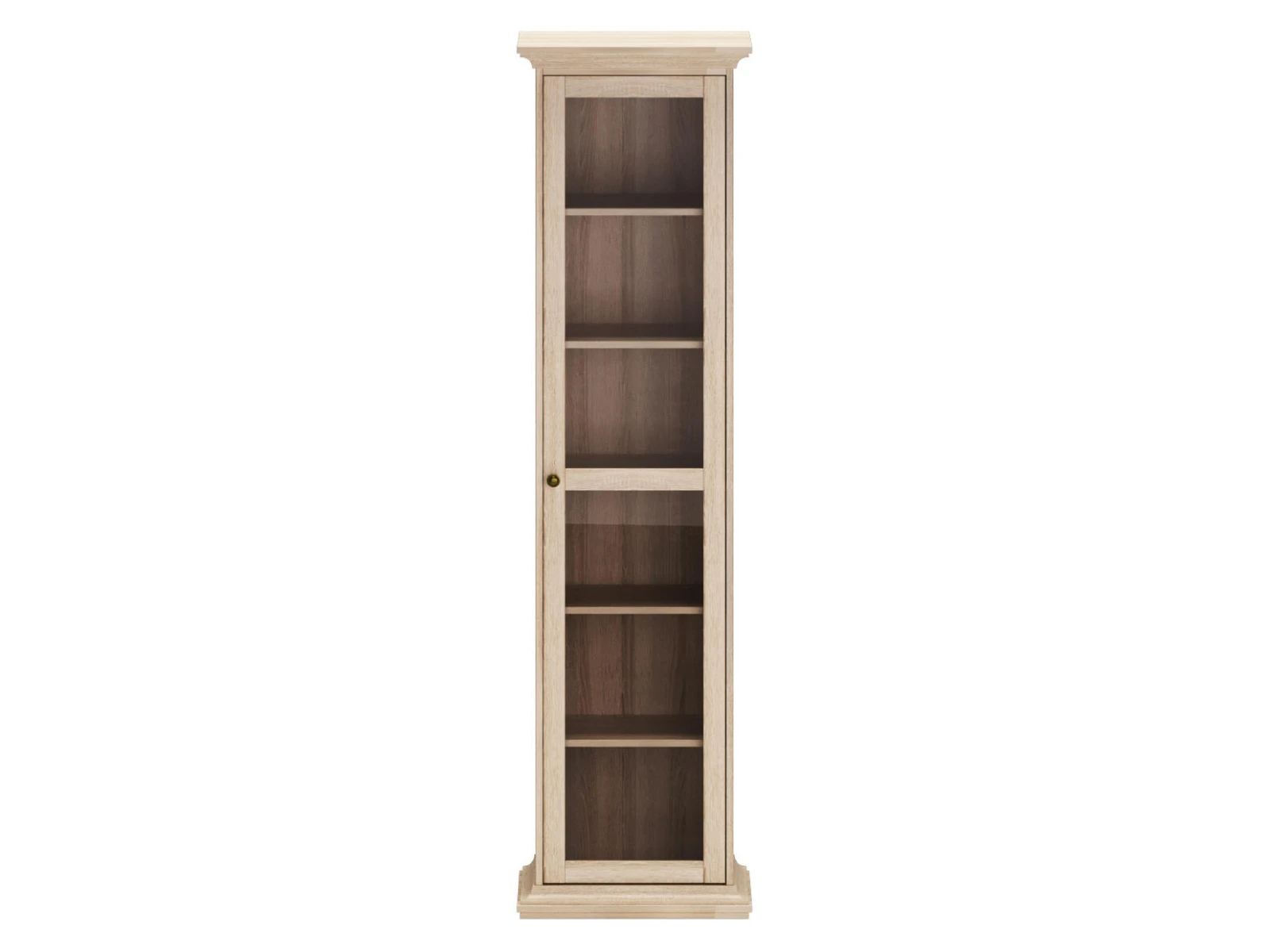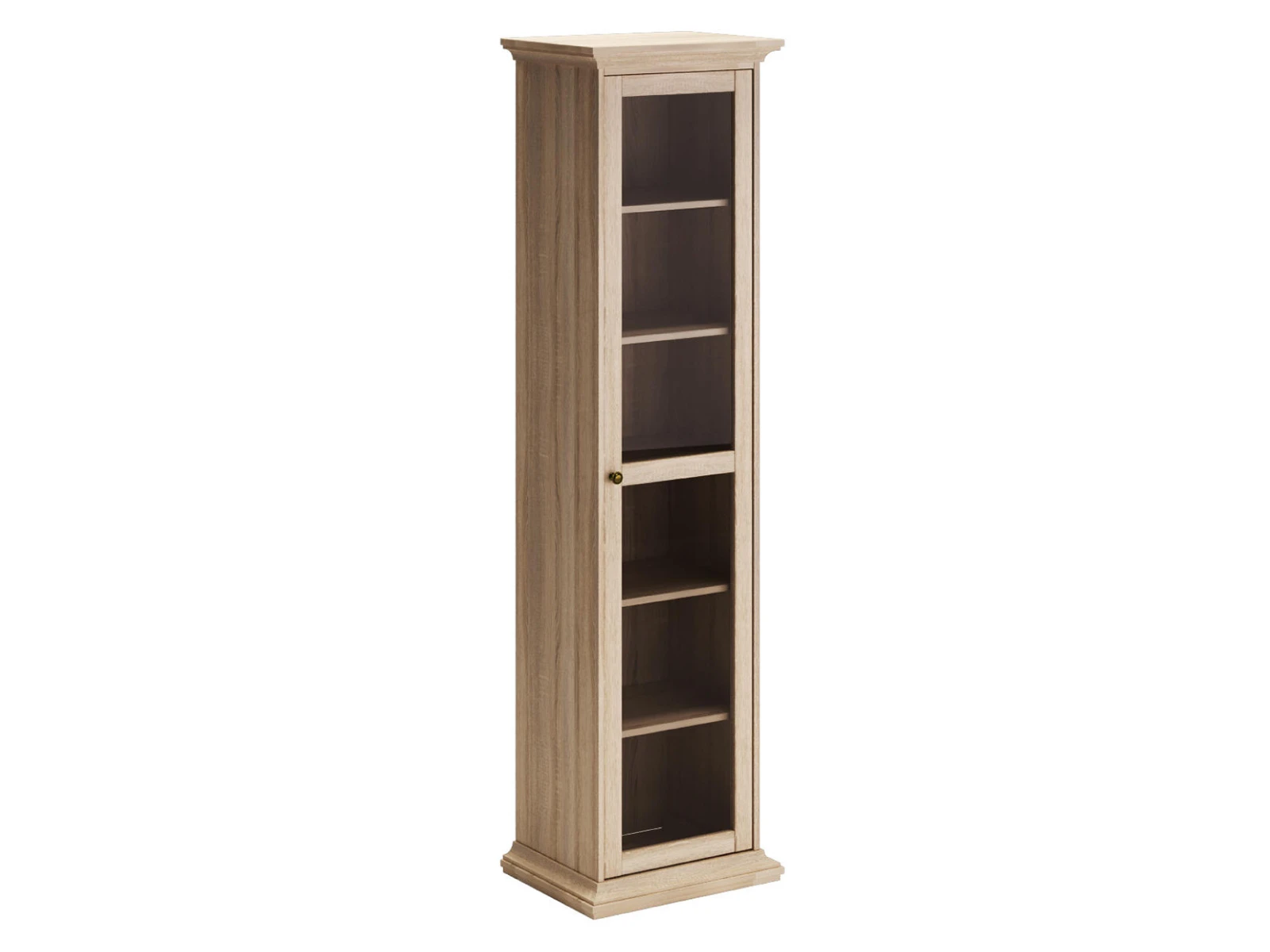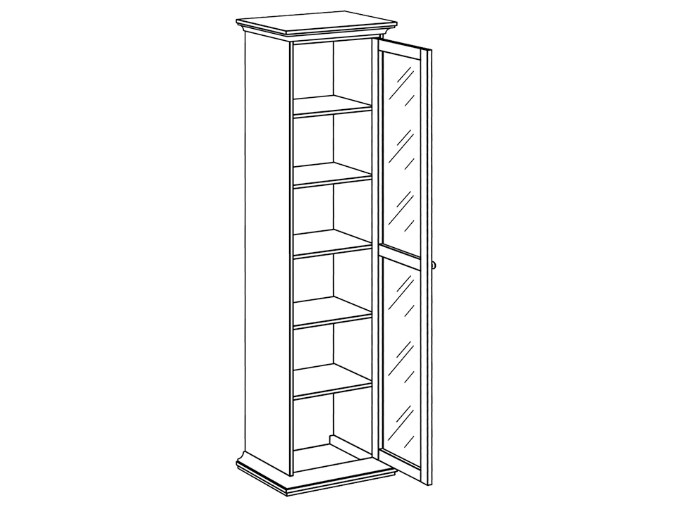 Шкаф-пенал состоит из одного отделения за распашной дверцей. Дверца стеклянная. Внутри расположена одна стационарная полка и четыре съемные полки.