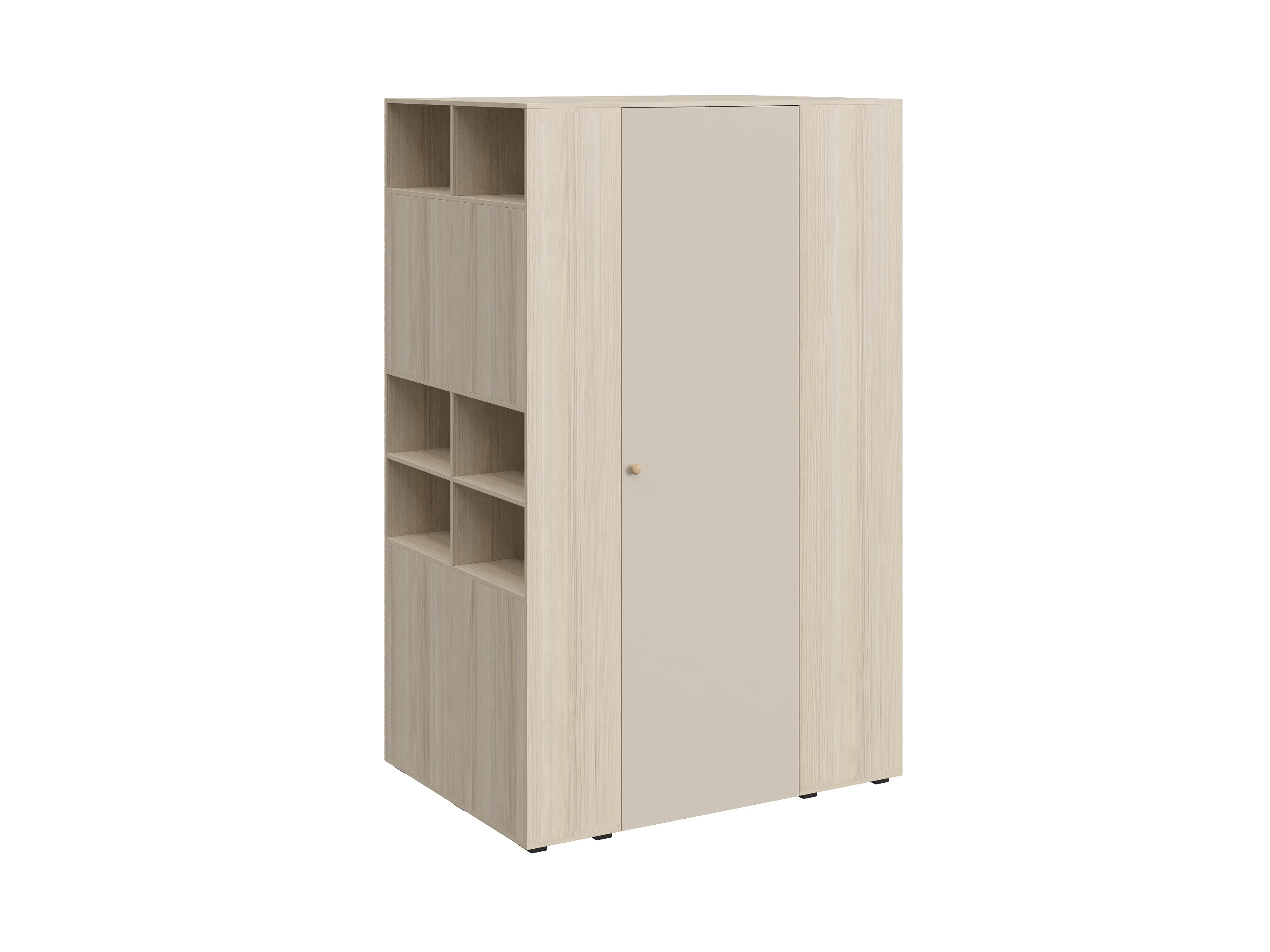 Play — коллекция модульной мебели для детской в спокойных оттенках светлого дерева с локальным добавлением ярких элементов. Естественные формы и цвета подружатся с любой стилевой темой. Подойдет как для дошкольников, так и для подростков. Изделия отвечают главным критериям детской мебели: безопасны, устойчивы, надёжны и эстетичны. Соблюдены экологические показатели, использована ЛДСП класса эмиссии Е1 и Е0,5 — для детской мебели с герметично закрытыми кромками. Из большого количества модулей вы можете спроектировать индивидуальное решение, исходя из потребностей и площади помещения. Для игровой локации, учебного места, спальной зоны, гардероба, хранения игрушек, техники и предметов для творчества — используйте модульные шкафы, стеллажи, тумбы, кровати-чердаки, столы, стеллажи-лестницы. Сквозные стеллажи идеальны в качестве перегородок в детской. Они пропускают свет, не перегружают площадь, позволяют использовать разные декоративные приёмы. Двухярусные кровати и «чердаки» удобно использовать в компактной локации. Шкафы напольные, навесные, тумбы, лаконичные столы — мебель Play поддержит атмосферу порядка и идеальный настрой на учёбу, творчество, поможет развить самостоятельность и аккуратность. Белые фасады отражают свет, освежают интерьер. С коллекцией Play вы легко создадите организованное и креативное пространство, в котором у каждой вещи есть своё место, и где ребенку комфортно учиться, играть, отдыхать, творить. Шкаф-гардероб представляет собой многоцелевой шкаф для хранения одежды, обуви, книг, аксессуаров и других вещей. С торца расположены открытые полки, в нижней части находится панель для примыкания кровати или стола. Во внутреннем отделении шкафа располагаются отделения с полками и штанга. Может быть выполнен как в левом, так и в правом исполнении. Комбинируется с кроватью-чердаком. Шкаф оснащен светодиодным светильником с датчиком движения. Ручки в стоимость изделия не включены, приобретаются отдельно.