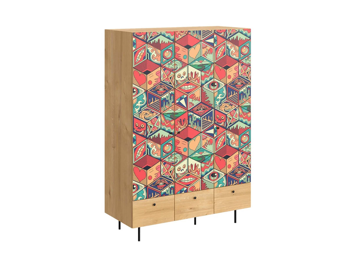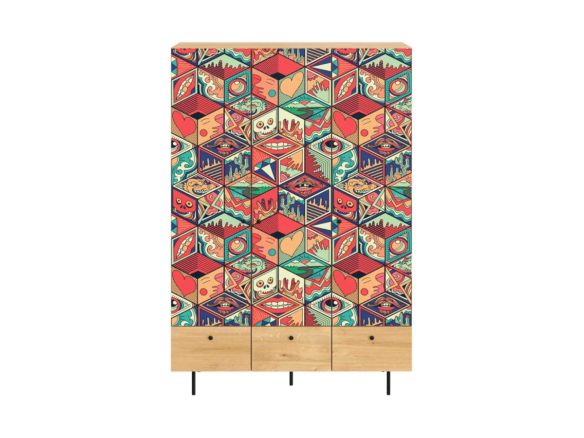 Корпусная мебель, с которой можно составить множество решений для гостиной, детской, кухни, спальни, прихожей, рабочей зоны. Комоды, шкафы, тумбы, столы, витрины, полки, серванты характеризуются универсальностью, многозадачностью, надёжными устойчивыми конструкциями. Имеют выразительный внешний вид, вдохновленный направлением ретро. Смотрятся легко и воздушно за счет деревянных ножек, минимального количества декоративных элементов, спокойных природных оттенков. Их можно использовать в качестве систем хранения, элементов для зонирования, фокусных точек. В дизайне ярко выражена доминанта прямых форм, графичности, лаконичных линий и элегантного исполнения. Что даёт пространству ощущение размеренности, сбалансированности, упорядоченности. Подходят интерьерам как с нейтральной базой, так и локациям с интенсивными цветовыми блоками. Индивидуальности добавят модели с оригинальными паттернами на фасадах. Предметы коллекции Frida гармонично впишутся в эклектичные и стилизованные интерьеры. Ручки входят в стоимость изделия. Высота опор 160 мм. Изображение, нанесенное на фасады, устойчиво к выцветанию, истиранию и влаге. Однако длительное воздействие воды, различных растворителей, спиртосодержащих жидкостей и высоких температур, увеличивают риск повреждения целостности покрытия. Поэтому при использовании необходимо соблюдать ряд правил: 1. Протирайте поверхность с рисунком влажной (но не мокрой) тканью. 2. Используйте мягкие ткани, например, салфетки для стекла или зеркал. 3. Не используйте для обработки поверхности с нанесенным на нее рисунком чистящие порошки и средства, в состав которых входят ацетон, растворитель или спирт. 4. Не используйте металлические губки и щетки с жесткой щетиной. 5. Избегайте ударов, падения, царапания, трения изделий с фотопечатью.