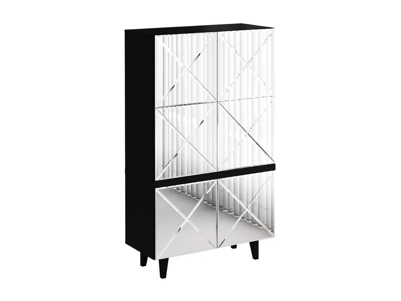 Коллекция дизайнерской корпусной мебели с глянцевыми и зеркальными фасадами в черно-белых цветах. Мебель выглядит эстетически строгой, легкой и четкой. Но при этом оригинальной и колоритной. В интерьере она создаст атмосферу порядка, элегантности, организованности. Геометрическая декоративная гравировка, отражающие фасады расширяют пространство, воплощают эффект простоты и неординарности. Важно, что шкафы, тумбы, комоды — универсальны и подходят для гостиной, спальни, кабинета, прихожей. Все изделия работают бесшумно, комплектуются итальянской и немецкой фурнитурой. Открытие по принципу «нажал-открыл», отсутствие ручек на фасадах и лишних деталей отвечает за визуальную тишину. Kristal нейтрализует повседневность, создаёт праздник в интерьере. Уместит и спрячет ваши вещи. Идеально впишется в комнаты небольших размеров, квартиры-студии с несколькими зонами в одном пространстве. Поддержит баланс порядка и красоты. Имеет вариативную стилизацию, подойдет как интерьерам спокойной классической направленности, так и небанальным дизайнерским решениям. Шкаф комбинированный для гостиной. Дверцы открываются по принципу «нажал - открыл».