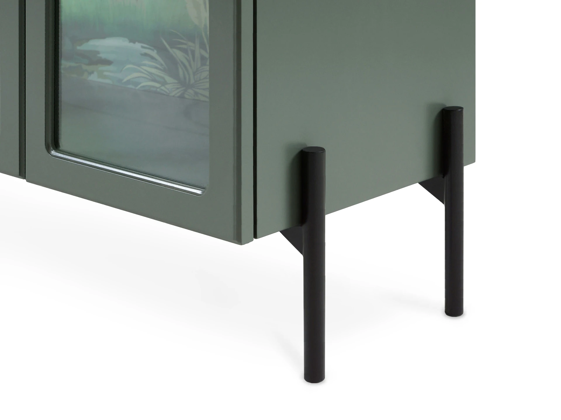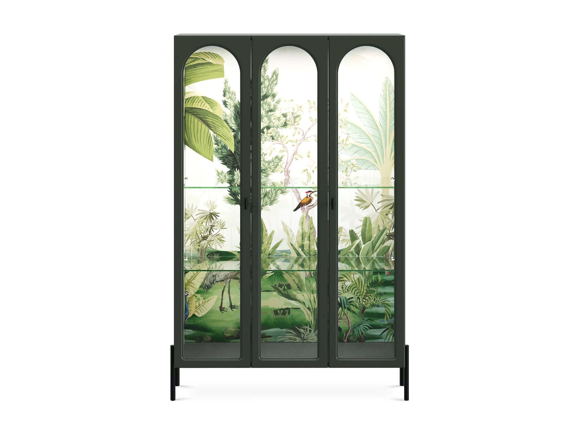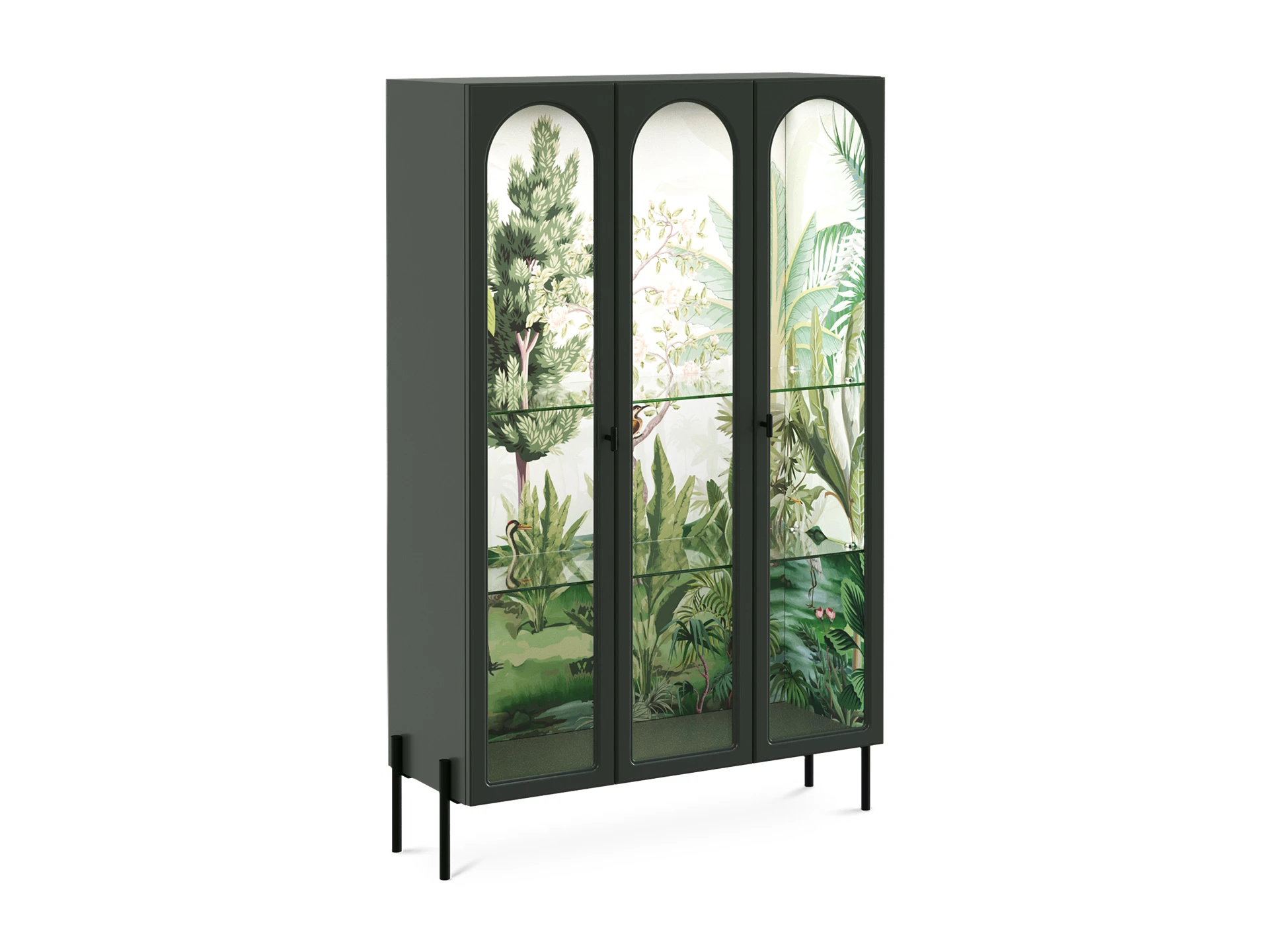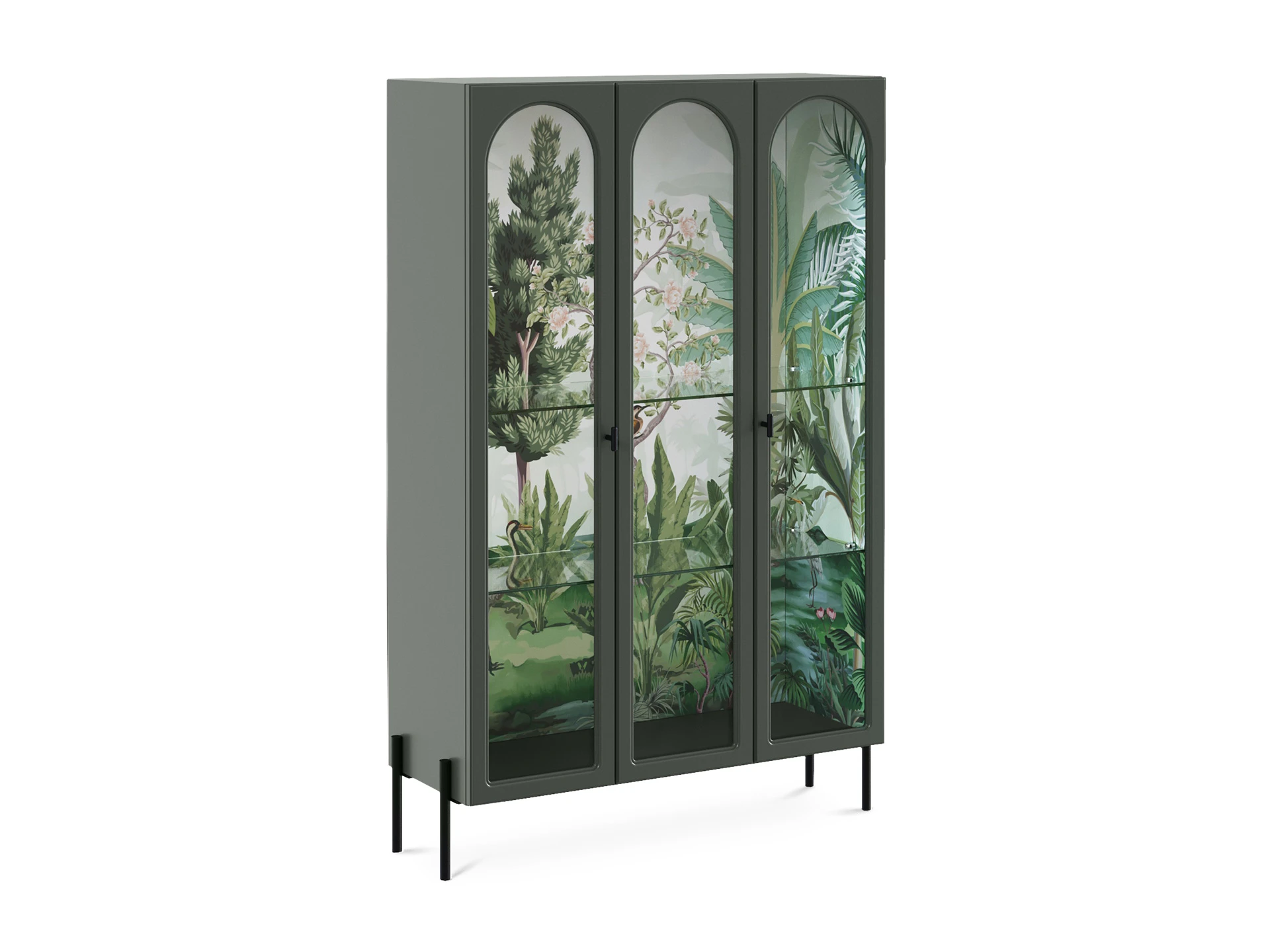 Banksy — коллекция оригинальных шкафов-витрин и сервантов с художественными акцентами. В основе дизайна — дань классическим формам и стремление к актуальным тенденциям. Внушительный корпус балансирует на изящных ножках из металла. Что делает габаритные формы визуально легкими. Также за воздушность отвечают дверцы и полки из стекла. Вместе с внутренней подсветкой они обеспечивают «выставочное» хранение книг, посуды, косметики, декора и других предметов. Изображения в духе шинуазри являются колоритными элементами интерьера. Они моментально притягивают взгляд и становятся фокусной точкой, привнося в пространство разнообразие, таинственность, дух приключений. С помощью Banksy вы поддержите комфорт и индивидуальность как домашних локаций: гостиной, спальни, гардеробной, обеденной группы, так и бизнес-пространств: кафе, студий, салонов, шоурумов. Витрина с тремя фасадами, из них два крайних – распашные, центральный – стационарный – не открывается. Рамка фасадов выполнена в виде арки. Количество полок – 2 шт. Все детали изделия, за исключением задней стенки, выполнены из МДФ толщиной 19 мм и окрашены полиуретановой эмалью. Задняя стенка изготовлена из ЛДСтП толщиной 16 мм. На внутренние вертикальные поверхности – боковые стенки и задняя стенка – нанесен рисунок. Двери рамочные с филенкой из прозрачного стекла. Двери установлены на скрытые петли с плавным закрыванием. Петли и ручки-кнопки черного цвета. Внутри полки из стекла толщиной 6 мм. Перестановка полок по высоте не предусмотрена. В верхний щит установлена подсветка - светодиодная лента в профиле. Лента имеет три цвета свечения: теплый, холодный, нейтральный. Подсветка снабжена контроллером с пультом и блоком питания. Изделия установлены на декоративные металлические опоры черного цвета высотой 150 мм. Опоры не регулируются. Изделия рекомендуется крепить к стене для защиты от опрокидывания. Необходимый крепёж в комплекте.