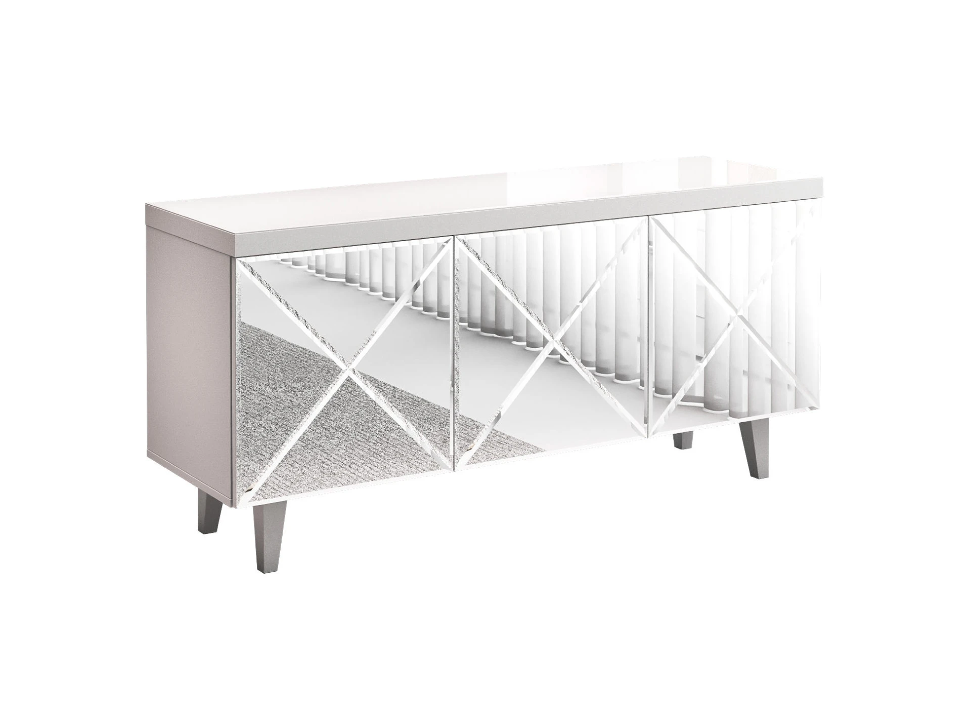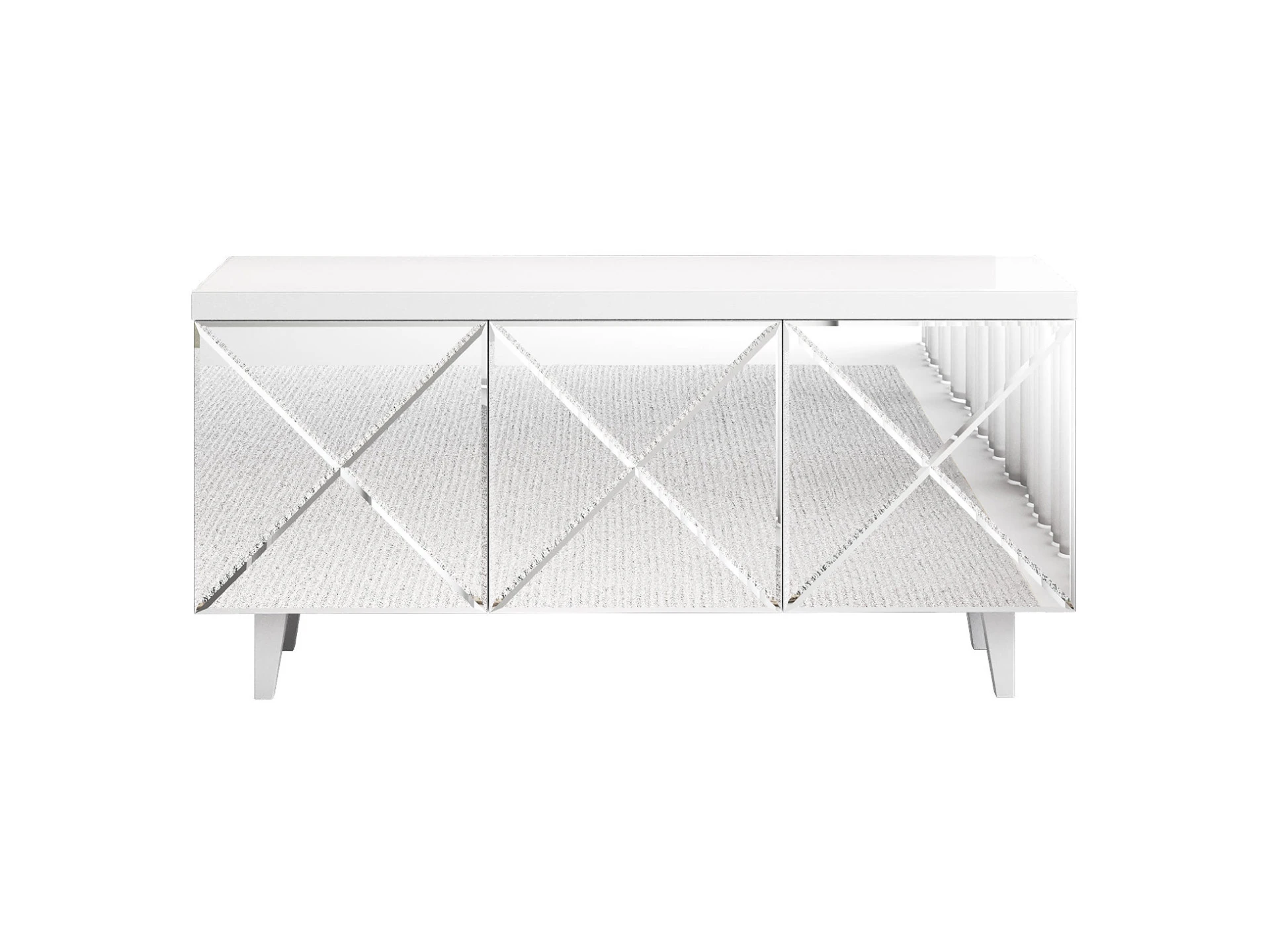 Коллекция дизайнерской корпусной мебели с глянцевыми и зеркальными фасадами в черно-белых цветах. Мебель выглядит эстетически строгой, легкой и четкой. Но при этом оригинальной и колоритной. В интерьере она создаст атмосферу порядка, элегантности, организованности. Геометрическая декоративная гравировка, отражающие фасады расширяют пространство, воплощают эффект простоты и неординарности. Важно, что шкафы, тумбы, комоды — универсальны и подходят для гостиной, спальни, кабинета, прихожей. Все изделия работают бесшумно, комплектуются итальянской и немецкой фурнитурой. Открытие по принципу «нажал-открыл», отсутствие ручек на фасадах и лишних деталей отвечает за визуальную тишину. Kristal нейтрализует повседневность, создаёт праздник в интерьере. Уместит и спрячет ваши вещи. Идеально впишется в комнаты небольших размеров, квартиры-студии с несколькими зонами в одном пространстве. Поддержит баланс порядка и красоты. Имеет вариативную стилизацию, подойдет как интерьерам спокойной классической направленности, так и небанальным дизайнерским решениям. Тумба для гостиной. Дверцы открываются по принципу «нажал - открыл».