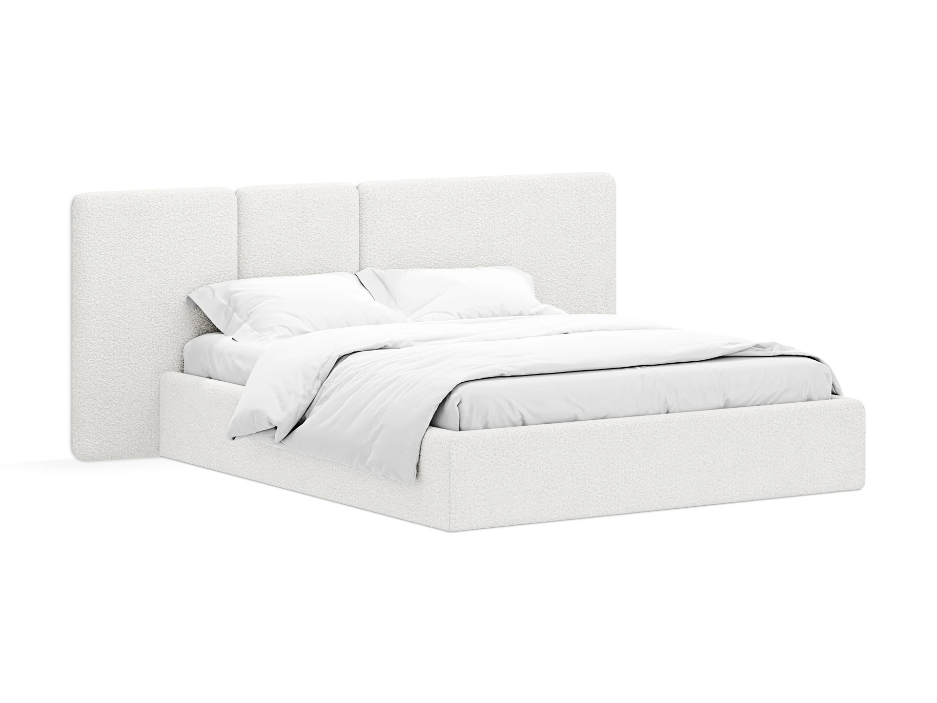 Кровать Atessa — модель с акцентной геометрией и мягкими панелями в изголовье. Широкое настенное изголовье состоит из отдельных модулей, что позволяет комбинировать оттенки обивки для создания уникальных цветовых решений. Мягкая обшивка царг обеспечивает тактильный комфорт по периметру спального места. Конструктив и материалы: • Каркас и основание: Корпус кровати — царги из ЛДСтП 22 мм. В основании установлены пластиковые опоры высотой 49 мм. • Изголовье: Мягкие настенные панели. Внутренний каркас панелей — березовая фанера. • Обивка: Панели изголовья: чехол несъемный. Царги: чехол съемный. • Опции: Доступна комплектация с подъемным механизмом или без него (стационарное основание). Функциональность: Модель рассчитана на стандартное спальное место 1600х2000 мм. Мягкое изголовье обеспечивает комфорт при отдыхе сидя (чтение, просмотр видео). Благодаря модульной структуре панелей кровать легко адаптируется под геометрию стены и интерьер, выступая центральным элементом спальни. Подходит для современных жилых пространств.