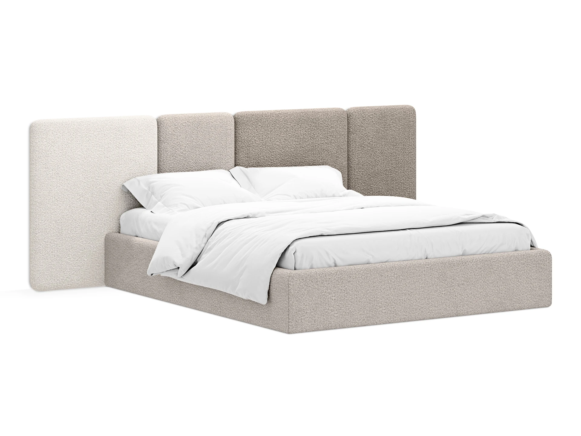 Кровать Atessa — модель с акцентной геометрией и мягкими панелями в изголовье. Широкое настенное изголовье состоит из отдельных модулей, что позволяет комбинировать оттенки обивки для создания уникальных цветовых решений. Мягкая обшивка царг обеспечивает тактильный комфорт по периметру спального места. Конструктив и материалы: • Каркас и основание: Корпус кровати — царги из ЛДСтП 22 мм. В основании установлены пластиковые опоры высотой 49 мм. • Изголовье: Мягкие настенные панели. Внутренний каркас панелей — березовая фанера. • Обивка: Панели изголовья: чехол несъемный. Царги: чехол съемный. • Опции: Доступна комплектация с подъемным механизмом или без него (стационарное основание). Функциональность: Модель рассчитана на стандартное спальное место 1600х2000 мм. Мягкое изголовье обеспечивает комфорт при отдыхе сидя (чтение, просмотр видео). Благодаря модульной структуре панелей кровать легко адаптируется под геометрию стены и интерьер, выступая центральным элементом спальни. Подходит для современных жилых пространств.