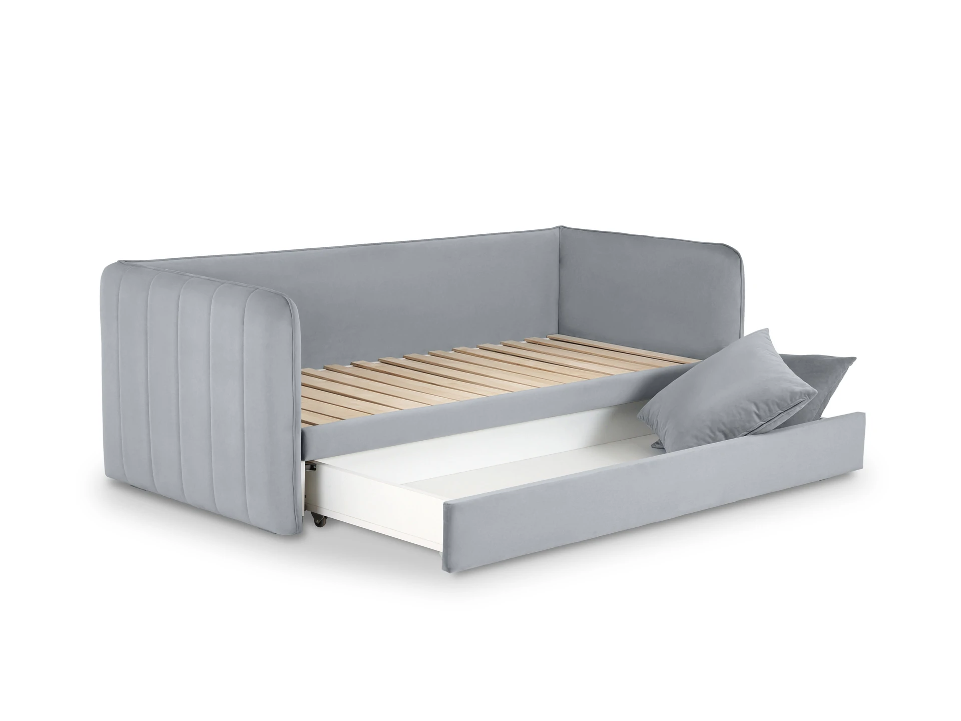 Todi — функциональная кушетка-кровать с двумя опциональными модулями. В собранном виде — это компактный диван, а в разложенном — спальное место размером 2000х1590х100 мм. Механизм трансформации — выкатной: при раскладывании достаточно выкатить вспомогательную секцию из-под сиденья и установить на нее блок ламелей. Конструкция проста и надежна для ежедневного использования. Также есть второй выкатной модуль, который можно использовать в качестве емкости для хранения или дополнительного спального места. Кушетка Todi — идеальный выбор для пространств средних и компактных размеров. Она гармонично впишется в гостиную, детскую, спальню, кухню. Каркас из деревянного бруса, в основе — породы хвойных: ель и сосна, влагостойкая березовая фанера. Мебель из этих материалов экологична, надежна и долговечна. В дизайне сделана ставка на лаконичность и универсальность. Мягкая высокая спинка и подлокотники находятся на одном уровне и имеют одинаковую толщину, что создаёт чувство уединения, безопасности. Пышные декоратиные подушки спинки подчеркивают комфорт, уют, позволяют максимально расслабить корпус. Рельефности добавляет спокойный декор в виде вертикальных линий строчки на боковинах и канта, который проходит по всему периметру изделия. Что придает ему целостный и завершенный вид. Благодаря ненавязчивому экстерьеру эта модель подружится с любым интерьерным стилем, главное — подобрать нужный цвет обивки. Todi — современная мебель с широким практическим спектром и безупречным исполнением. Кушетка установлена на пластмассовые опоры, высотой 20 мм. Имеют регулировку по высоте. Максимальная нагрузка на дно выдвижной секции - 100 кг, при условии ее равномерного распределения по площади основания (грузоподъемность в 100 кг регламентируется колесными опорами – 6 шт. по 25 кг на опору.). При использовании кушетки «Todi», в качестве раскладной 2-х спальной кровати, рекомендуется применять матрас раскладной конструкции, состоящий из двух частей. Размеры матраса в сложенном виде 2000 х 800 х 200 мм. Размеры матраса в разложенном виде 2000 х 1590 х 100 мм. Секция выкатная может использоваться как емкость для хранения, так и для организации спального места с матрасом размером 1800 х700 мм и высотой не более 140 мм. Матрасы покупаются отдельно. Кушетку можно приобрести без подушек. Цена указана со стоимостью подушек.