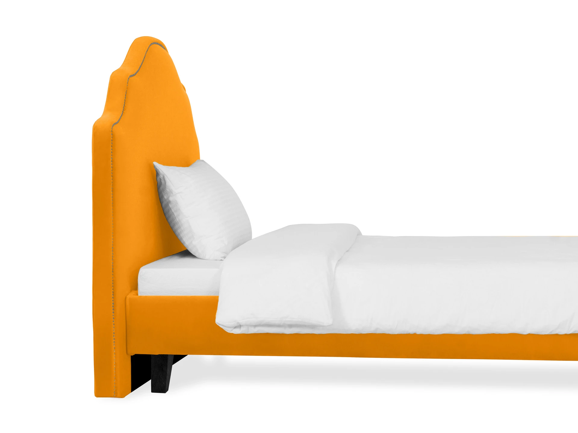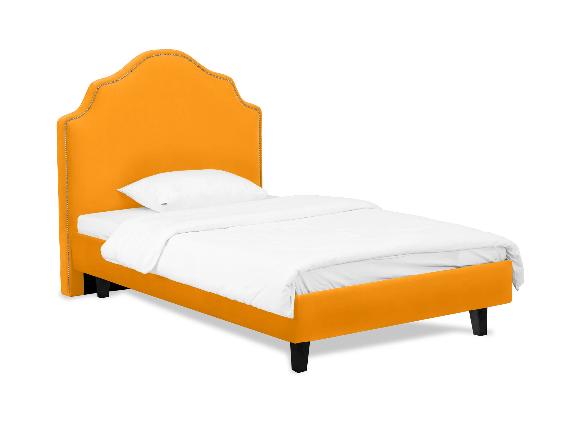 Кровать односпальная. Спинка кровати декорирована молдингом, установлена на пластмассовые опоры. Основание установлено на ножки из массива дерева и обрамлено мягкими царгами. Размер спального места: 1200х2000 мм.