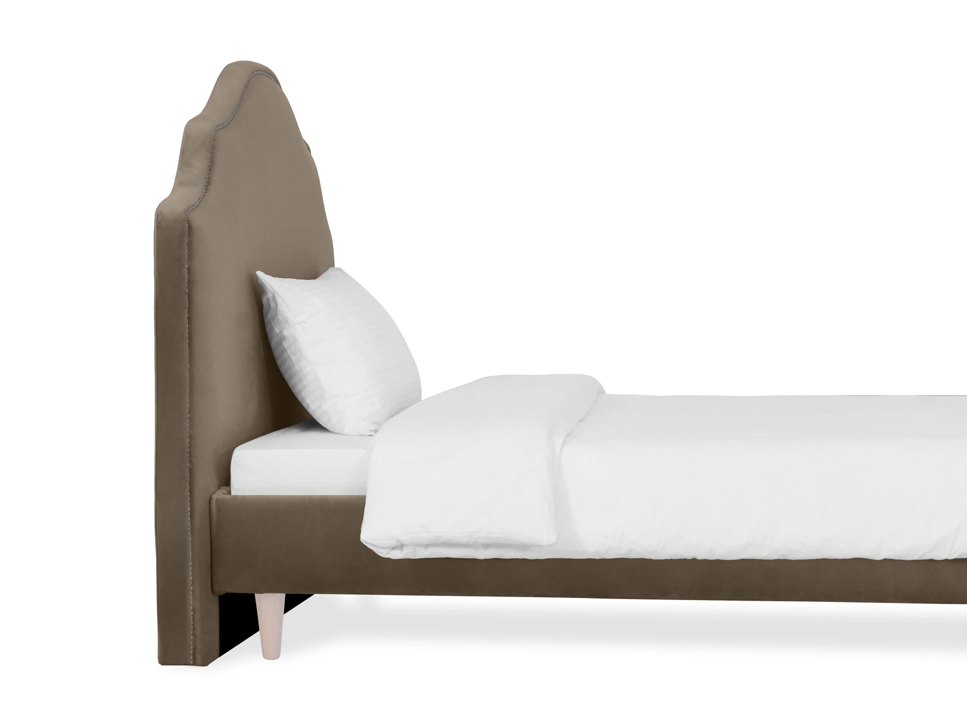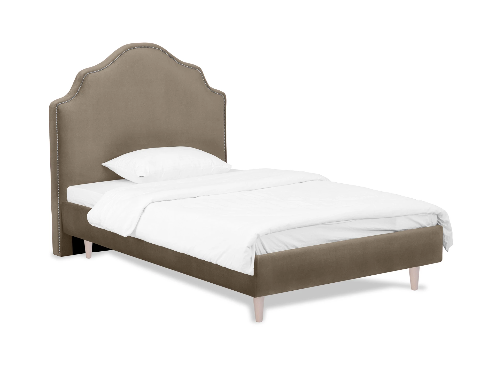 Кровать односпальная. Спинка кровати декорирована молдингом, установлена на пластмассовые опоры. Основание установлено на ножки из массива дерева и обрамлено мягкими царгами. Размер спального места: 1200х2000 мм.