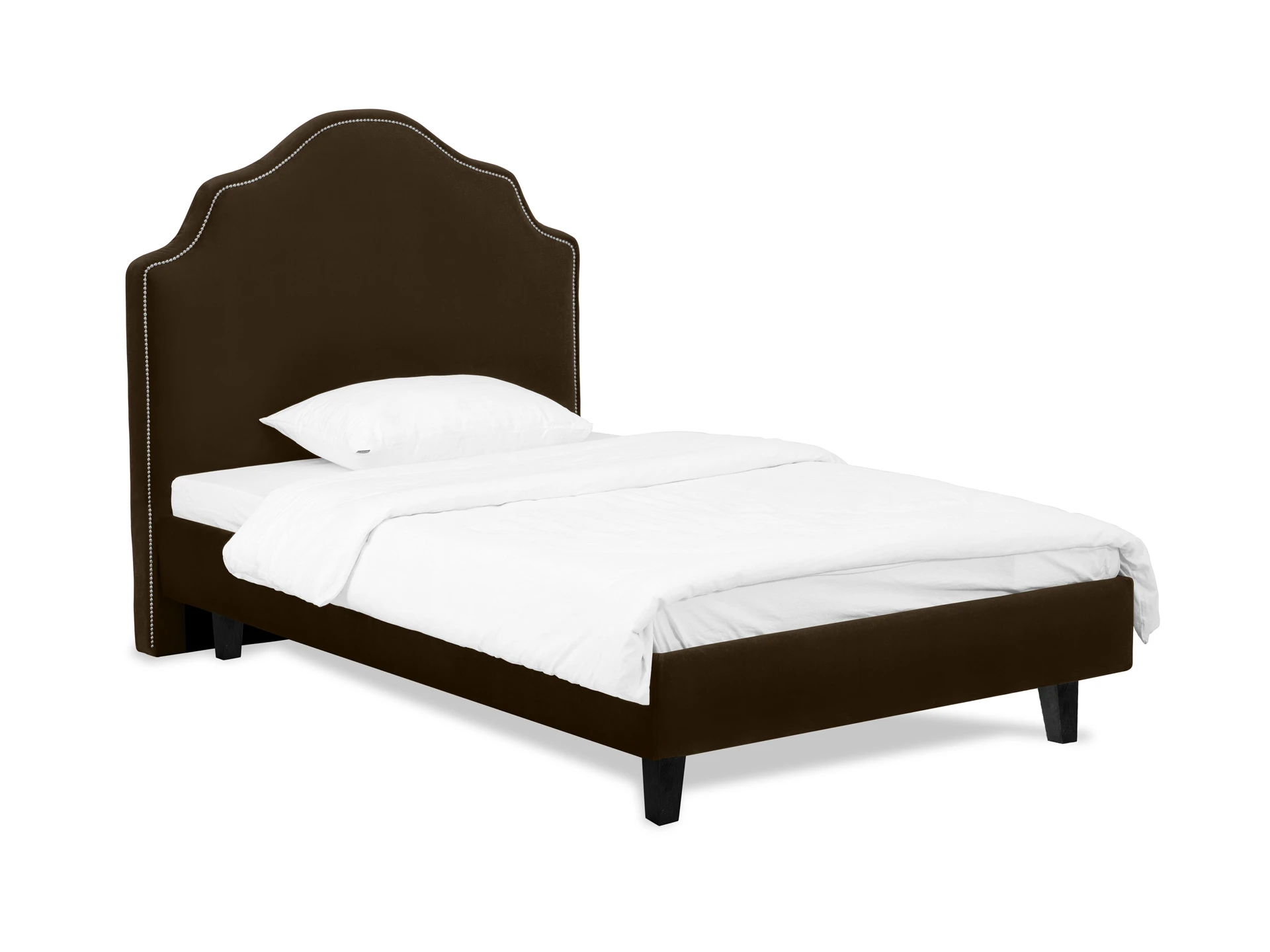 Кровать односпальная. Спинка кровати декорирована молдингом, установлена на пластмассовые опоры. Основание установлено на ножки из массива дерева и обрамлено мягкими царгами. Размер спального места: 1200х2000 мм.